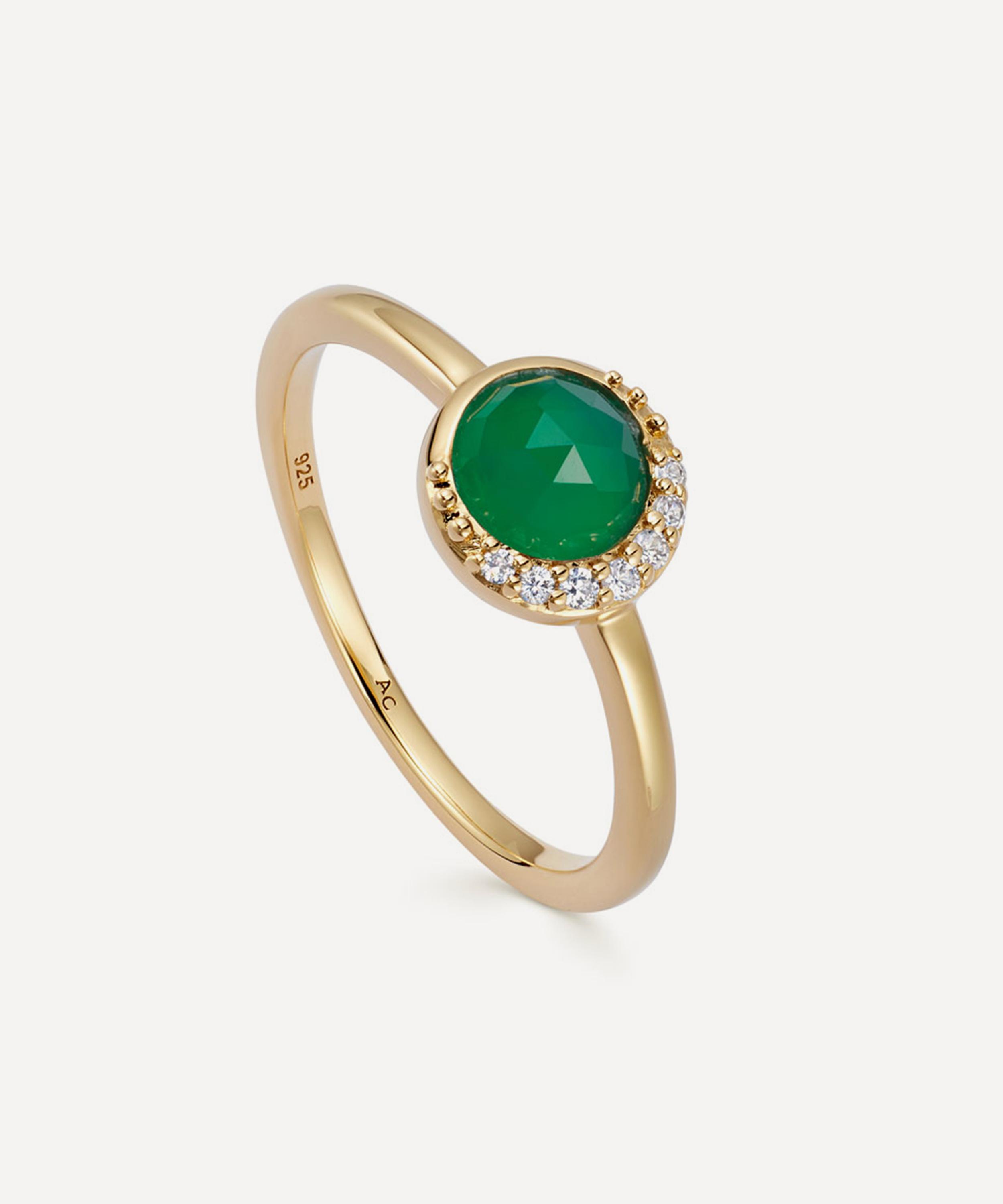 Imbued with meaningful symbolism, this ring is from Astley Clarke’s Luna collection – channelling the power of moon and tidal magnetism. Crafted from sterling silver plated in 18ct gold vermeil, it features a slim band and a faceted green chalcedony centre stone – a representation of courage – adorned with sparkling white sapphires forming a crescent-like shape around the edge.