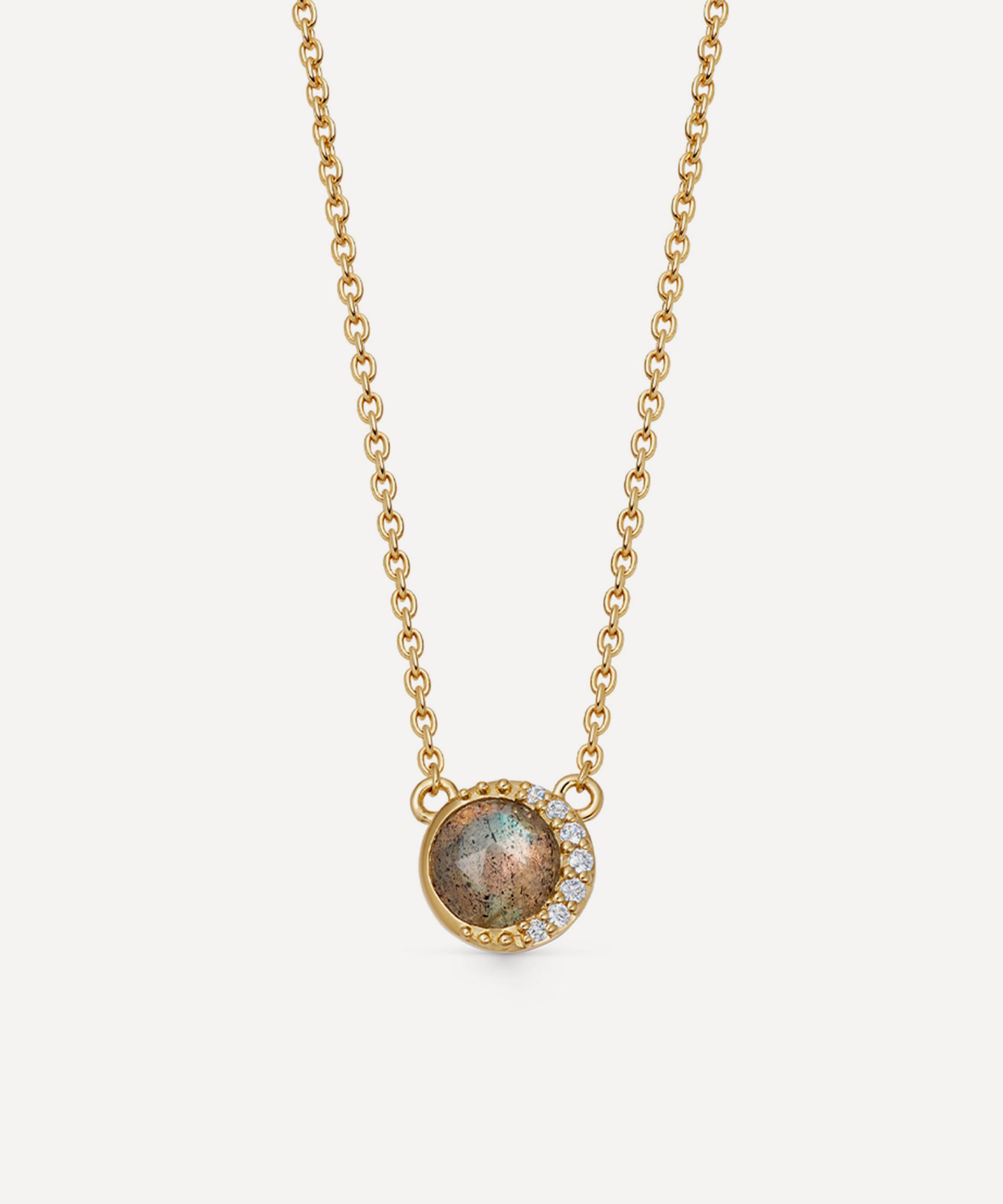 Crafted from sterling silver plated in 18ct gold vermeil, it features a round labradorite pendant – a symbol of wisdom, embellished with white sapphire accents forming a crescent moon around the outer edge of the stone. Offering endless styling options, wear yours on its own, layer with multiple pendants, or pair it with the matching drop earrings for a coordinated look.