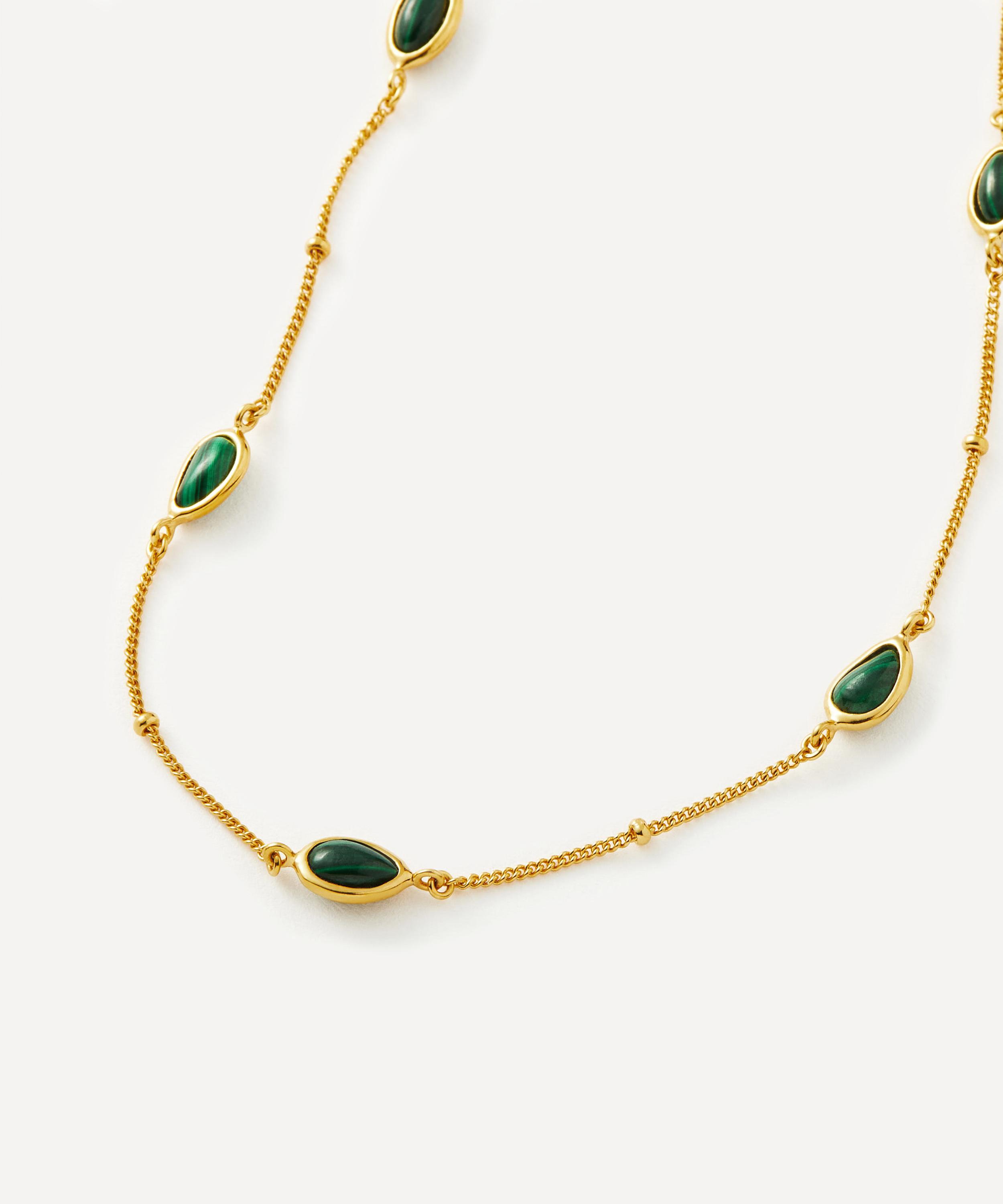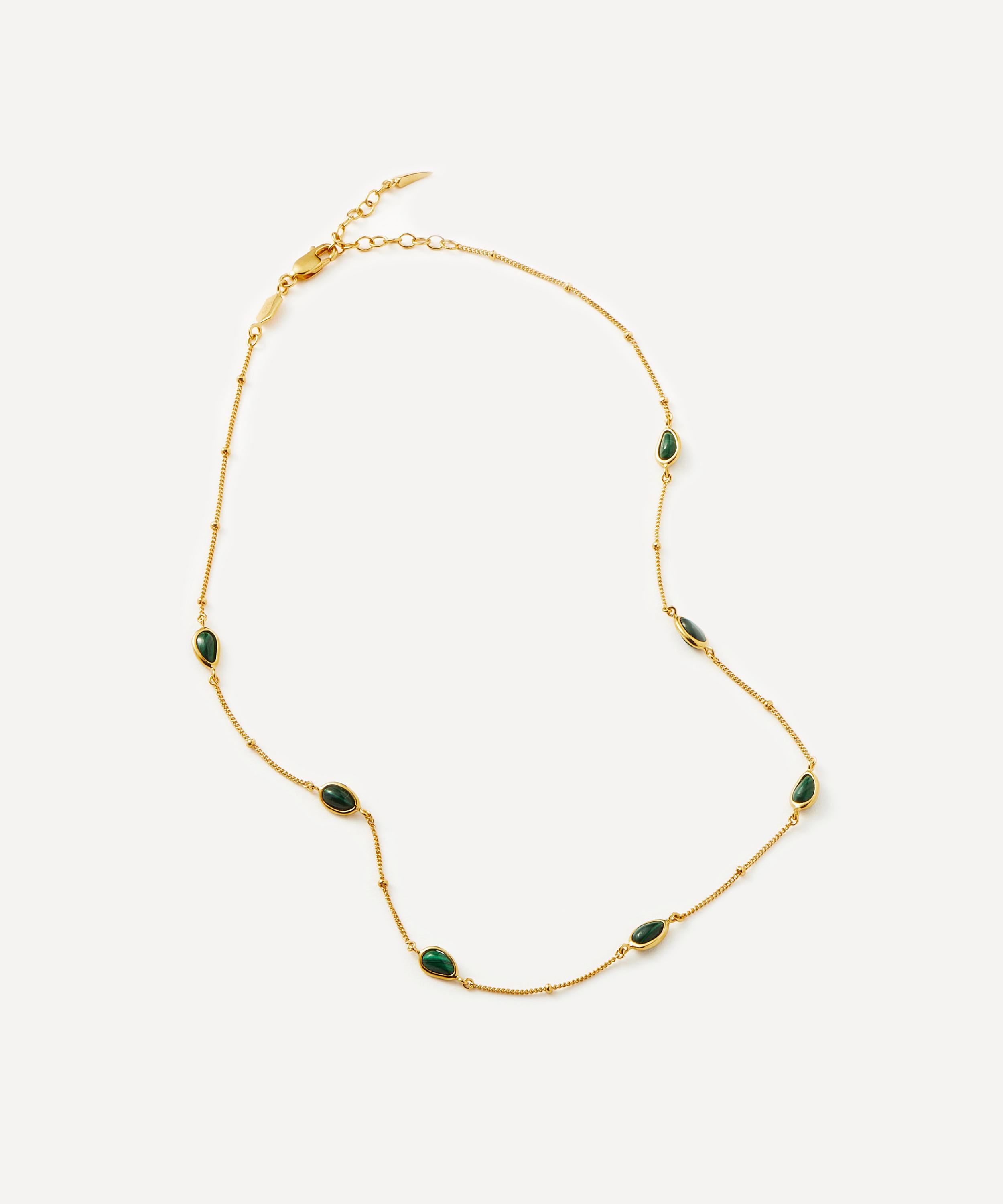 Crafted from sterling silver plated in 18ct gold vermeil, it features a delicate bobble chain adorned with vibrant green malachite stones, fitted into organic settings. Style it solo, team it with other gold necklaces, or pair it with a matching piece from the Magma collection.