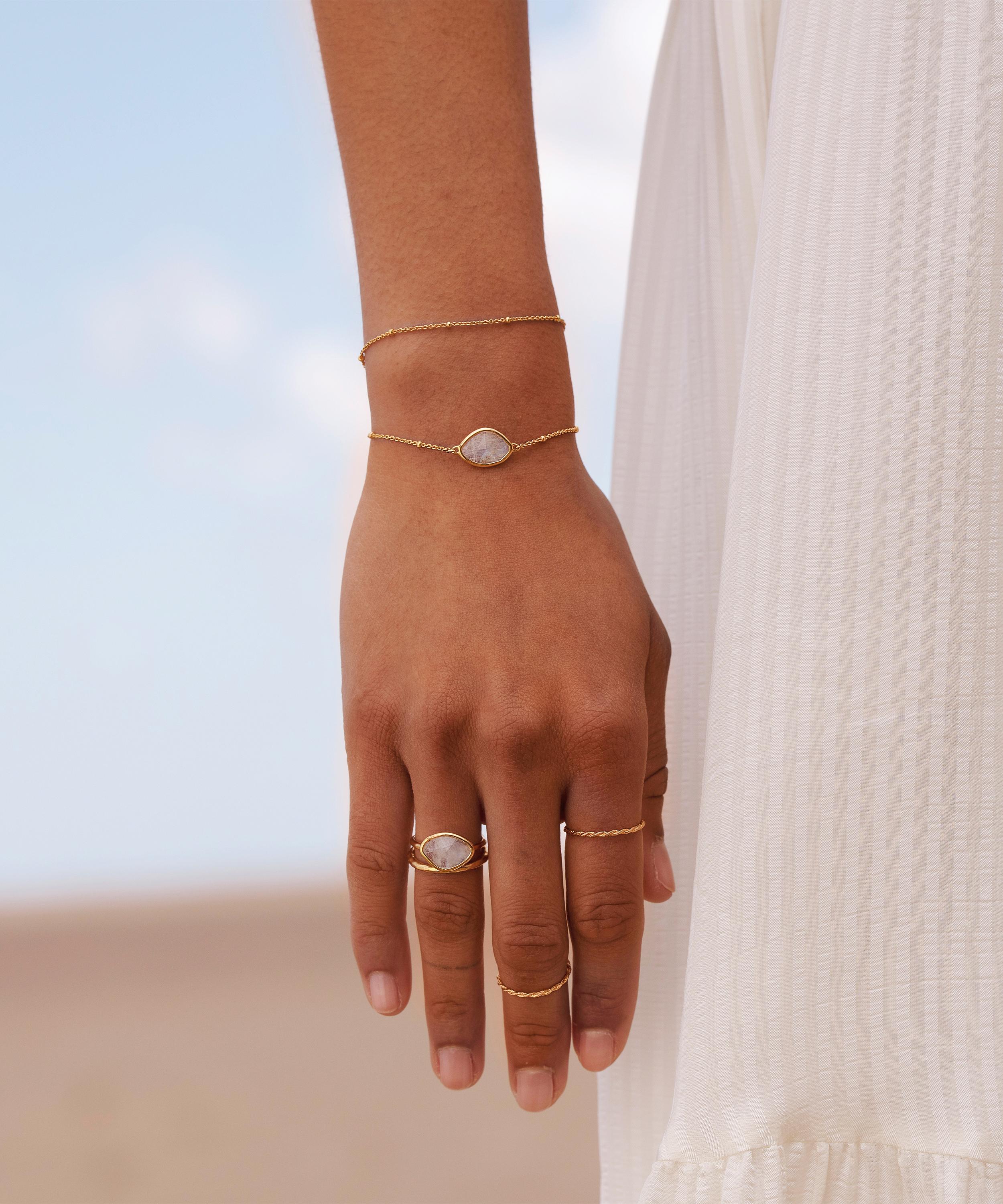 A subtle statement piece, this ring features a hand-cut moonstone that’s been meticulously set by artisans and framed in an elegant petal shape. Designed specifically for stacking, the stone's slightly raised setting allows for additional rings to nestle beneath it, while a subtly waved band adds an organic finish. Style it solo or pair it with other gleaming gem-encrusted bands from the collection and beyond for a custom, contemporary approach.