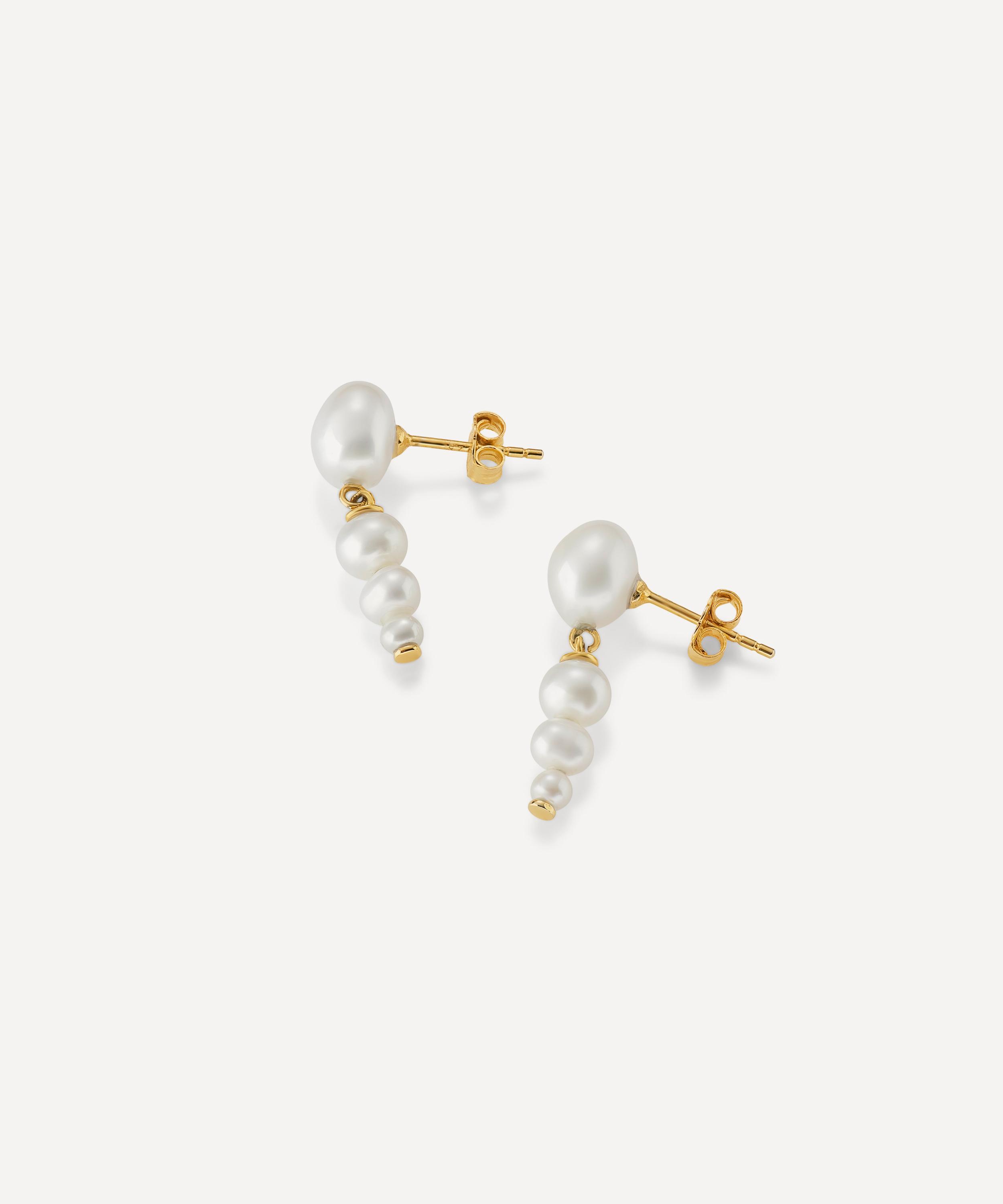 Designed to stand the test of time, the Nicola drop earrings from V by Laura Vann are perfect for a touch of everyday elegance. Crafted from sterling silver plated in 18ct gold vermeil, each earring features a large freshwater pearl stud and three hanging pearls.