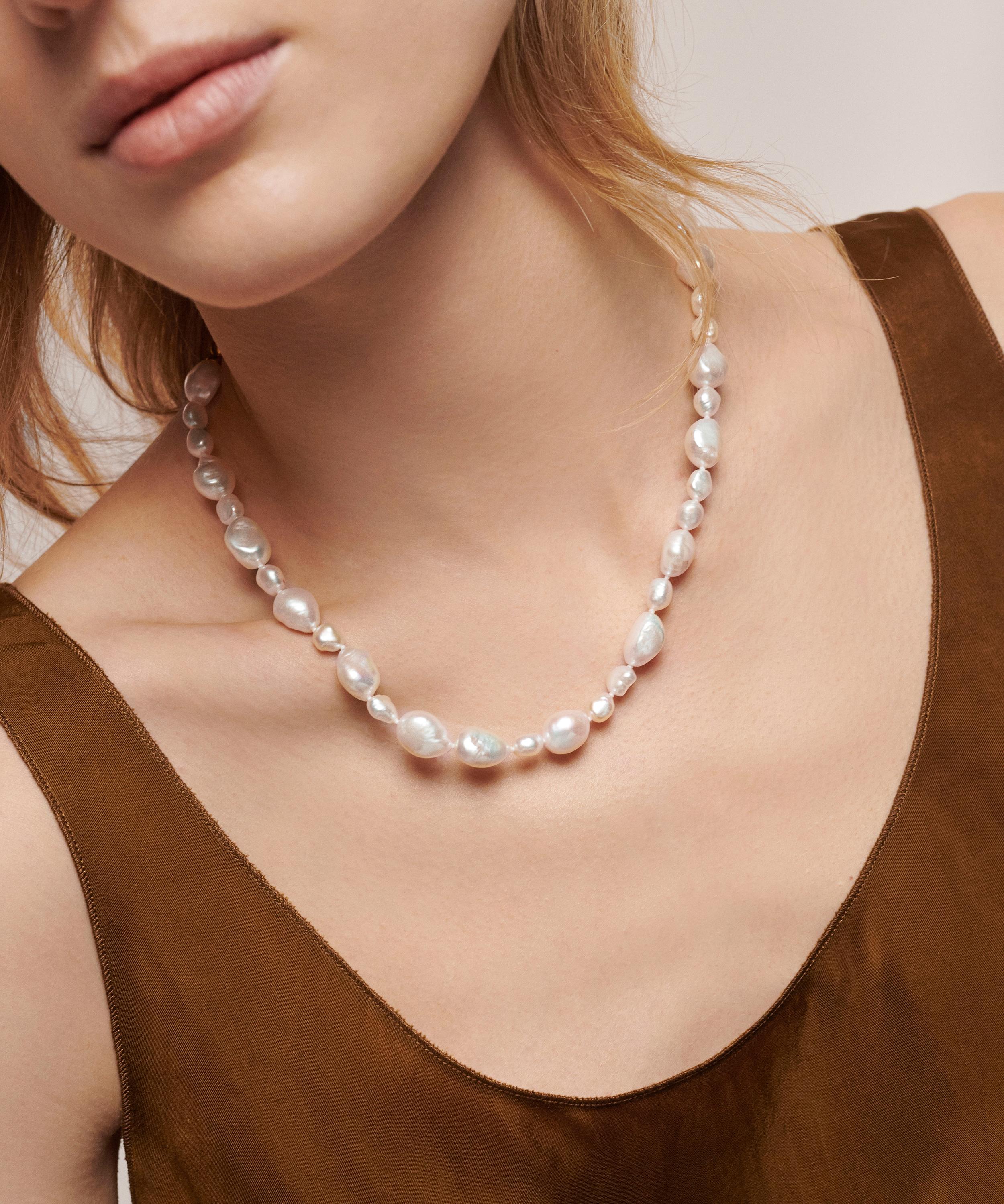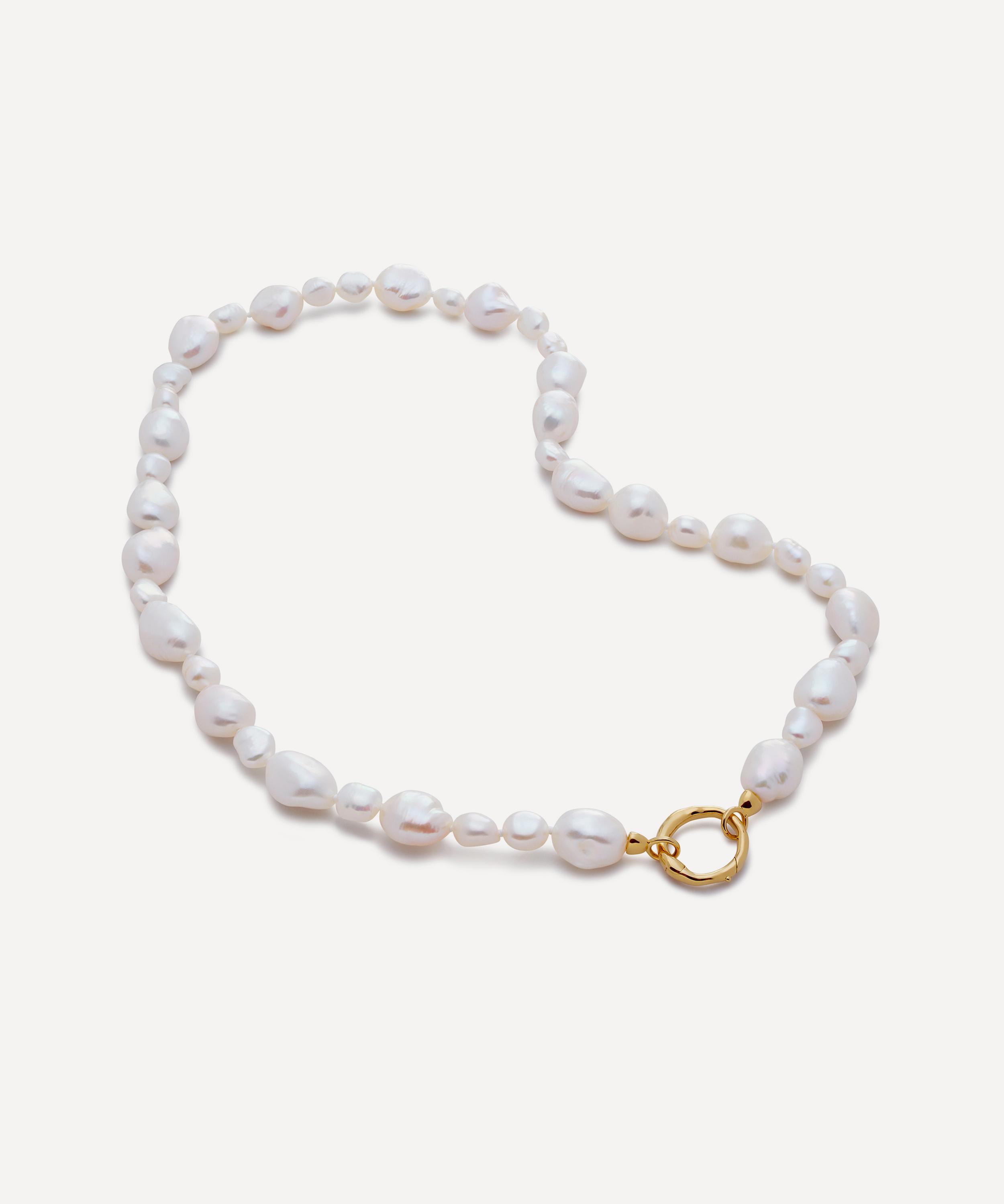 This pearl necklace is part of Monica Vinader’s Nura collection – a series characterised by beautifully simple, organic styles. Crafted from sterling silver plated in 18ct gold vermeil, it features opulent freshwater pearls – each with their own unique shape and characteristics – and a clasp fastening that doubles as a pendant holder. Style it solo, or team with gold chains and pendants for a contrasting stack.