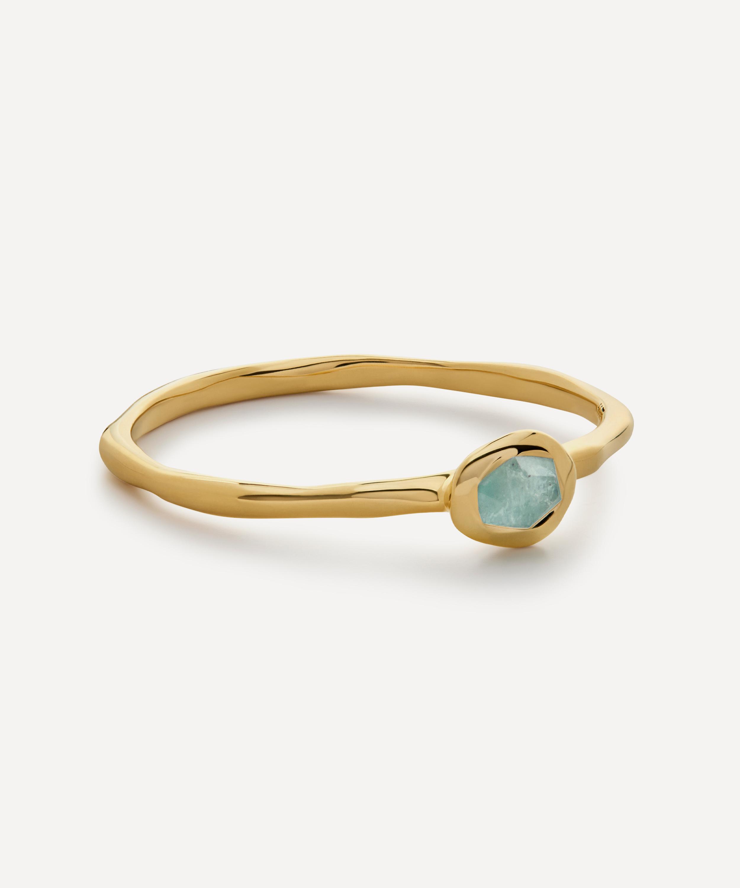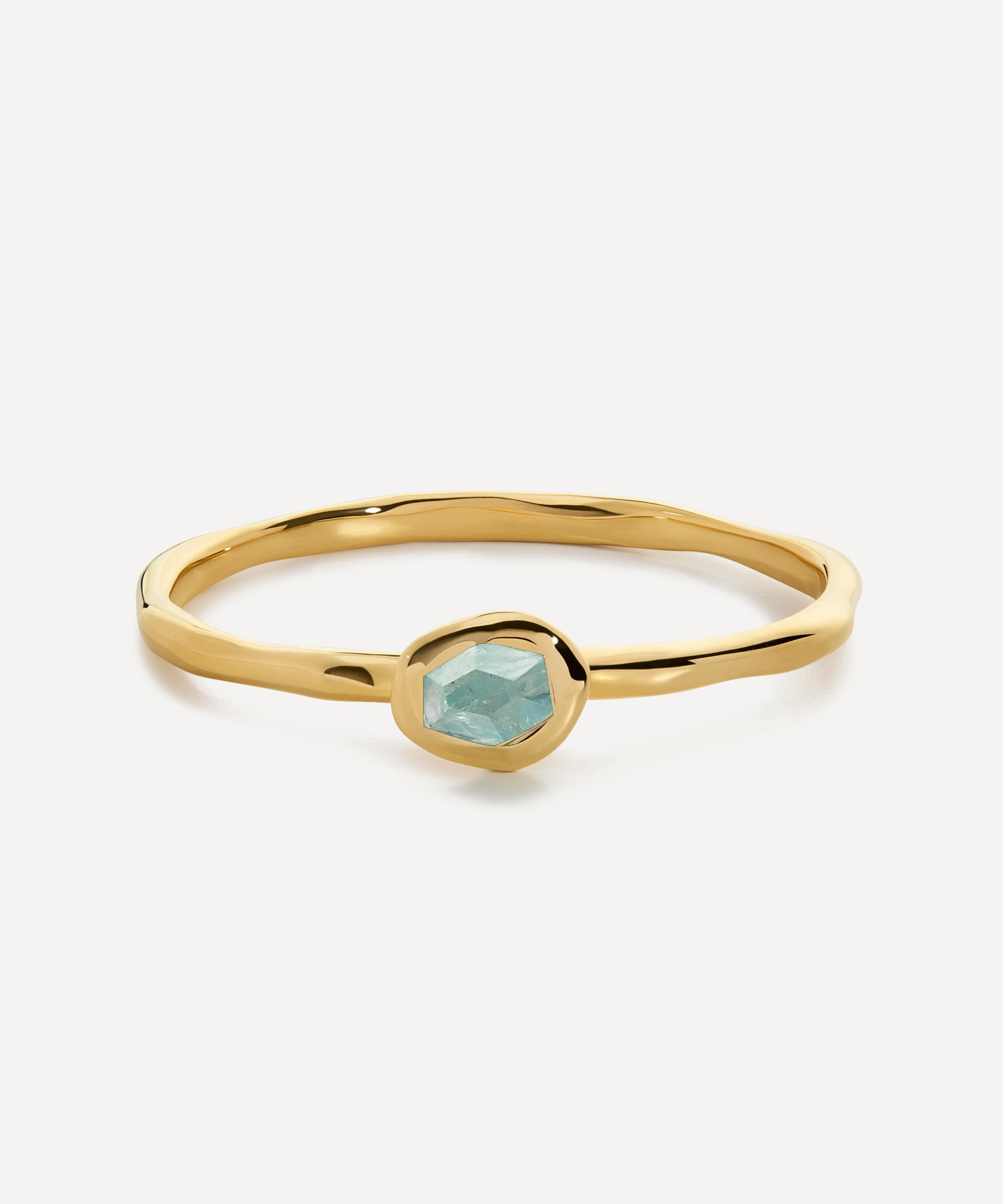 Crafted from sterling silver plated in 18ct gold vermeil, it features a hand-faceted aquamarine in a tranquil blue colourway, expertly fitted onto a molten band. Perfectly poised to make a confident style statement, it’s bound to become the focal point of your outfit and make you stand out from the crowd. Style it as a solo piece, add it to a curated ring stack for a bit of edge, or partner it with any of the matching pieces from the collection for a co-ordinating look.