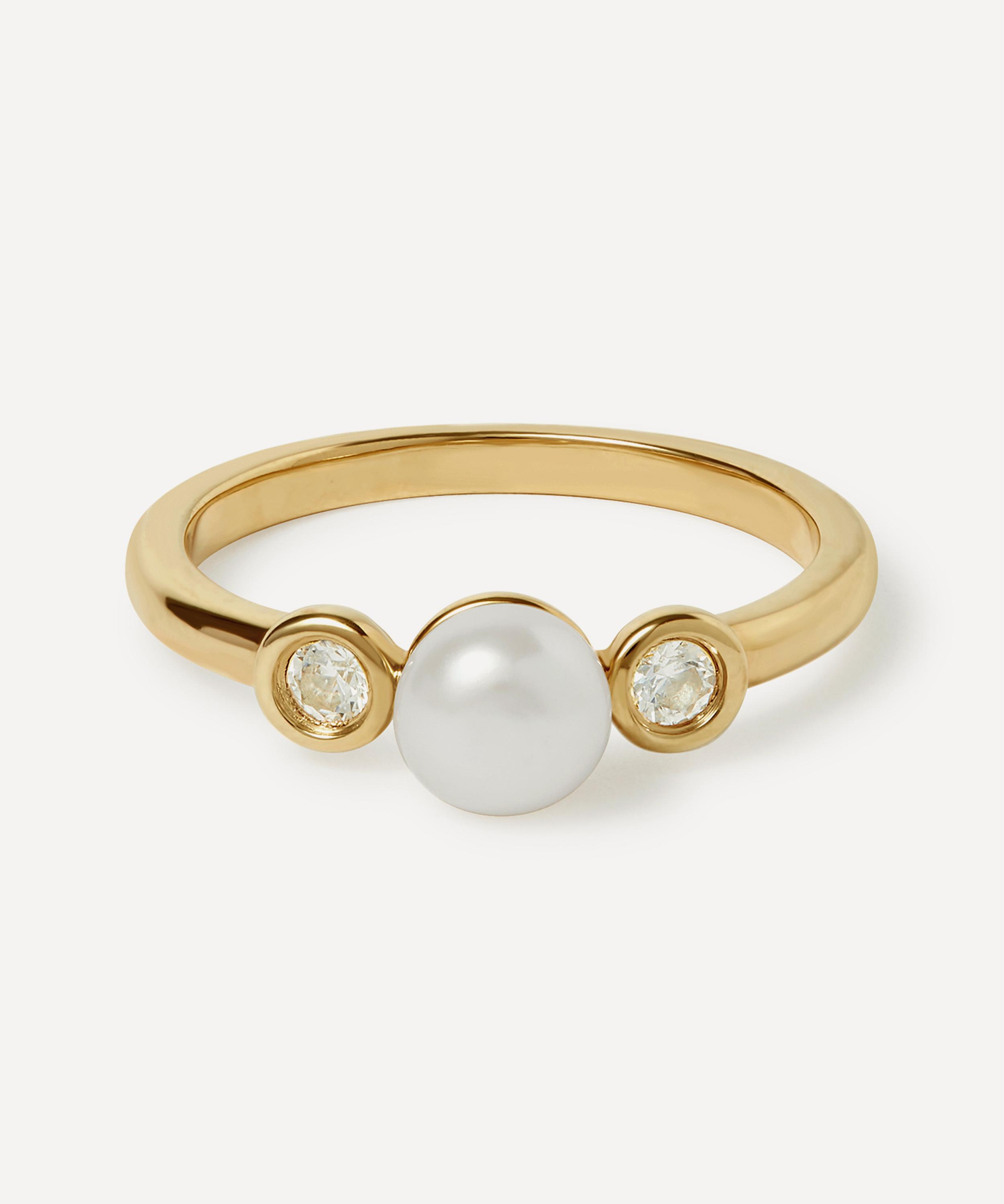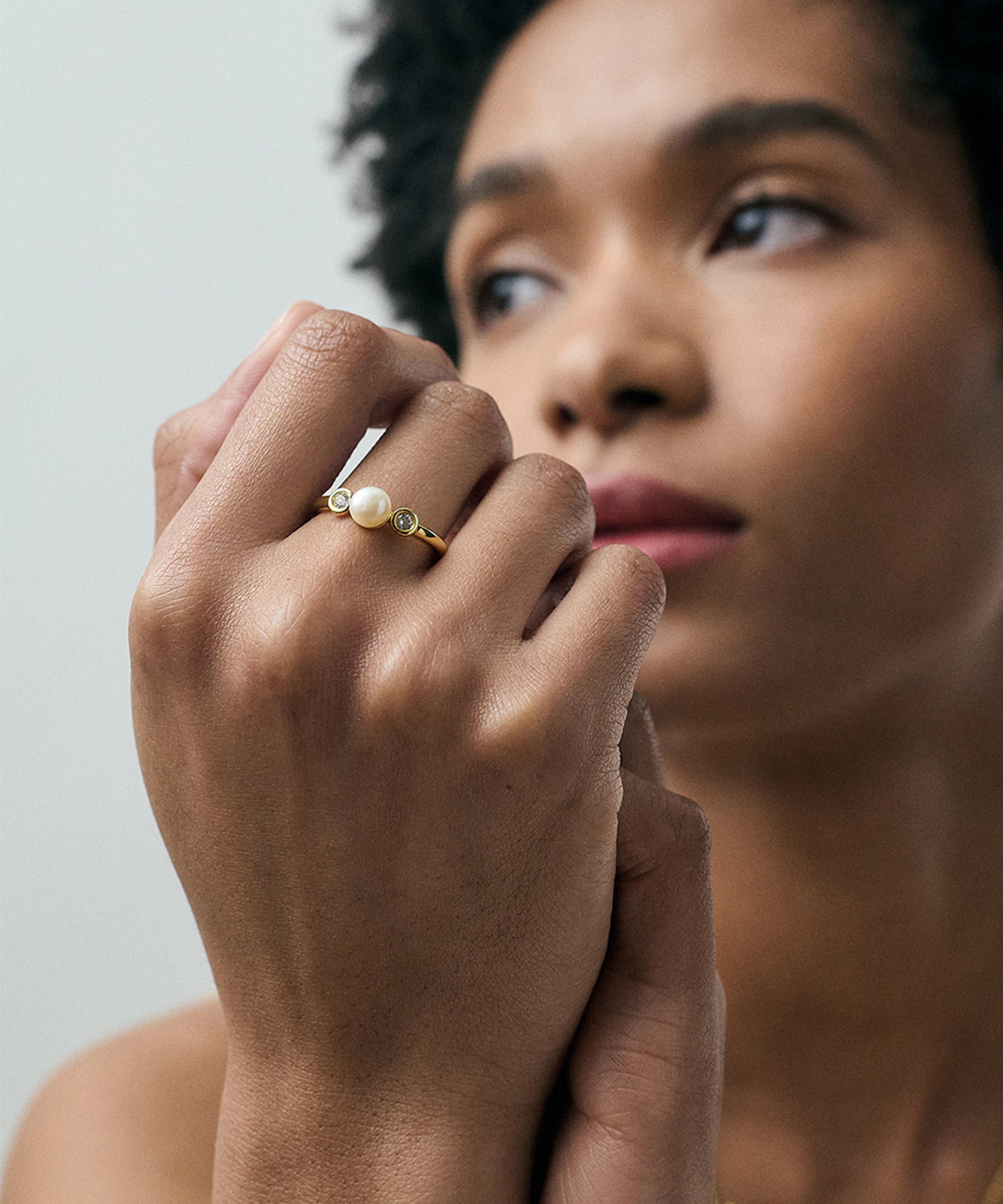 Set with a dreamy, lustrous freshwater pearl flanked by two white sapphires, each gemstone catches the light with a subtle brilliance, lending a sense of poise and modern romance to the finger. Crafted from sterling silver plated in 18ct gold vermeil, it makes for a thoughtful gift – or a forever addition to your own jewellery collection. Layer it with other pieces or style alone for a touch of refined simplicity.