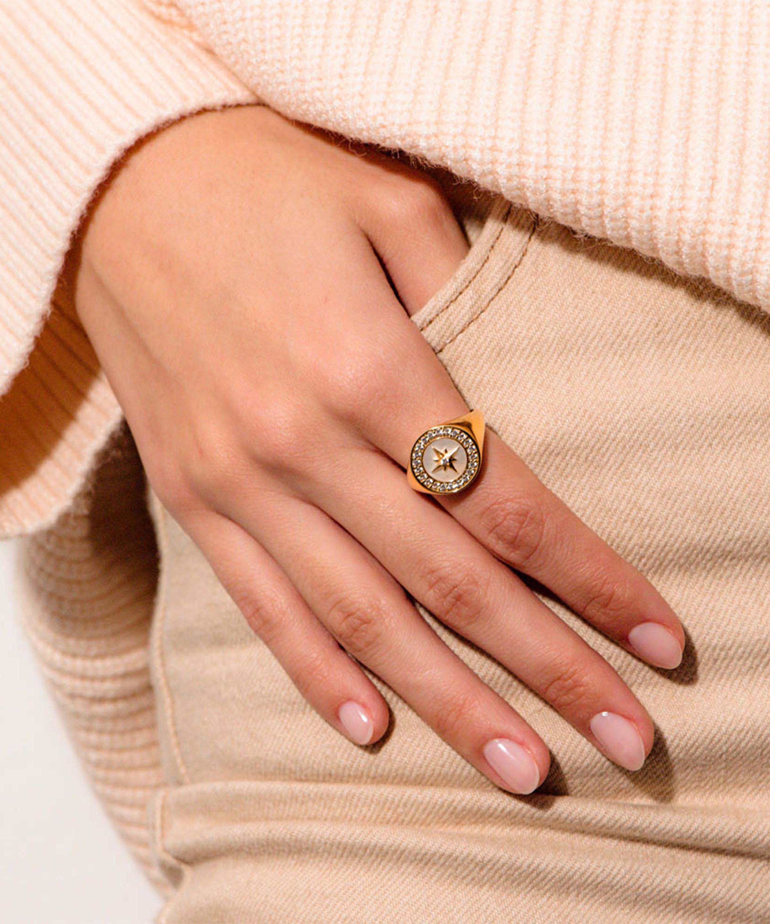 Inspired by the beauty of the North Star, this signet ring features a compass-inspired design detailed with a central sapphire set star motif surrounded by mother of pearl and encircled with glittering white sapphires. Style this piece alone to make a statement, or team it with other rings from the collection to create your own curated stack.