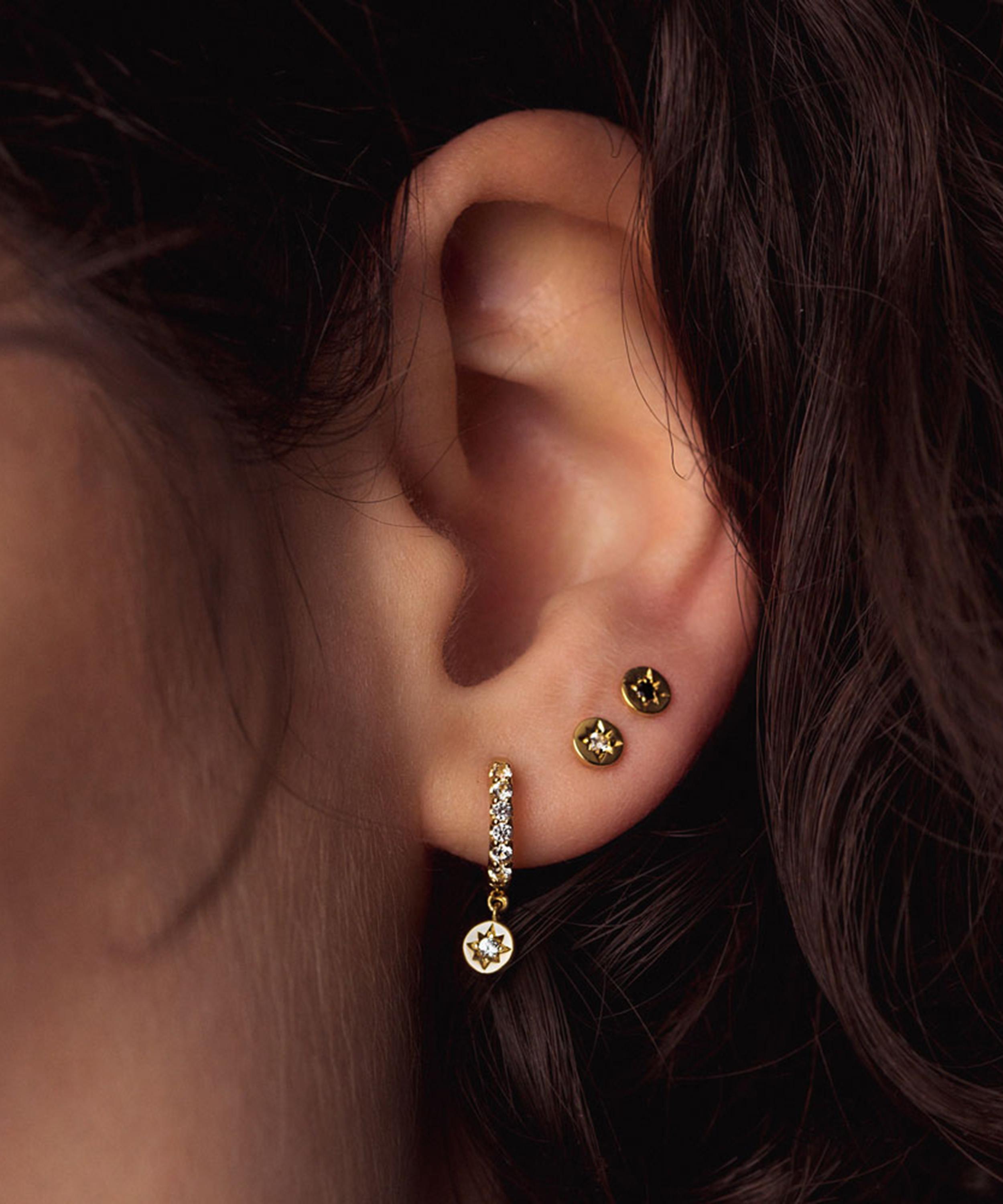 Inspired by the beauty of the North Star, each of these earrings feature a high-polished hoop, adorned with white sapphires. Suspended from the hoop, is a round disc drop with a star set white sapphire at the centre. Wear them alone for some understated glamour, or team them with other hoop drops for a trend-led finish.