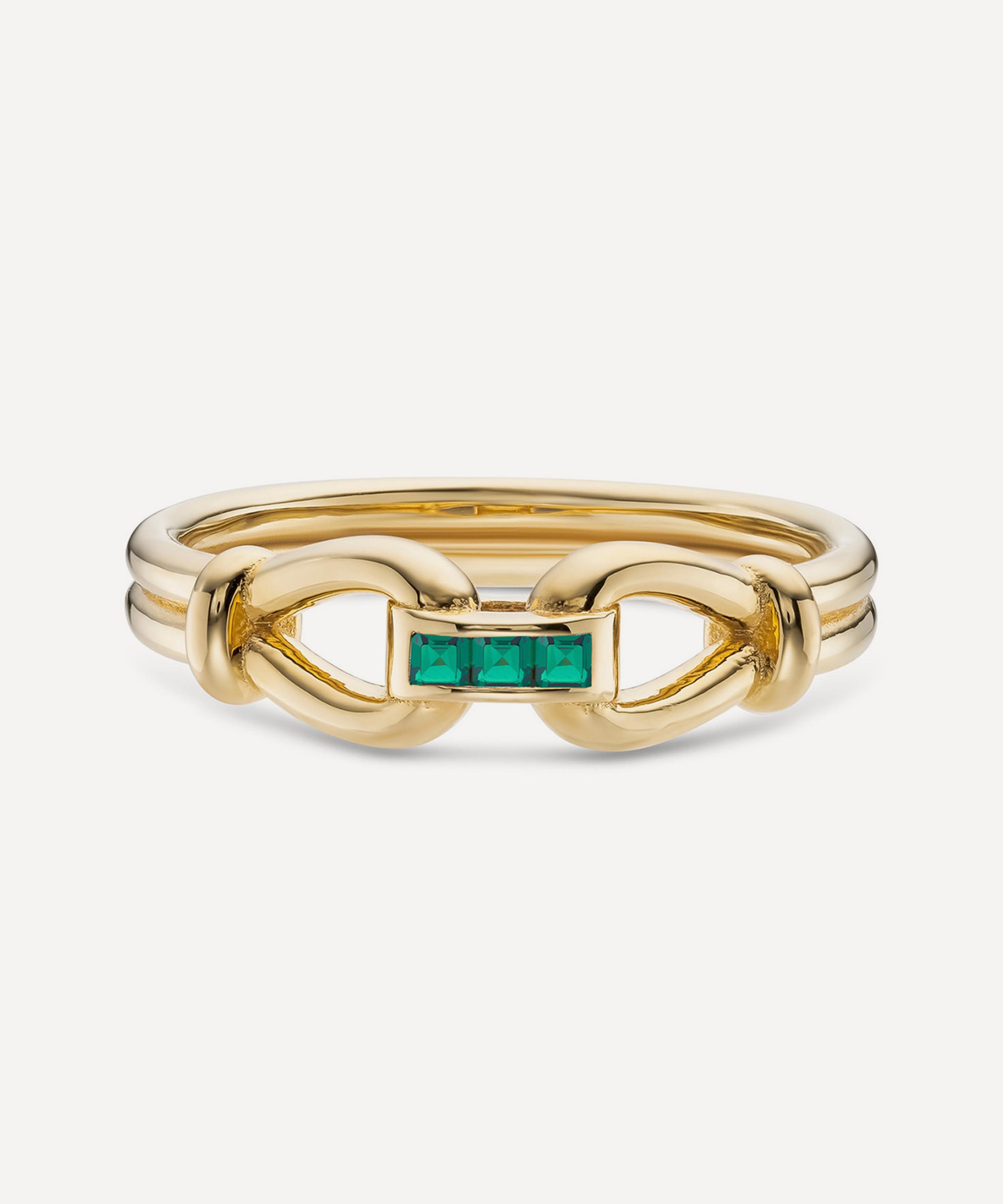 Crafted from sterling silver plated in 18ct gold vermeil, it features a beautifully intricate openwork design, embellished with step cut green cubic zirconia. Style it solo or incorporate into a stack.