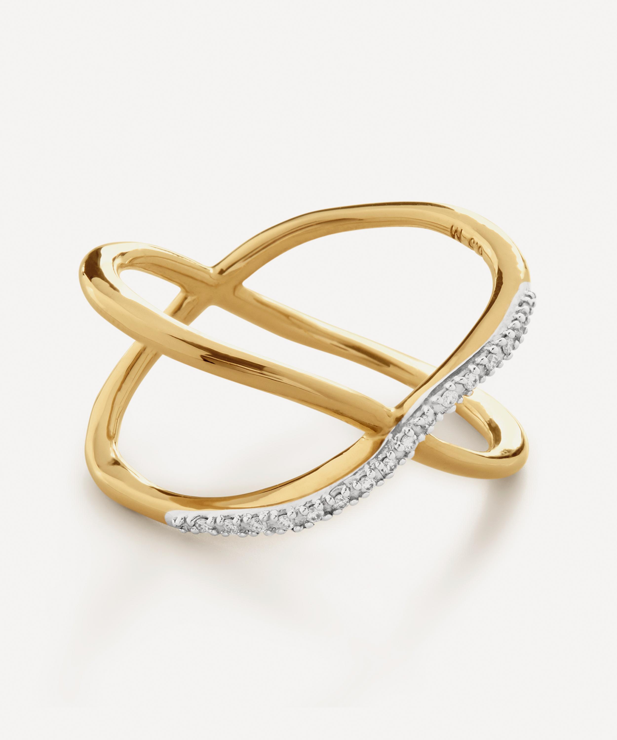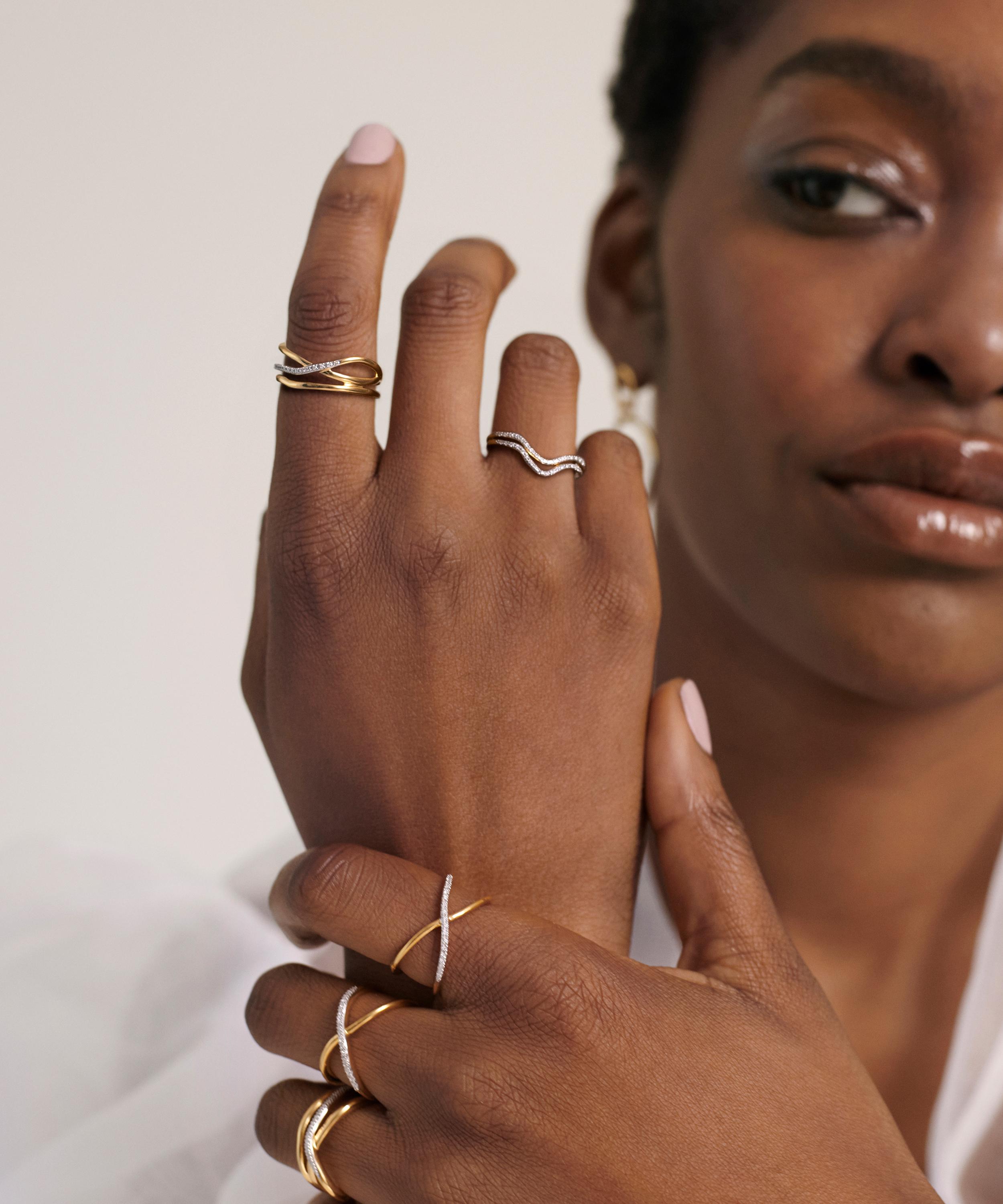 Give your jewellery collection a sparkling update with the Riva Diamond Kiss ring from Monica Vinader. This enchanting ring features an organic, two-band crossover design adorned with streak of handset pave’ diamonds – offering a romantic, glistening hue.