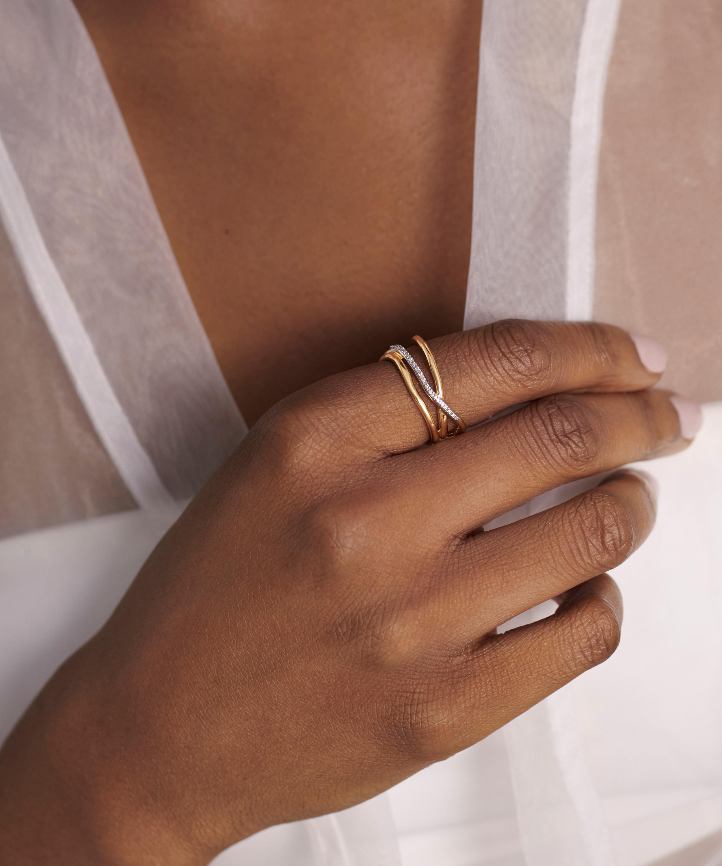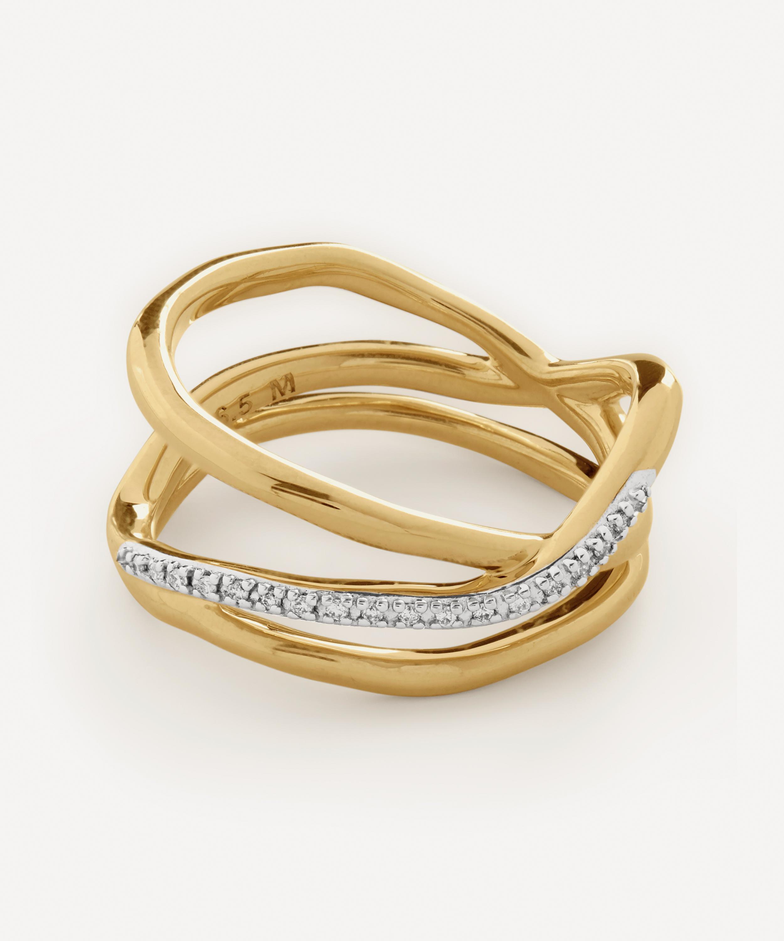 Give your jewellery collection a sparkling update with the Riva Diamond Pre-Stacked ring from Monica Vinader. This enchanting ring features an organic, crossover design, resembling rings stacked together, adorned with streak of handset pave’ diamonds.