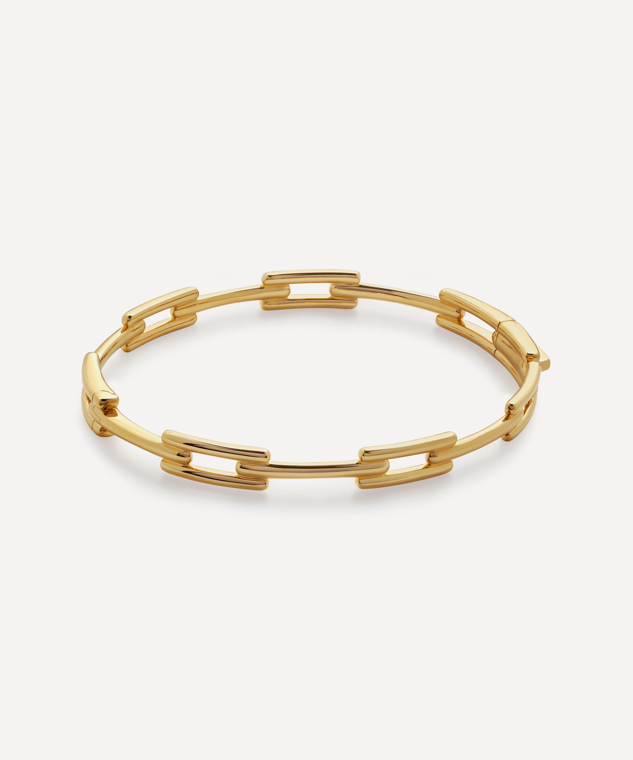 Crafted from sterling silver plated in 18ct gold vermeil, this bracelet takes inspiration from contemporary architecture, combining strong, clean lines and flowing curves for a modern and feminine finish. Perfect for stacking or styling alone, it features geometric links in a polished finish - try wearing it with several contrasting Signature bangles for a seamless stack of polished metal that will instantly compliment your attire.