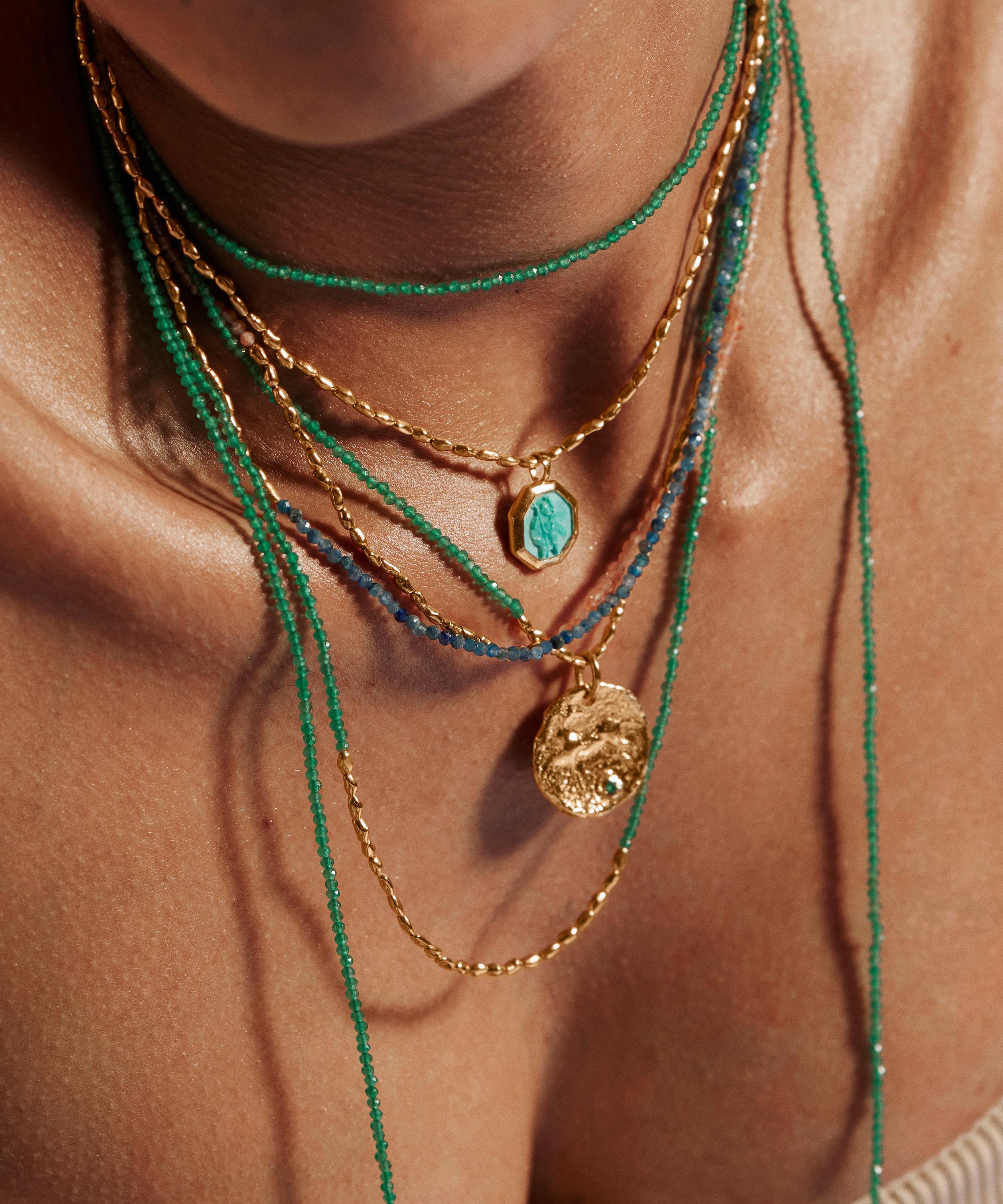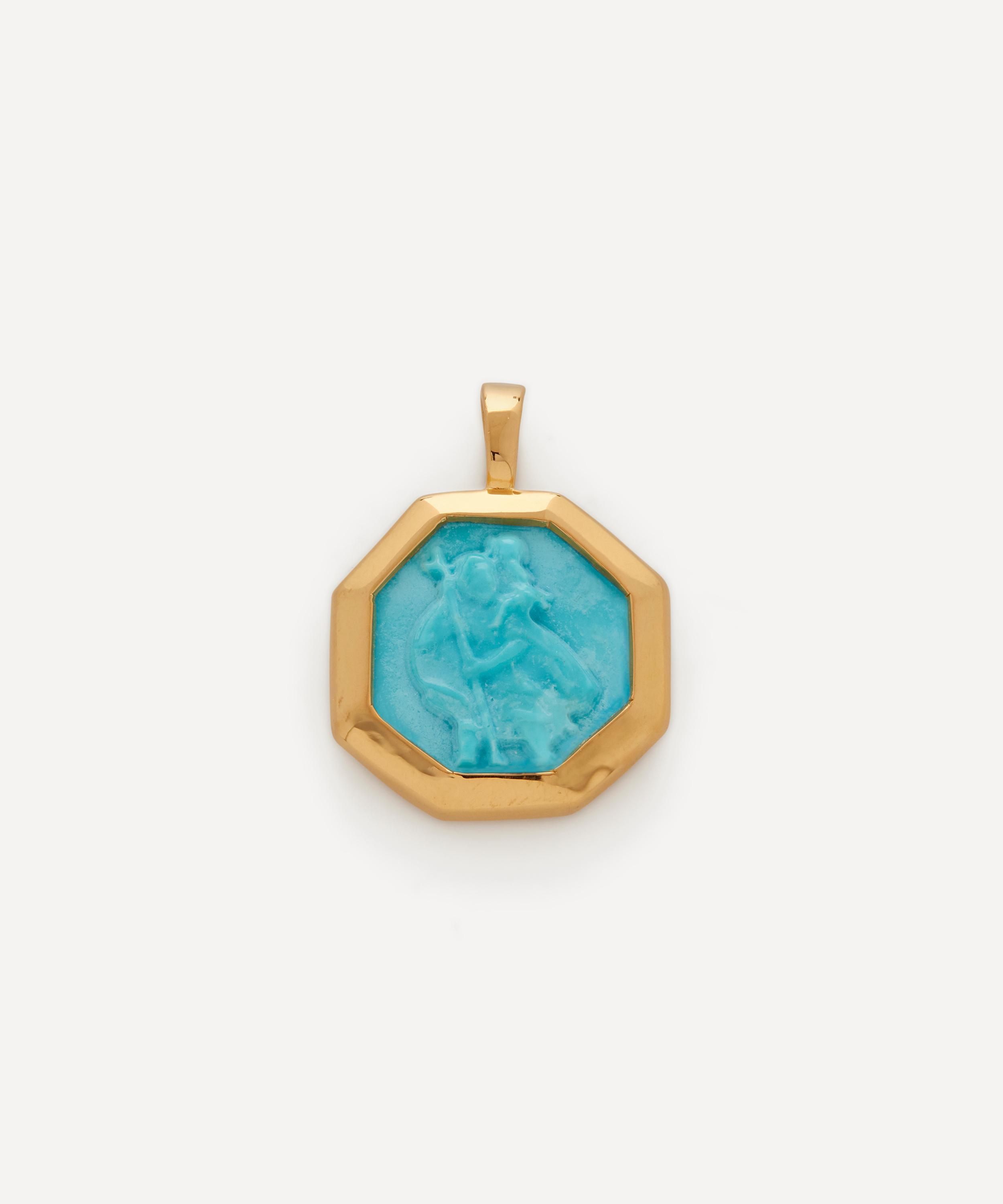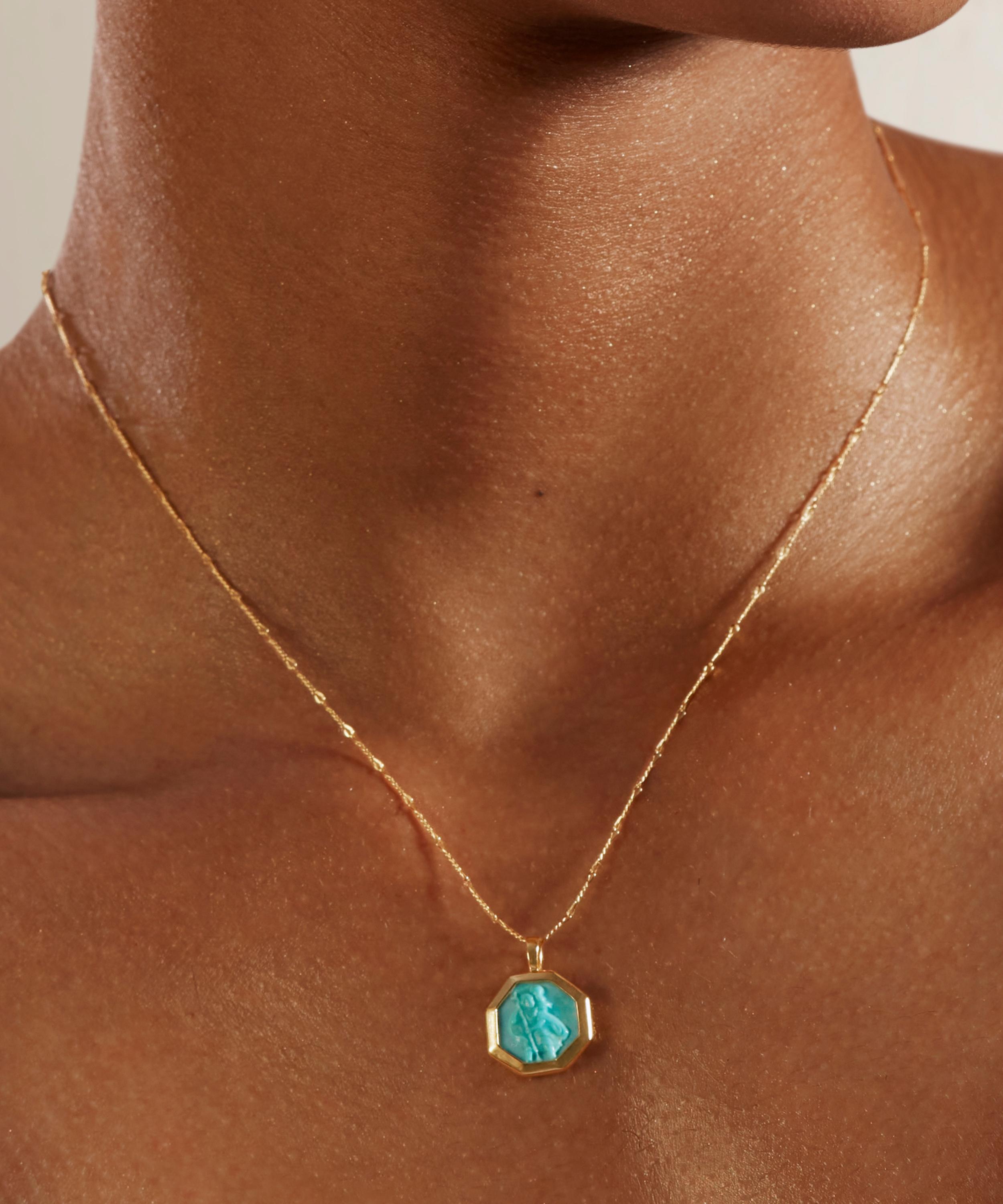 Presenting a unique composition, this charm pendant features a stylised motif of Sankt Christopher that has been carved into natural turquoise and encased in recycled gold vermeil. Representing a protection, this small treasure combines past wisdom with modern style to elevate your existing jewellery collection – try threading it into a fine chain necklace or charm bracelet to add a talismanic finish to your everyday curation.