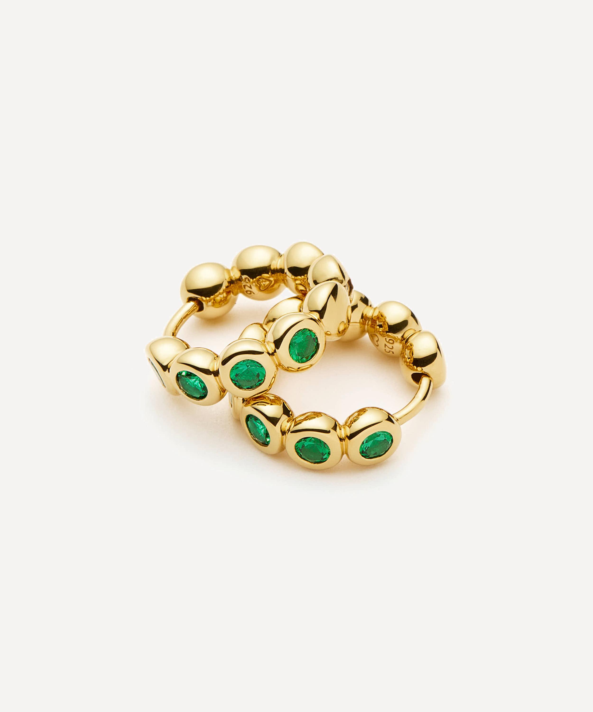 Drawing inspiration from the quiet and enduring elegance of vintage tennis bracelets, this pair boast a tribute to timeless refinement with a colourful twist. Each hoop is meticulously crafted from sterling silver plated in 18ct gold vermeil and set with a vibrant parade of faceted green nano crystals - with their graceful arc, they curve gently around the globe, catching the light from every angle. Finished with a secure hinge closure, they can effortlessly take you from day to night, perfect for weekend soirées, impromptu dinners, or simply for elevating the everyday. Try pairing them with matching pieces from Missoma’s Tennis collection for a co-ordinating set.