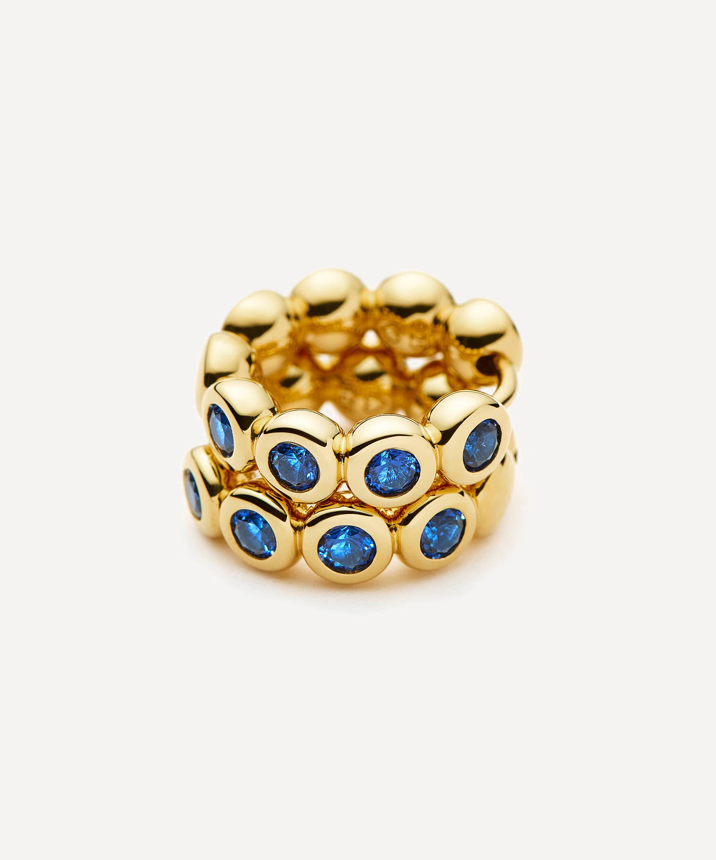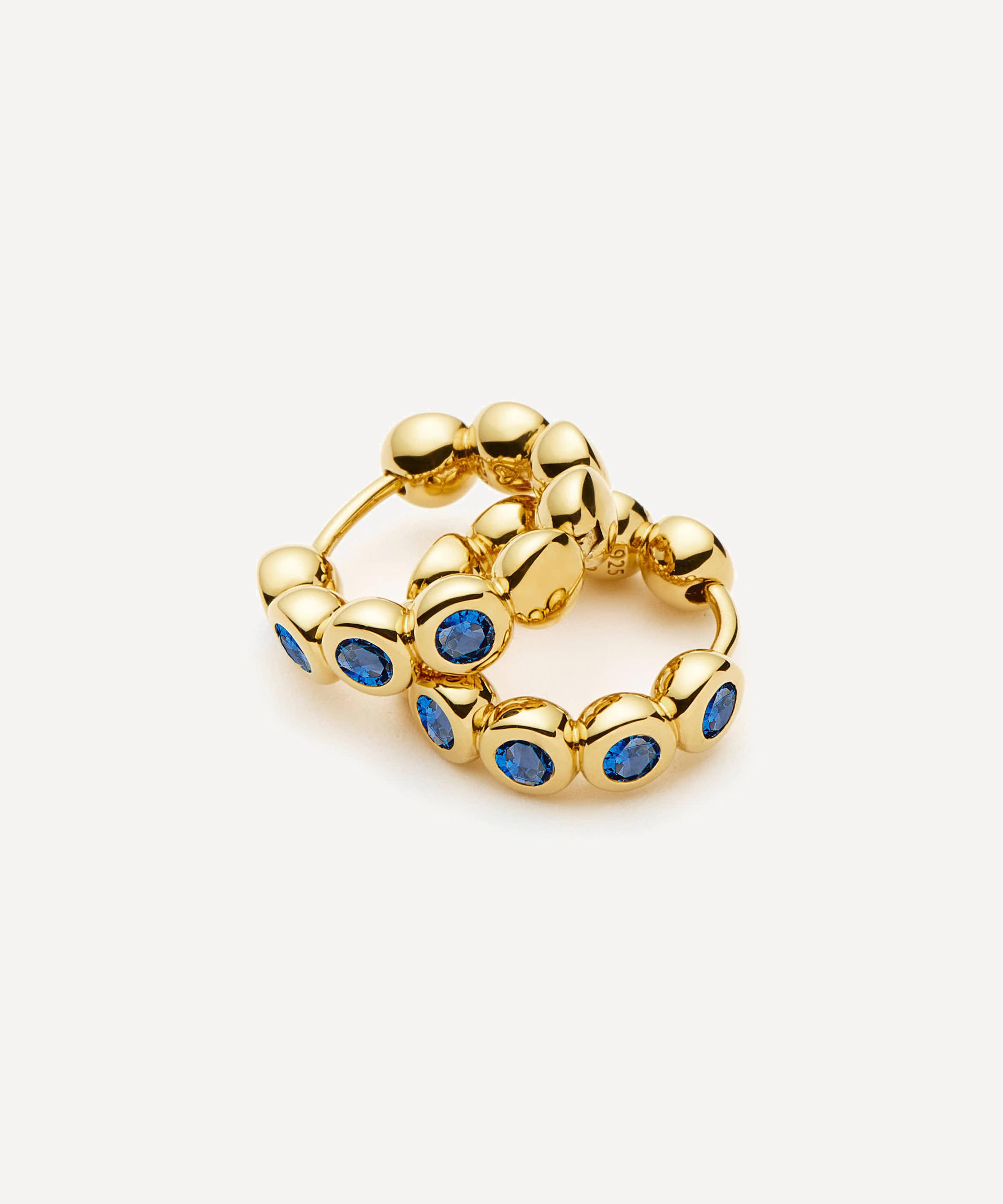 Drawing inspiration from the quiet and enduring elegance of vintage tennis bracelets, this pair boast a tribute to timeless refinement with a colourful twist. Each hoop is meticulously crafted from sterling silver plated in 18ct gold vermeil and set with a vibrant parade of faceted blue nano crystals - with their graceful arc, they curve gently around the globe, catching the light from every angle. Finished with a secure hinge closure, they can effortlessly take you from day to night, perfect for weekend soirées, impromptu dinners, or simply for elevating the everyday. Try pairing them with matching pieces from Missoma’s Tennis collection for a co-ordinating set.