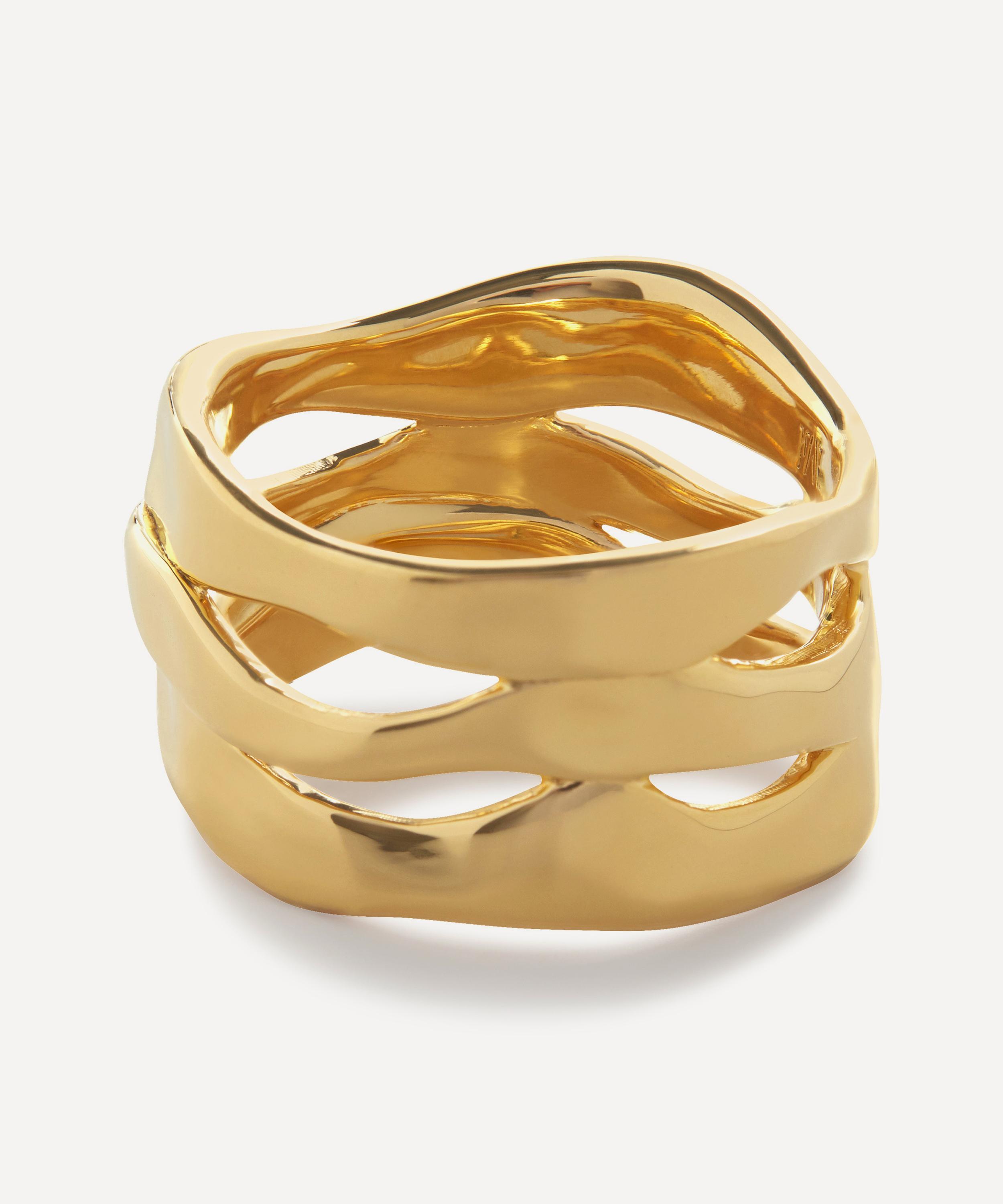 Add visual intrigue to your look with the Wave band ring – a wearable work of art from Monica Vinader. Crafted from sterling silver plated in 18ct gold vermeil, it features an organic, undulating silhouette created with the illusion of three perfectly positioned, individual bands. Style it solo, or with a mix of rings to create a curated stack.