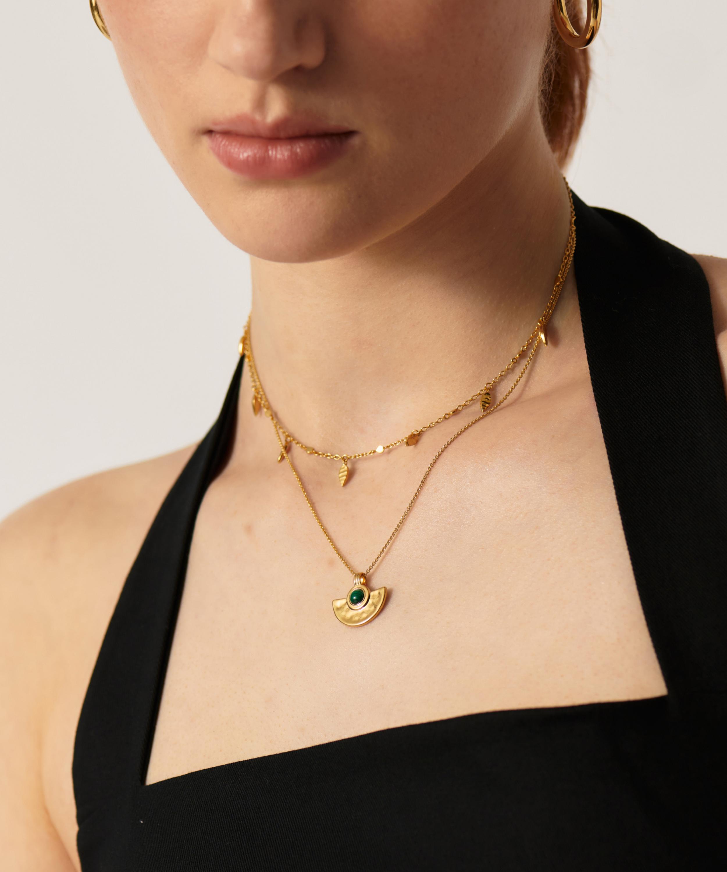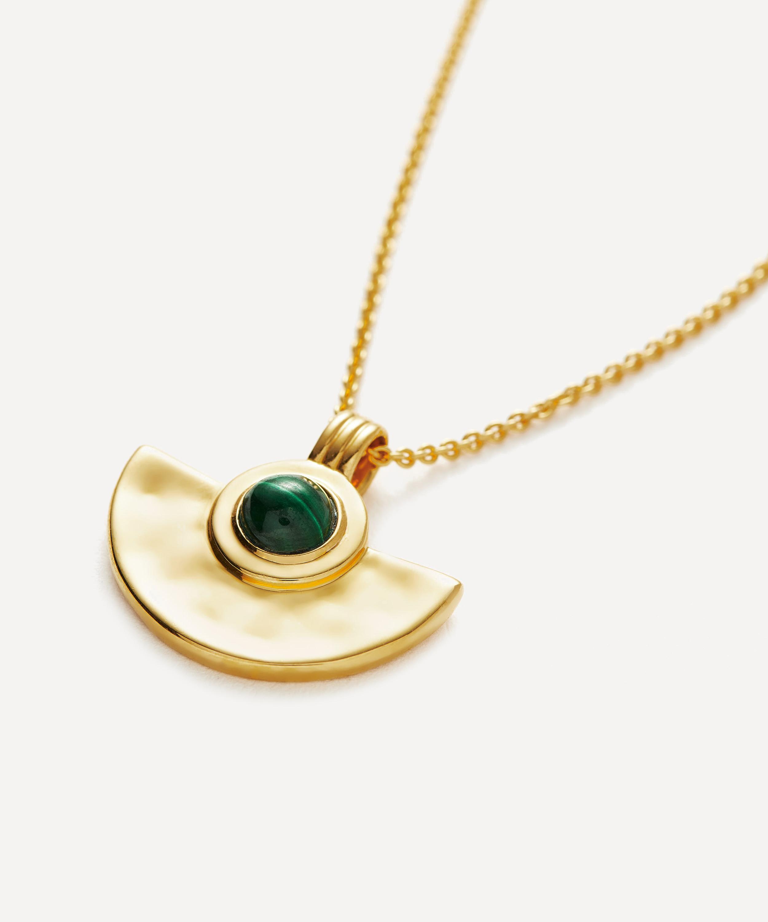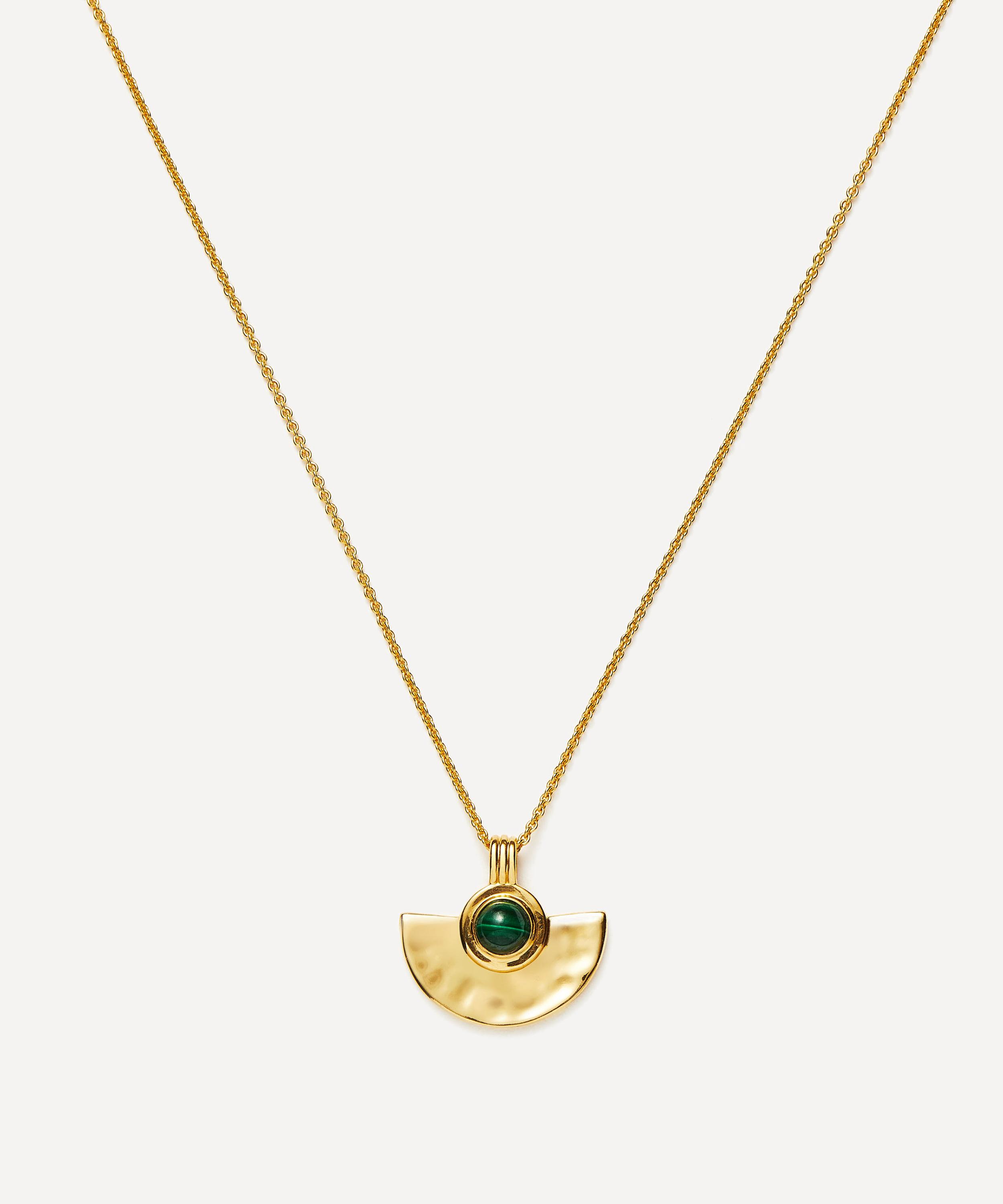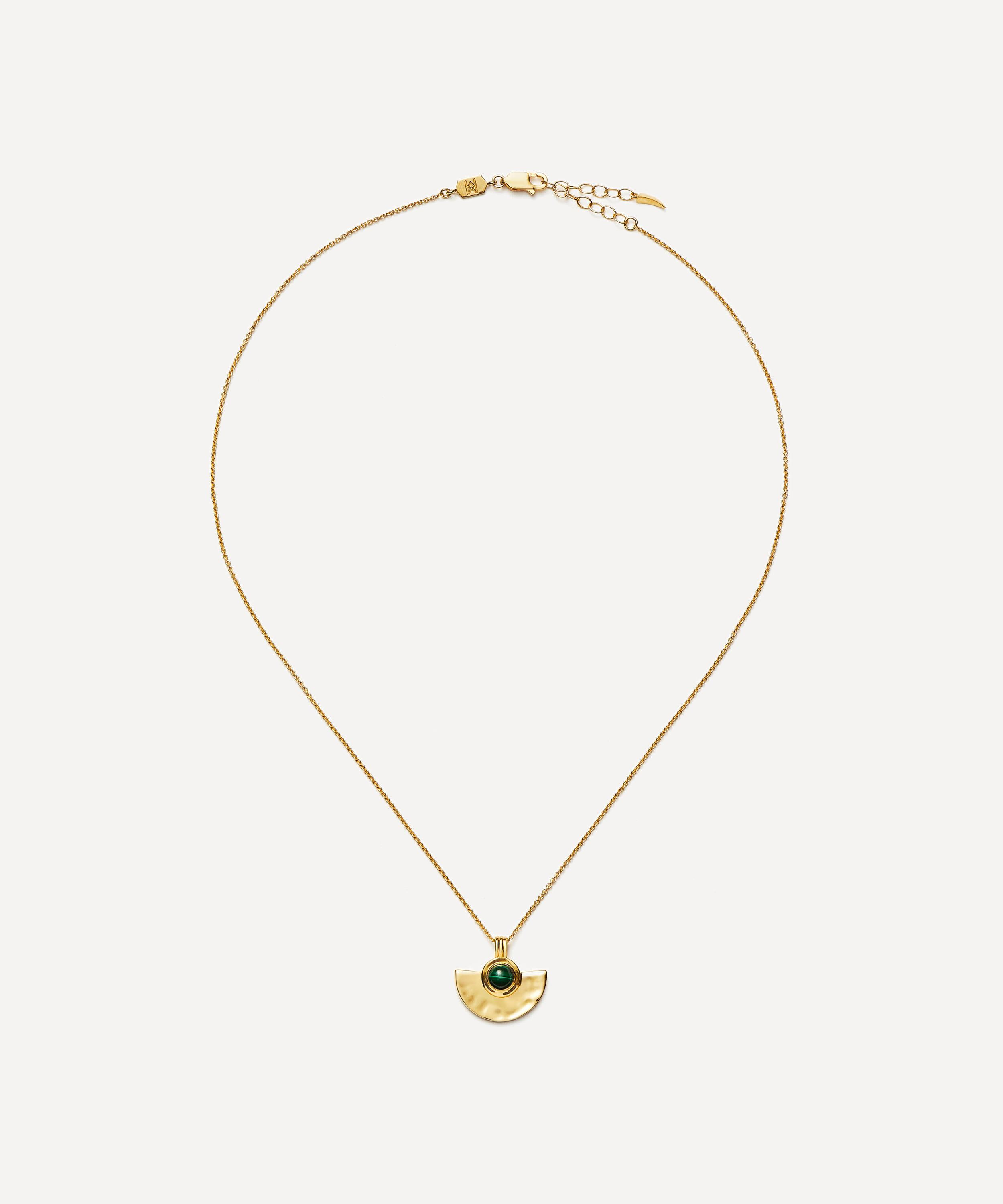Crafted from sterling silver plated in 18ct gold vermeil, it features a delicate trace chain, adorned with a fan-shaped pendant in a hammered finish, set with a round cabochon malachite at the centre. Complete with a classic lobster clasp, style it solo or layer it with other necklaces from the Zenyu collection.