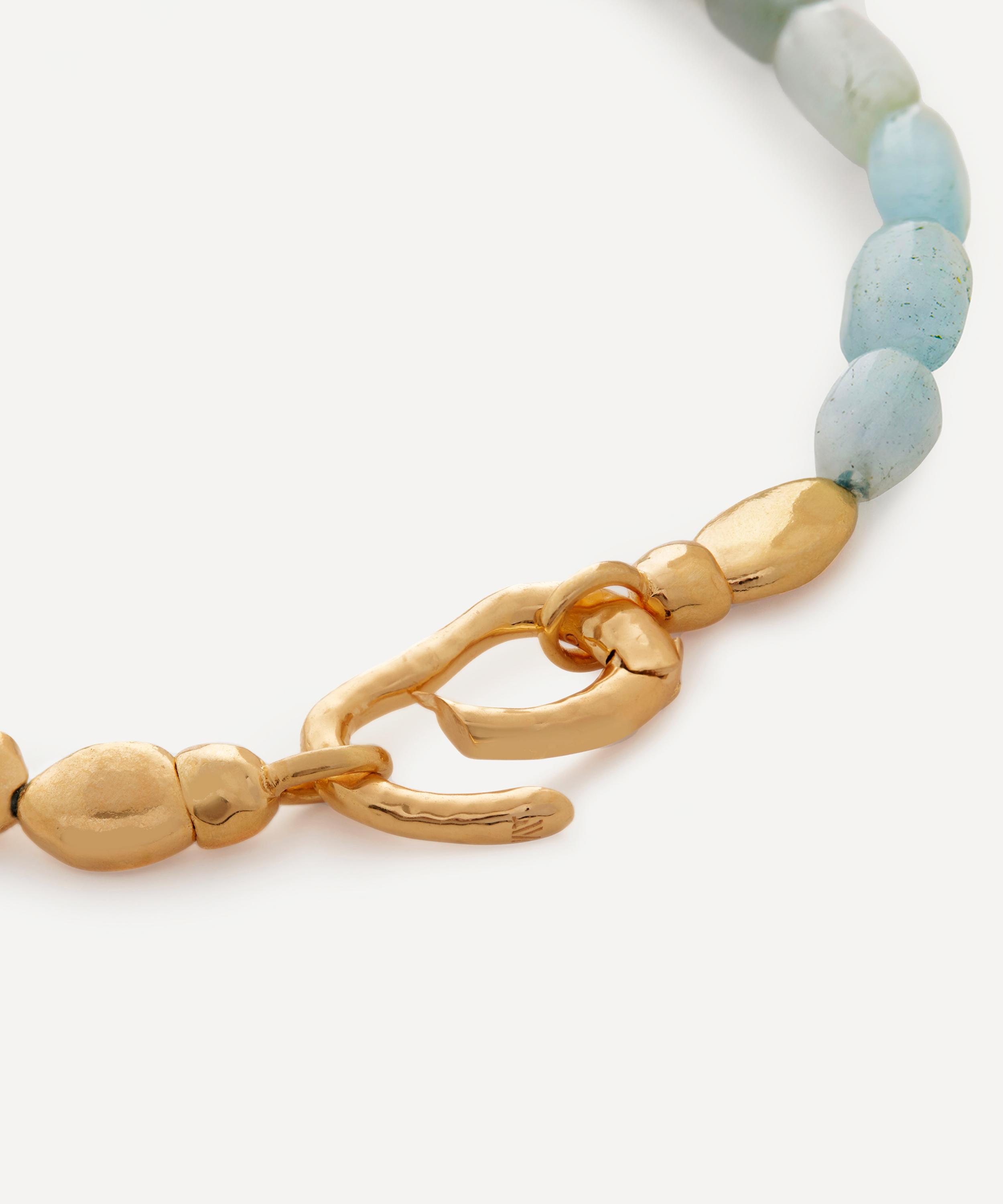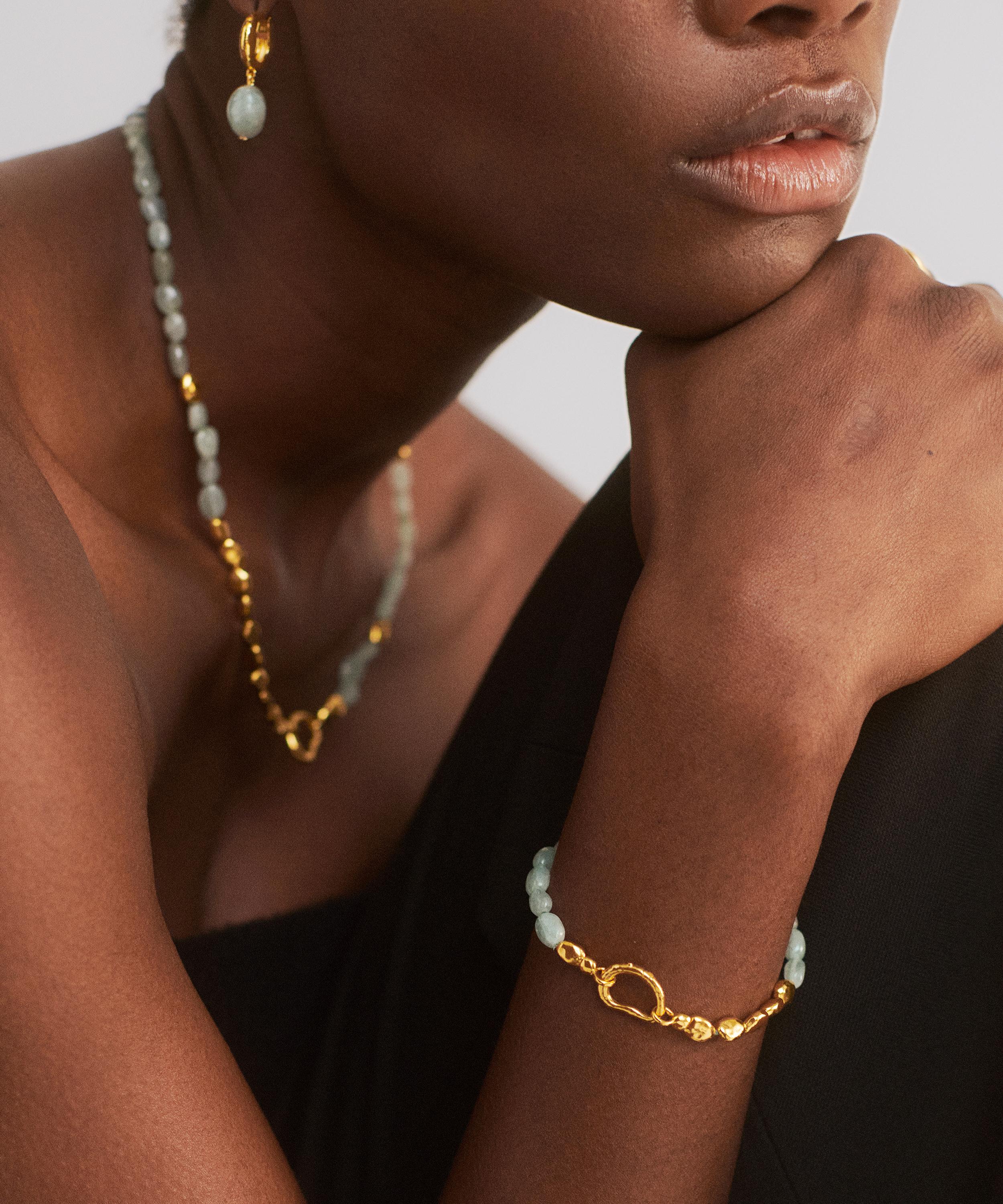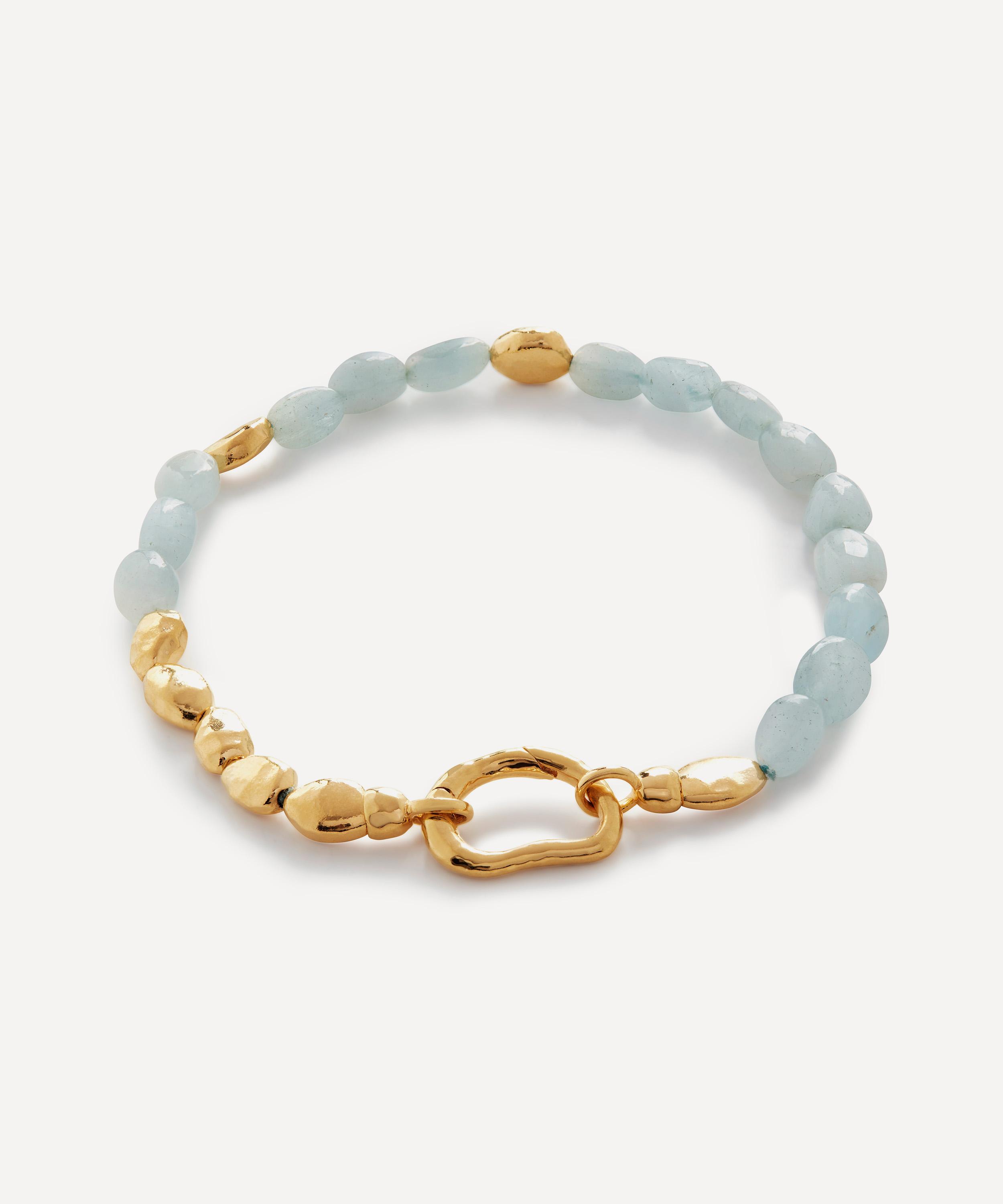 Crafted from sterling silver plated in 18ct gold vermeil, this playfully elegant bracelet boasts a colourful statement, with pebble-inspired aquamarine gemstone accents – wear it alone or style as part of a wrist stack for a vibrant, maximalist approach.