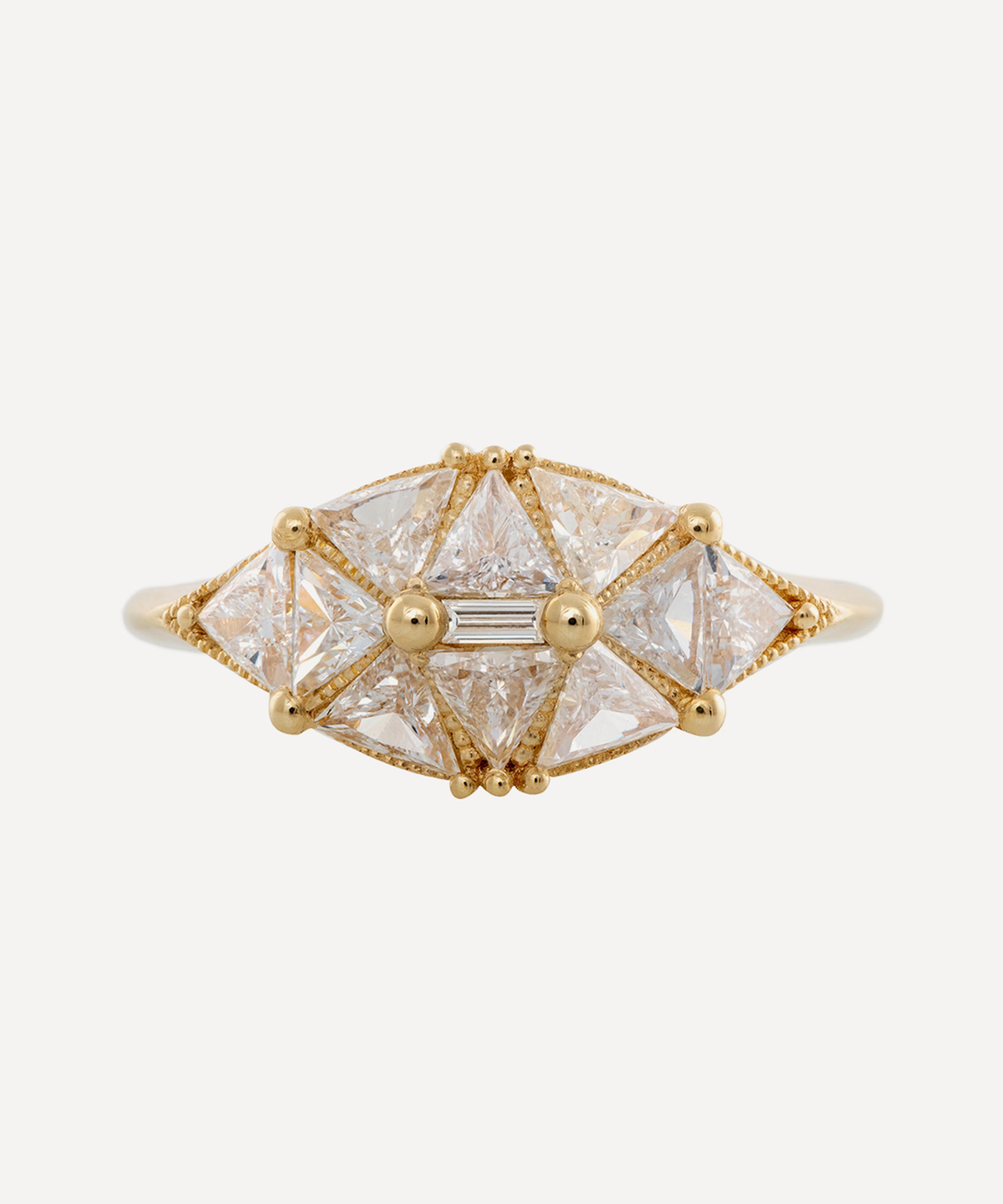A symbol of love and dedication, this ring is crafted from solid 18ct gold, featuring a baguette-cut centre diamond, framed by ten triangle-cut diamonds – offering a stunning sparkle from every angle. Capturing a modern take and a classic design, it makes for an exquisite engagement option. Style it solo, stack it with a wedding band or team it with other gem encrusted rings for a glittering curation that’s out of this world.