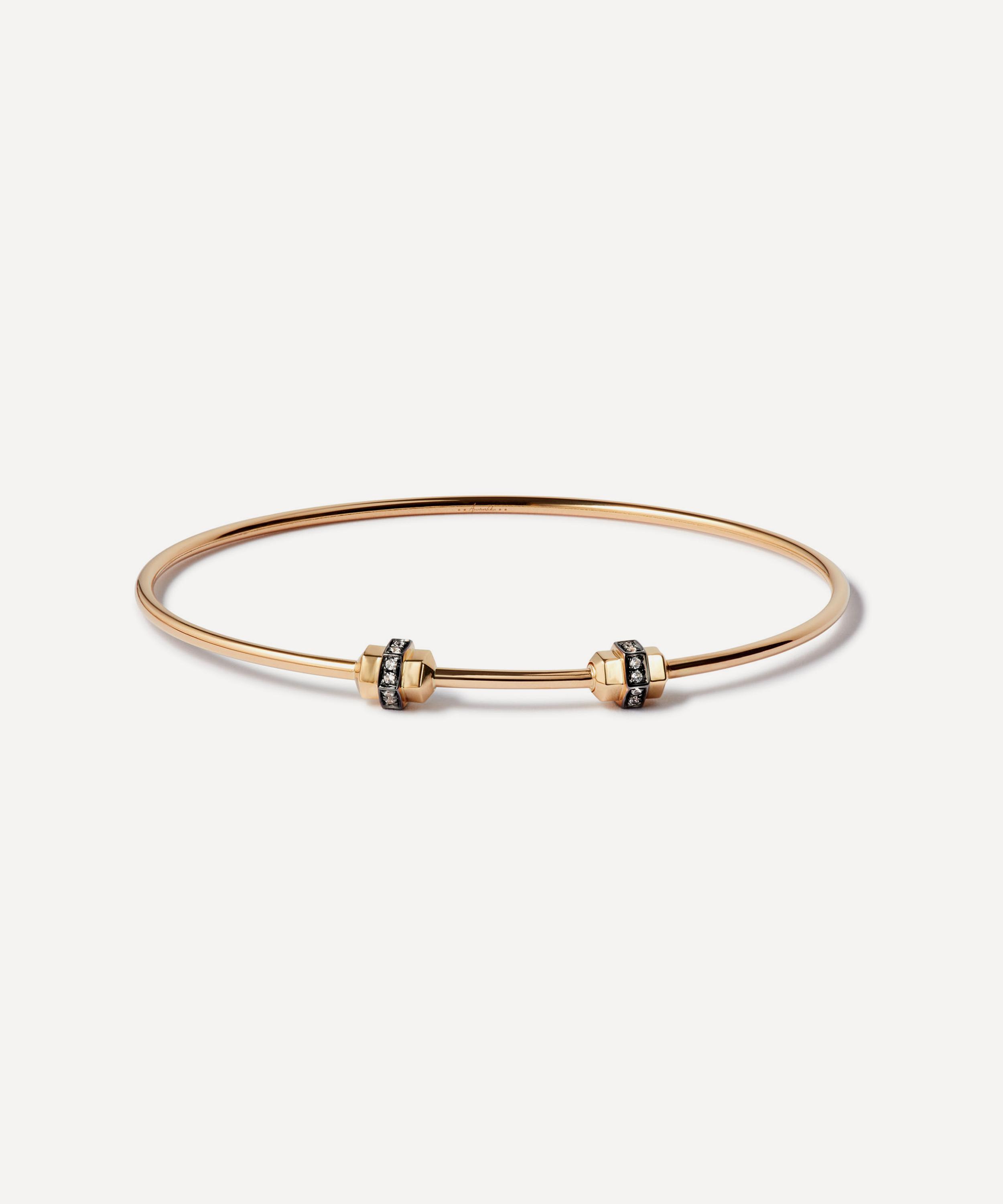Build your own elevating stack with this elegant bangle bracelet from Annoushka. Crafted from 18ct gold, it features a sleek silhouette designed with a screw nut clasp adorned with sparkling white sapphires. Wear it as a solo piece for a minimalistic approach or style it with other chains, bangles and cuff bracelets.