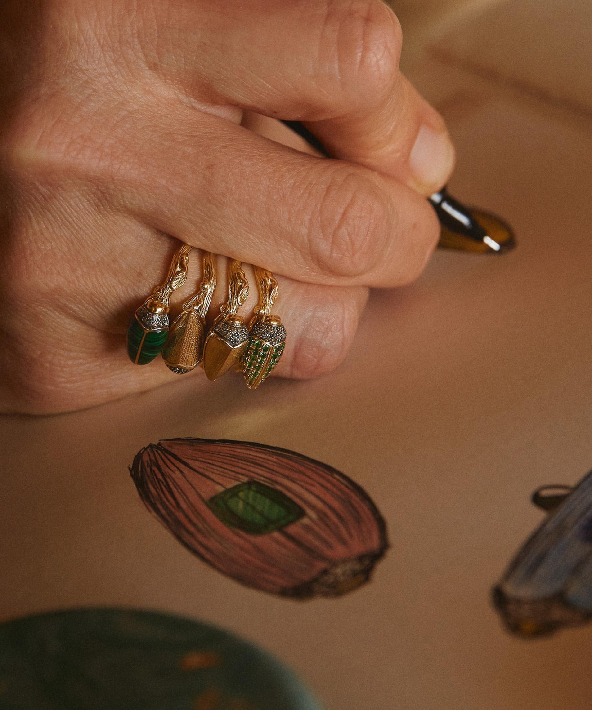 Inspired by the auspicious and powerful symbols in Egyptian mythology, this piece captures a diamond embellished scarab beetle encased in sterling silver and malachite stone. Sitting atop a textured, branch-inspired band in 18ct gold, it evokes timeless beauty and meaning – representing renewal and protection. Whether styled in a curated ring stack, or as a statement piece, wear it as a symbol of your own evolution – untamed, unapologetic, and entirely unique.