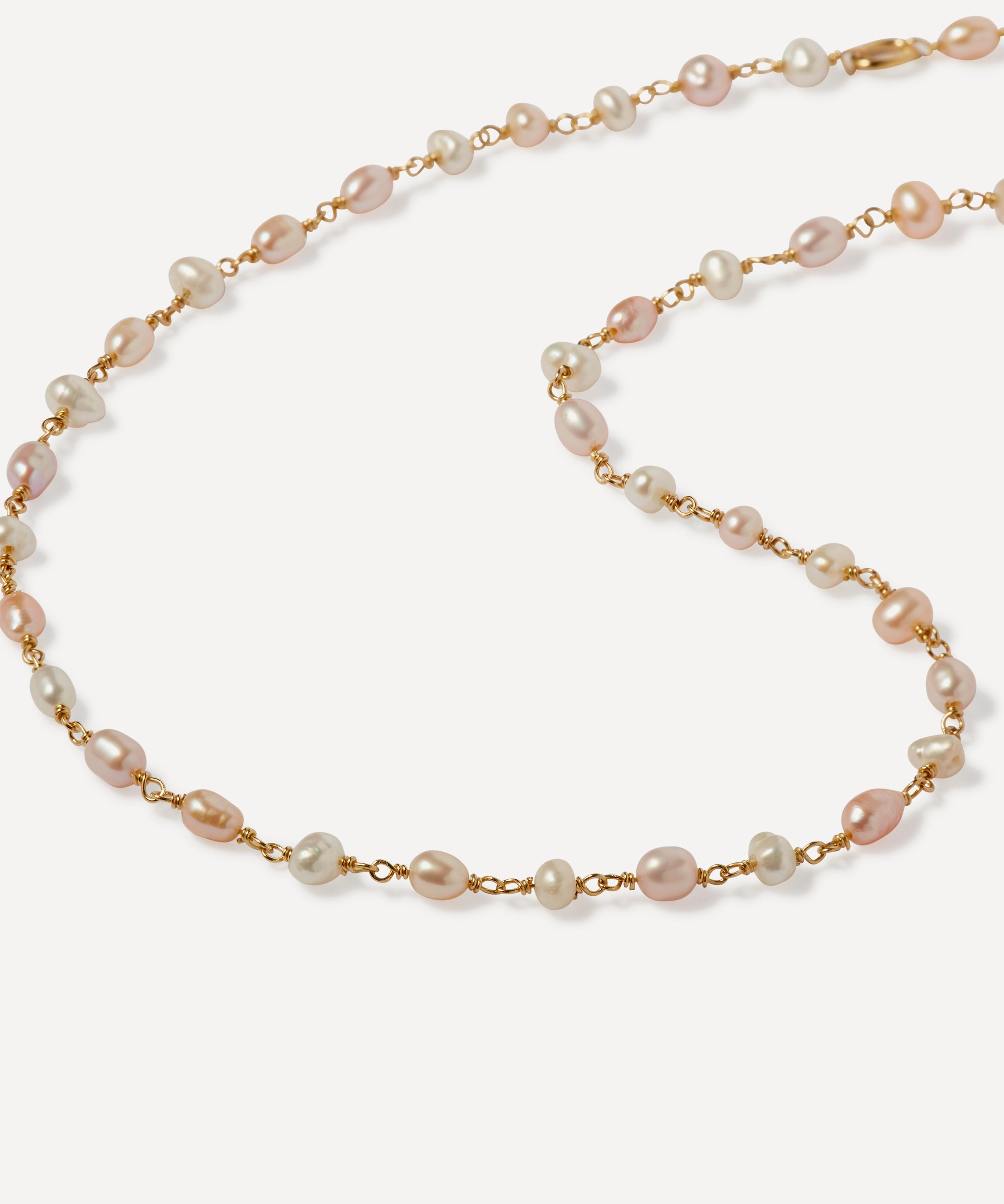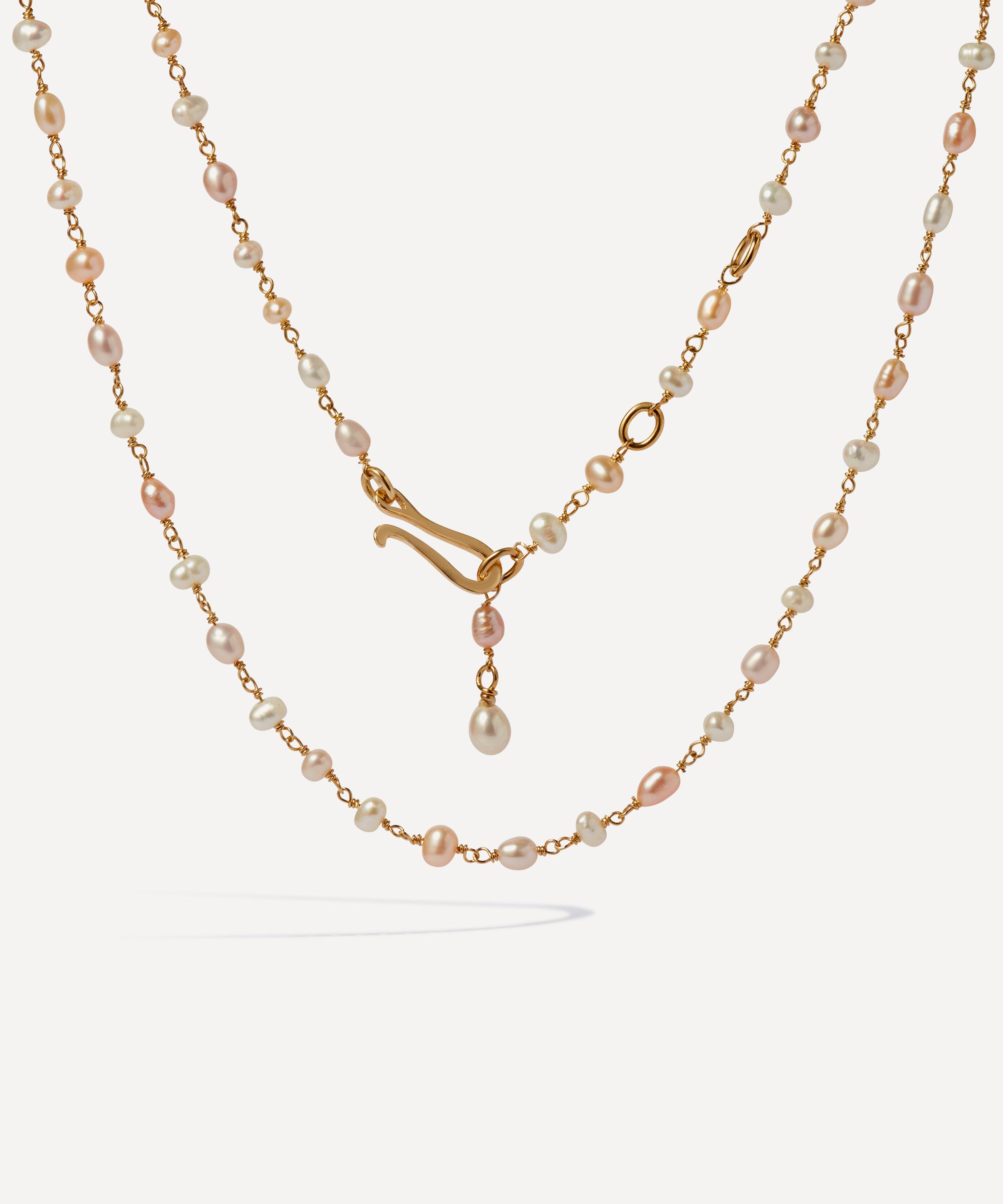 Build your own elevating chain stack with this elegant necklace from Annoushka. Crafted from 18ct gold, it features delicate link chain hand-threaded with freshwater seeds pearls in pastel shades of peach, pink, and creamy white. Wear it as a solo piece for a minimalistic approach or style it as part of a mixed-length stack.