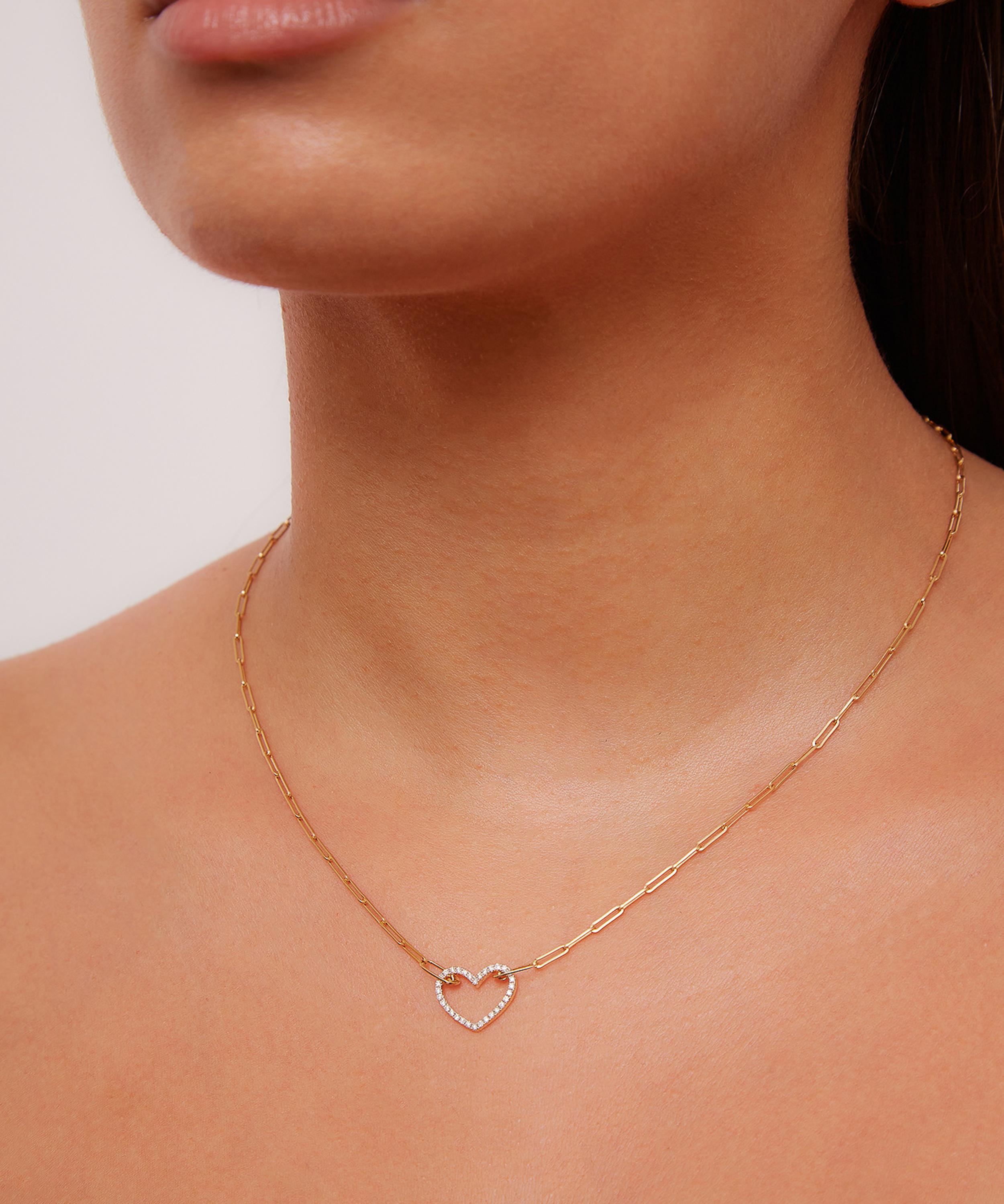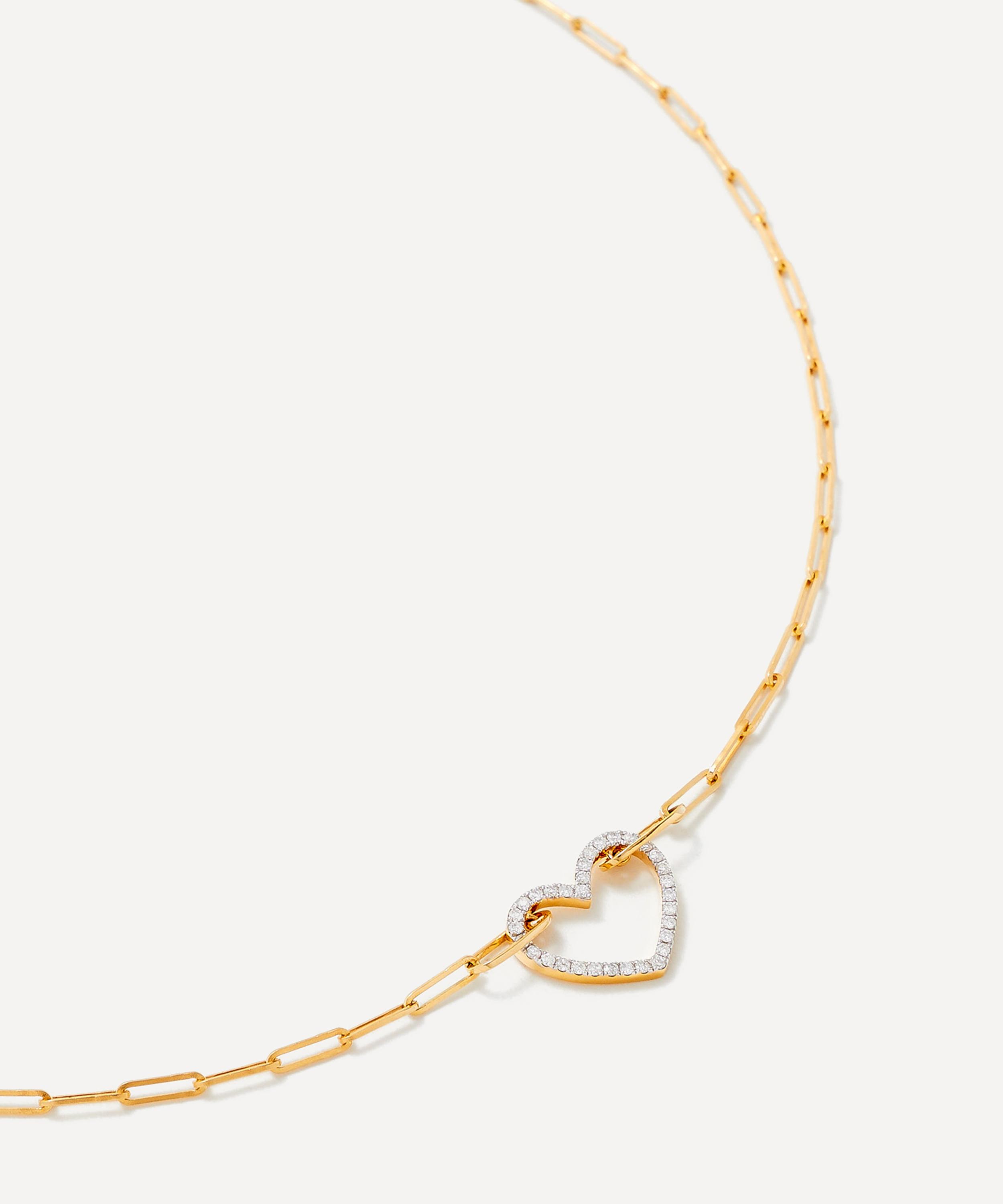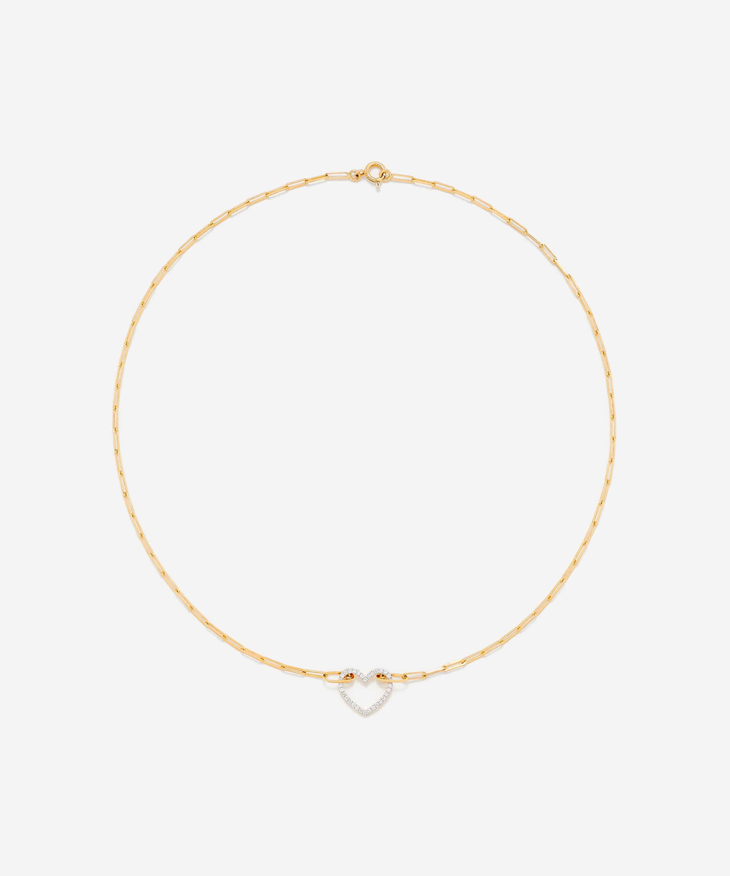 Delve into a world of vintage classics and tie your whole look together with this pendant necklace from Yvonne Léon. Crafted from 18ct gold, the designer beautifully unites vintage charm with a modern reinvention in this piece – featuring a paperclip chain and diamond encrusted heart pendant. Wear it on its own or mix and match with other eccentric necklaces from the brand.