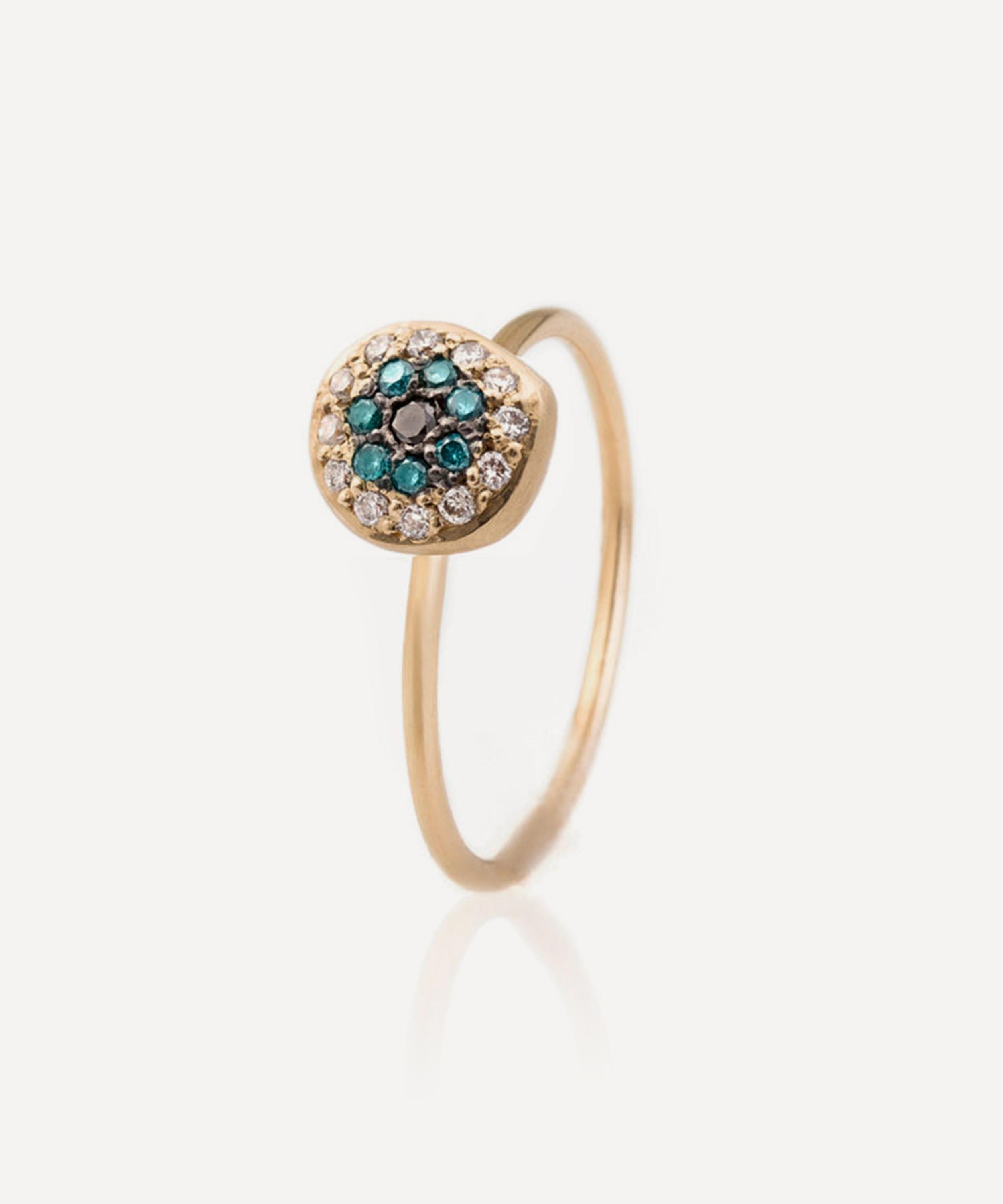 Infusing your look with a bold femininity, Nada Ghazal’s Small Healing Eye Ring will become a staple in your collection. Crafted from solid 18ct gold, it’s characterised by a slim band and a round-shaped feature adorned with black, blue, and champagne diamonds. Together, the stones create a central eye motif – known as a healing eye to give the wearer the strength to grow from within. Team it with other bold feminine pieces from the designer to build your own powerful narrative of jewels.
