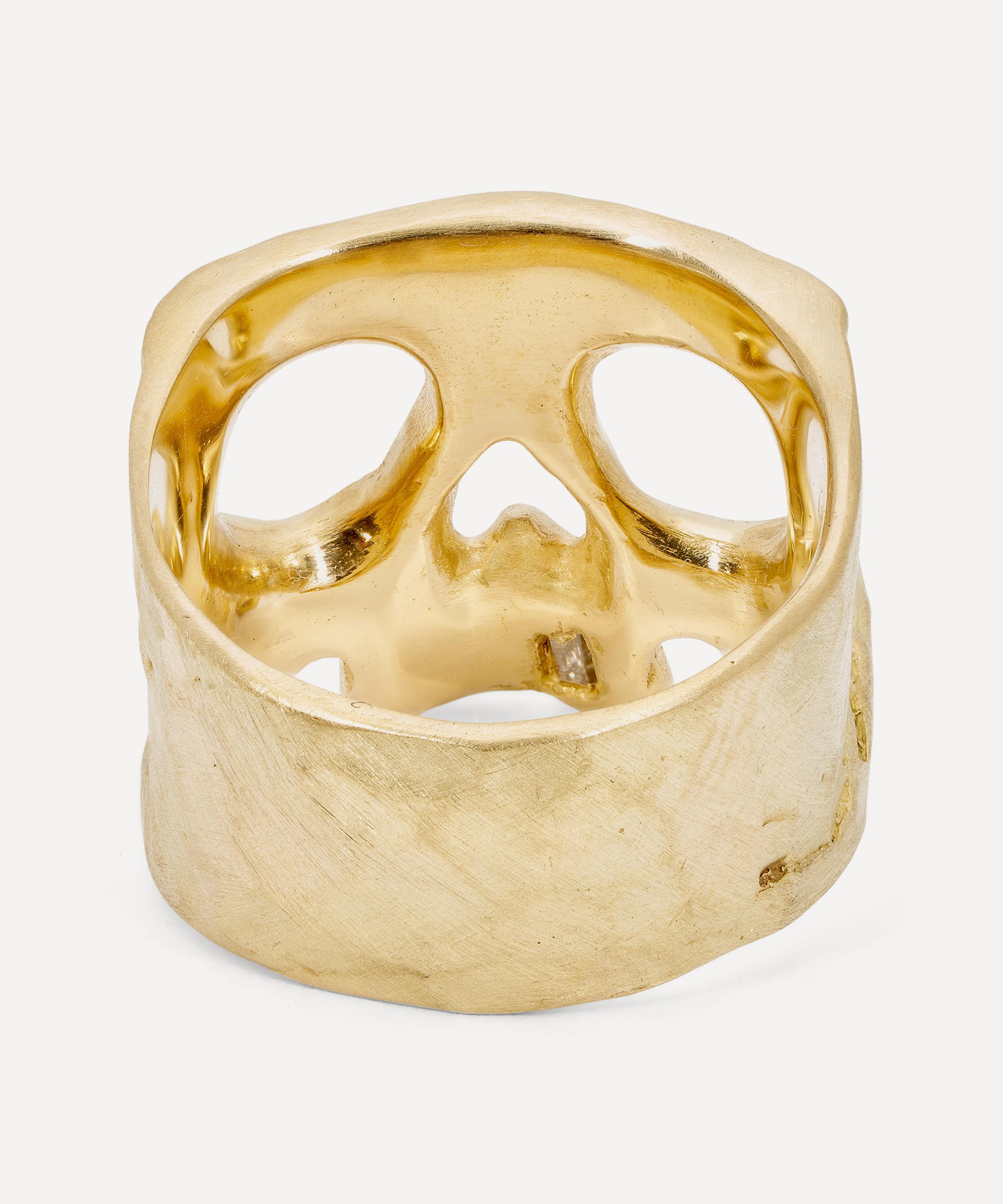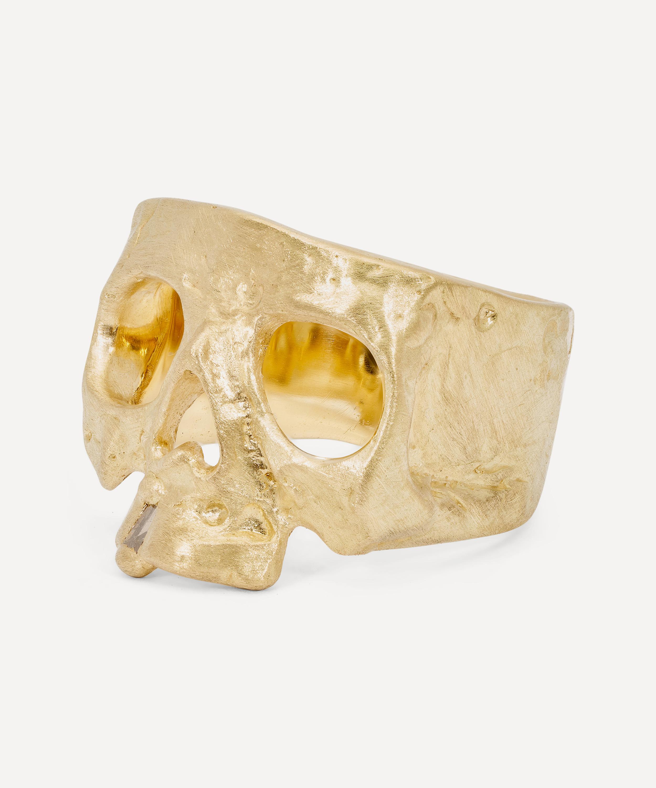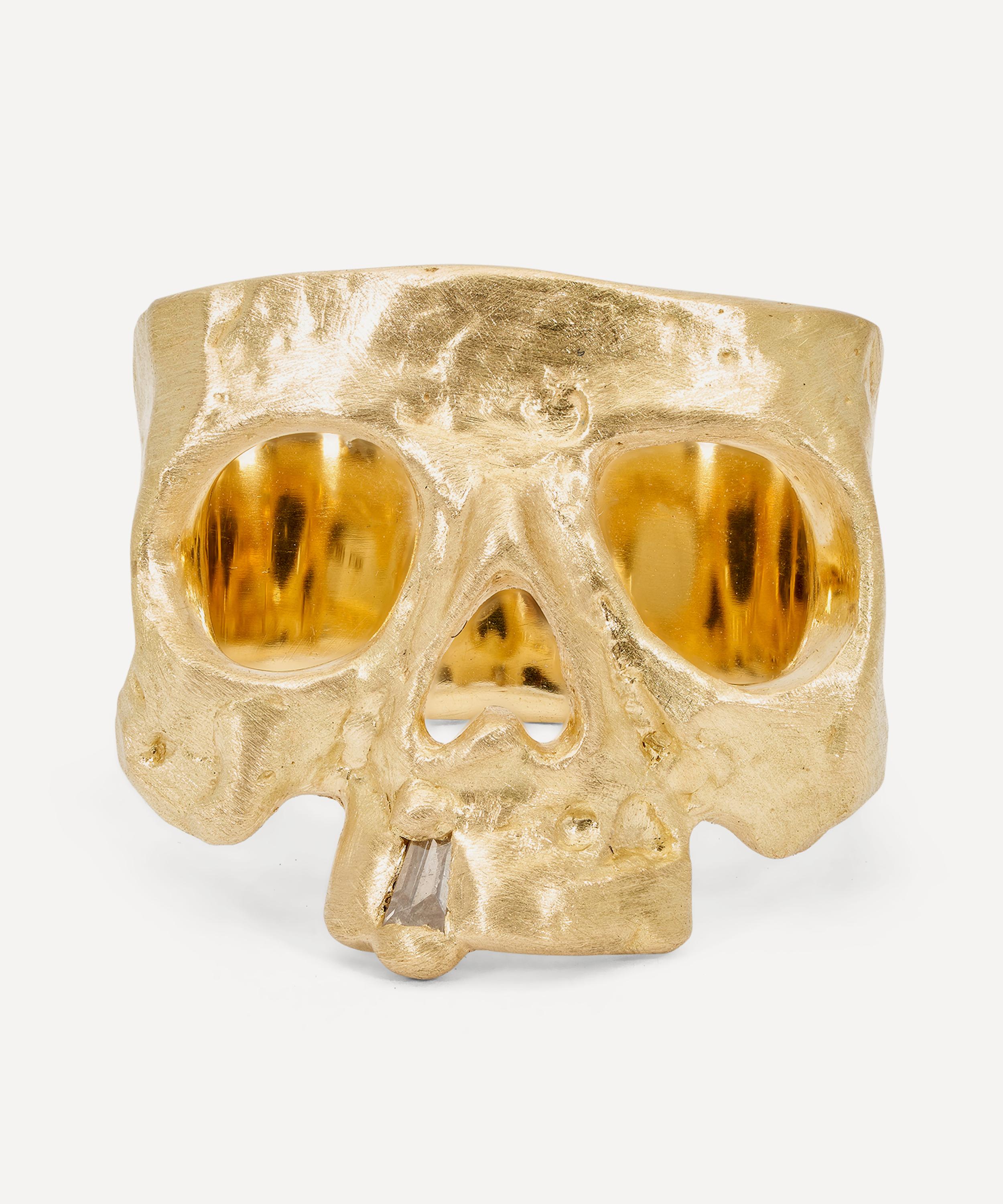 Epitomising the British designer’s signature tough-luxe aesthetic, this Snaggletooth Skull ring by Polly Wales is boasting a unique statement piece to add to your collection. Crafted from solid 18 carat gold, this gothic-inspired ring features a wide tapered band that has been sculpted into a molten skull design, adorned with a single baguette-cut, white diamond tooth.