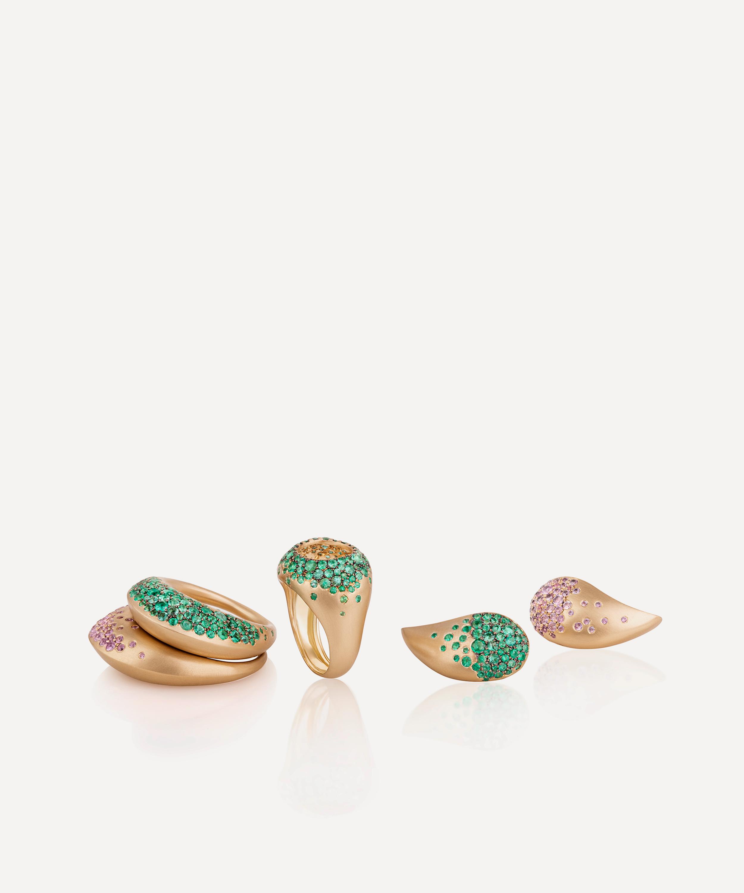 Crafted from brushed 18ct gold, it exhibits an arch-shaped silhouette embellished with a scattering of sparkling pink sapphires. Perfect for gifting, it can be styled as a statement piece, stacked with an assortment of your favourite rings, or teamed with a coordinating pair of earrings from the Spellbound collection.