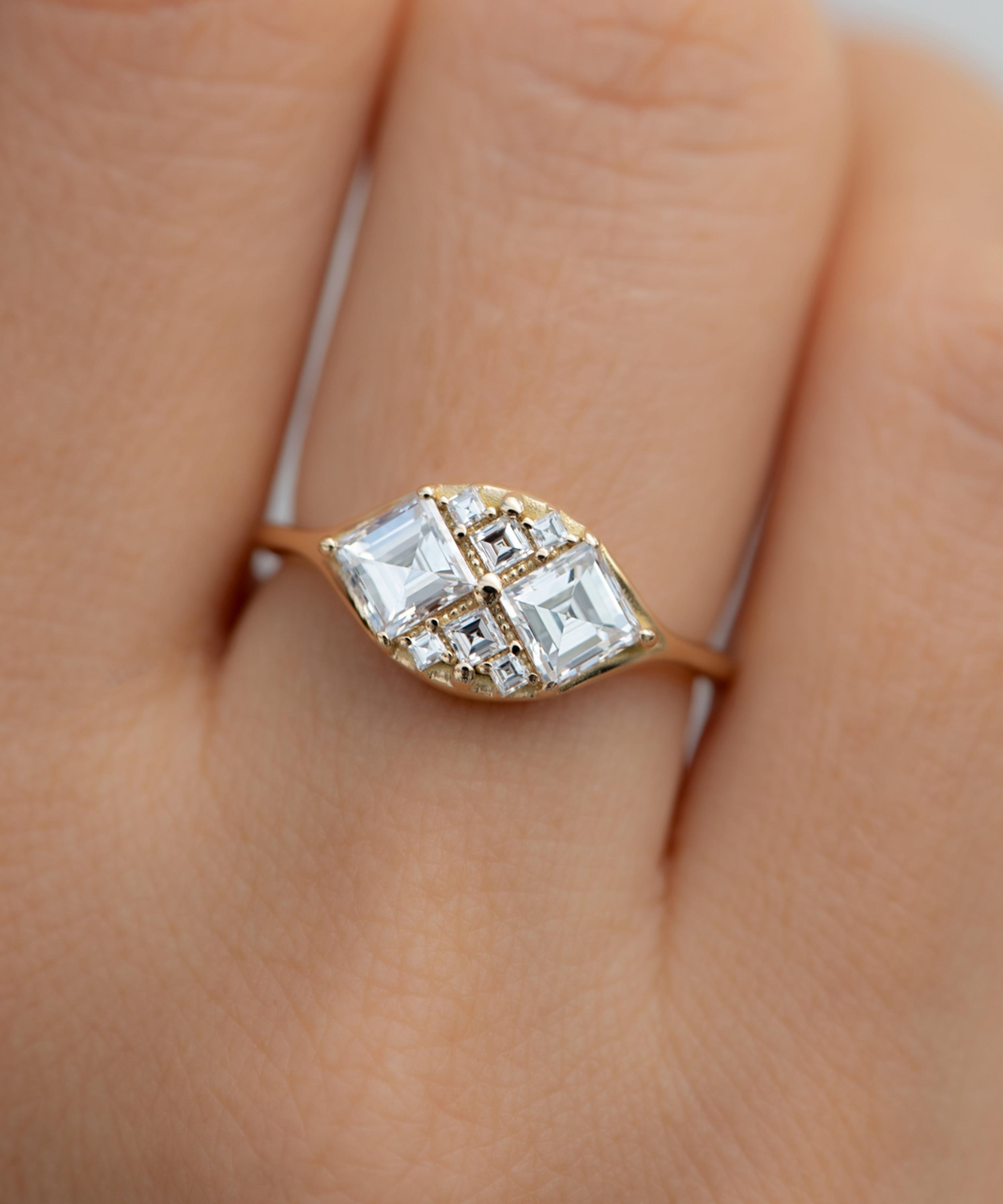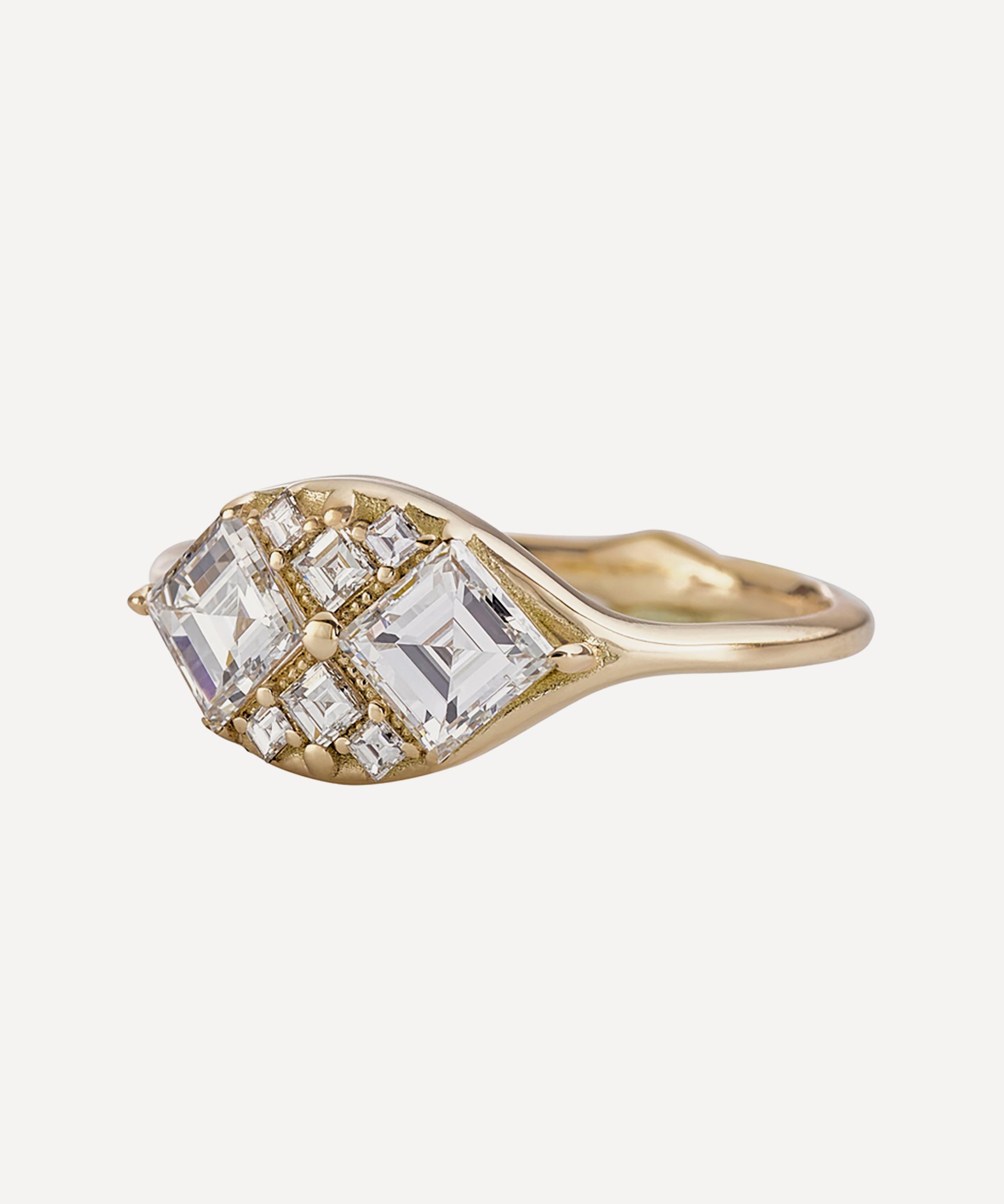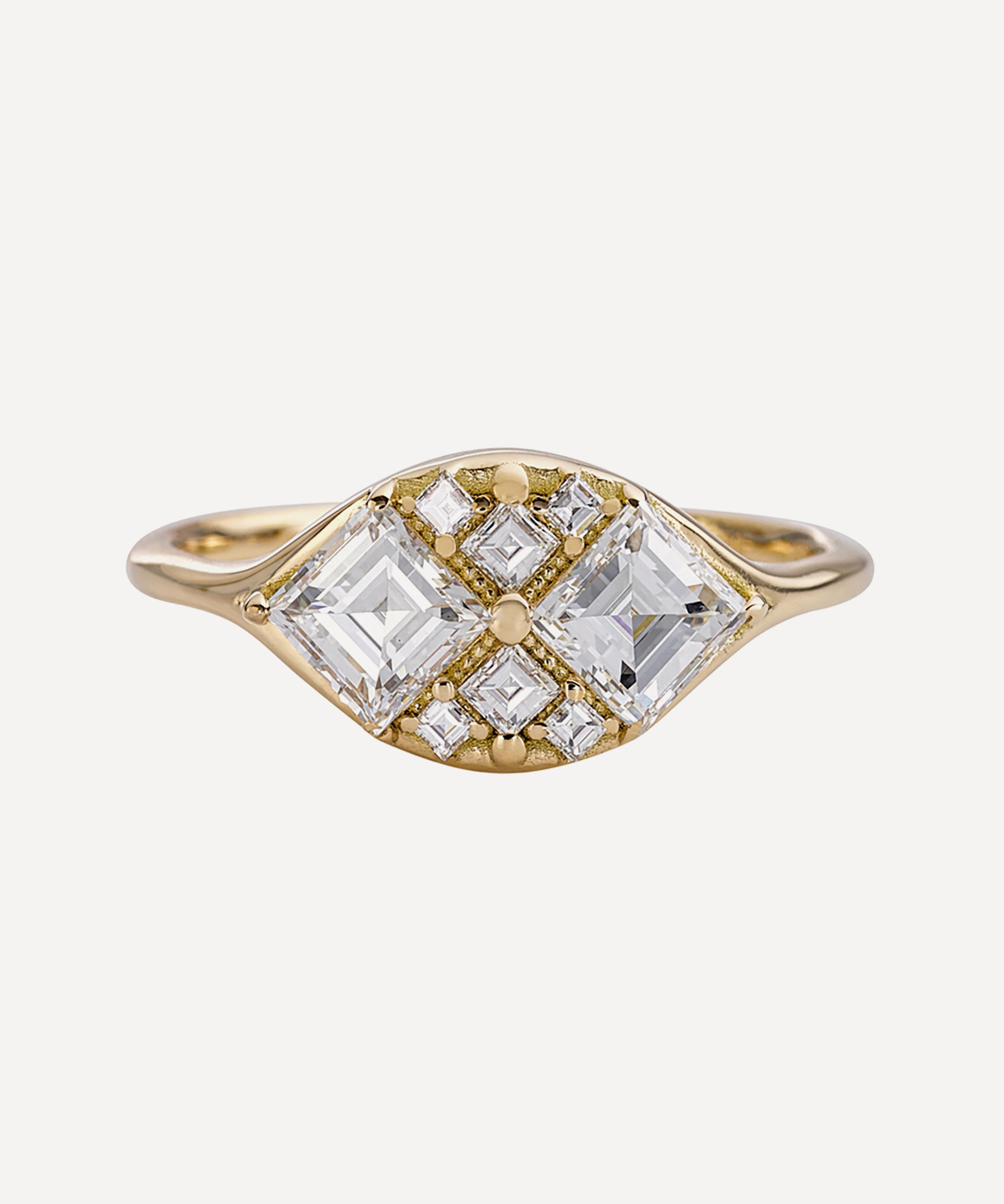 This engagement ring from fine jewellery brand Artemer exemplifies the designer’s expert eye for stunningly cut gems and divine compositions. A symbol of love and dedication, it’s crafted from solid 18ct gold, featuring eight square diamonds, inspired by the elegance and geometry of Art Deco. The stones are arranged in a balanced composition with two impressive ~0.5 carat diamonds in the centre with distinct steps the lead the eye deep inside the stone. Style it solo, stack it with a wedding band or team it with other gem encrusted rings for a beautiful curation that’s out of this world.