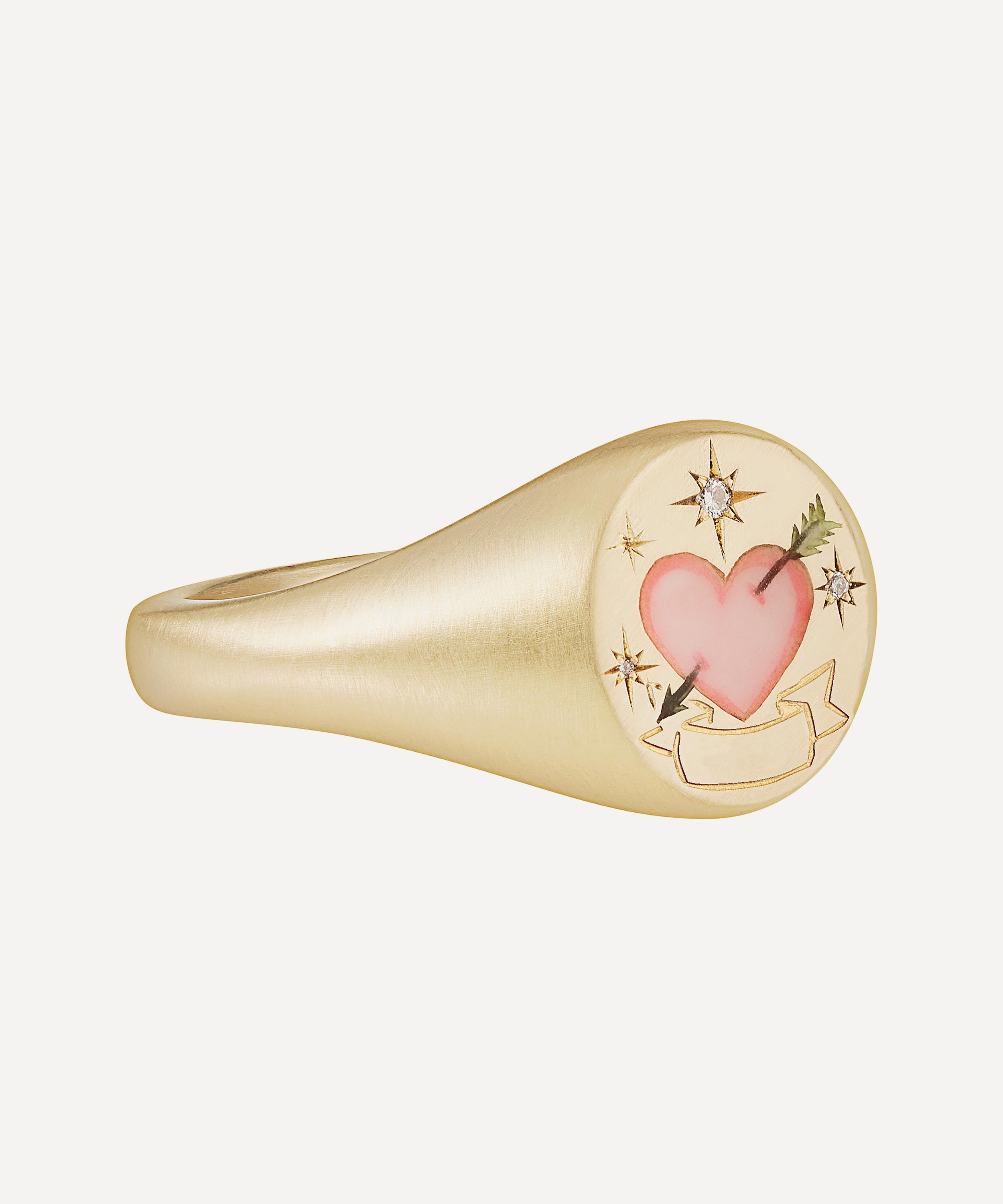 Handmade in London from frosted 18 carat gold, this signet ring features an oval-shaped face with a tattoo-inspired, hand-painted enamel heart pierced with Cupid's arrow. The design is finished with three star-set white diamonds and an engraved banner along the bottom. A wearable work of art, it's perfect for gifting or adding to your own jewellery line-up - style it solo or mix and match with other favourites.