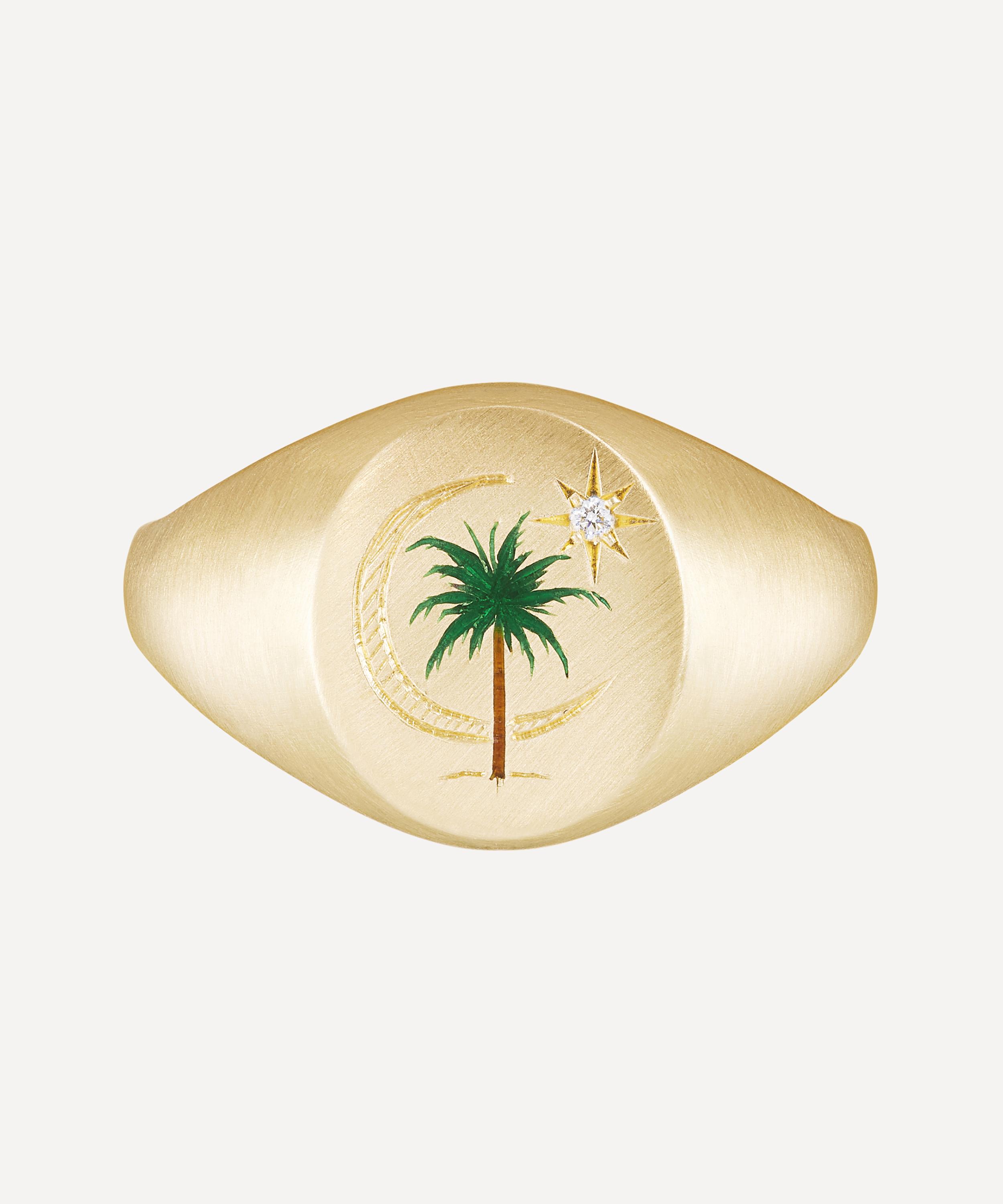 Handmade in London from frosted 18 carat gold, this signet ring features an oval-shaped face with a hand-painted enamel palm tree in front of an intricately engraved crescent moon. The miniature scene is finished with a single star-set diamond for the slightest hint of sparkle. A wearable work of art, it's perfect for gifting or adding to your own jewellery line-up - style it solo or mix and match with other favourites.