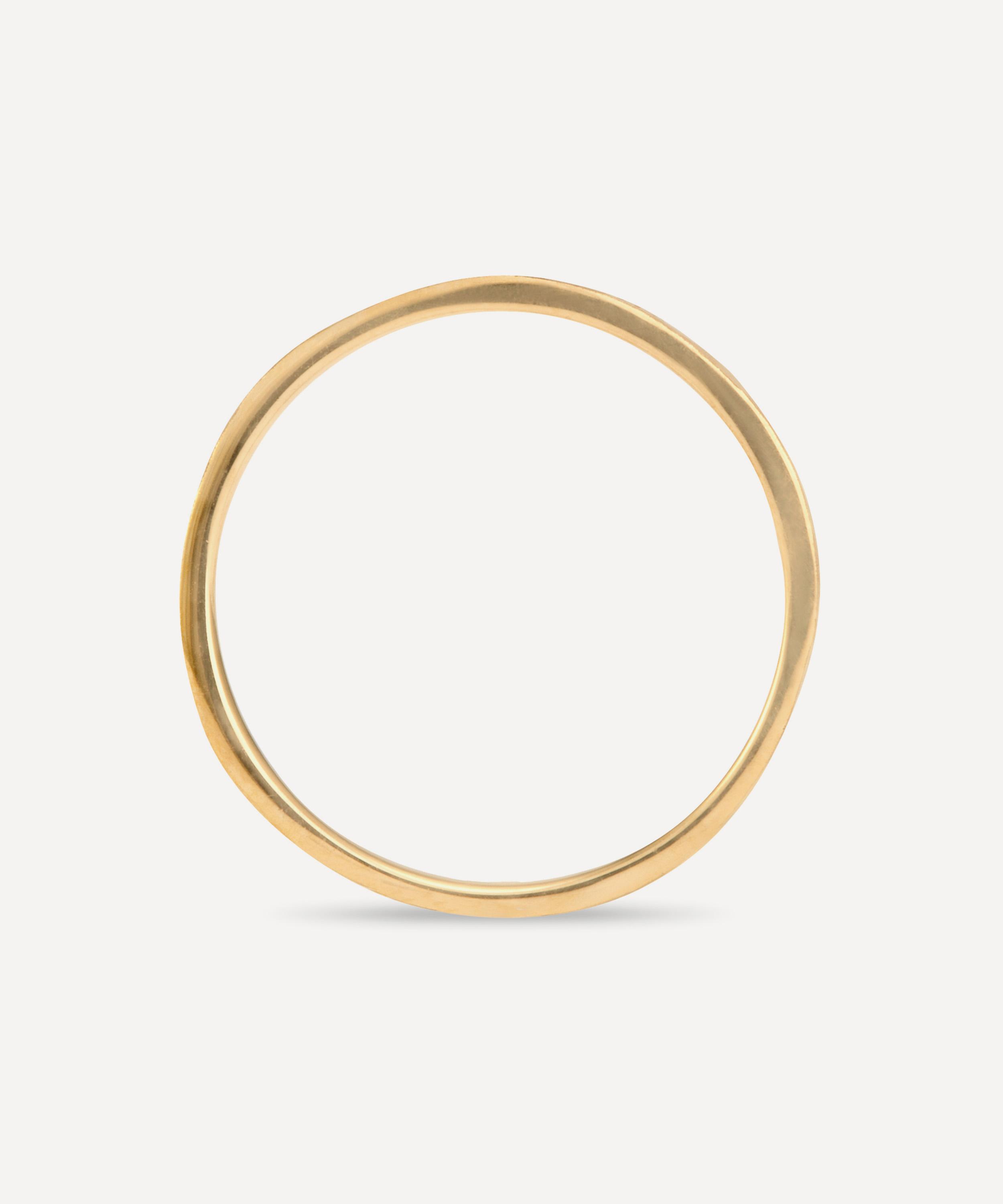 Handcrafted from solid 18ct gold, this versatile ring features a thin band in a matte, hammered texture, offering a rustic yet elegant aesthetic. Exemplifying the designer’s truly timeless approach to everyday jewellery, it can be styled on its own or stacked with additional bands and gem encrusted rings for a combination that caters to your personal style.