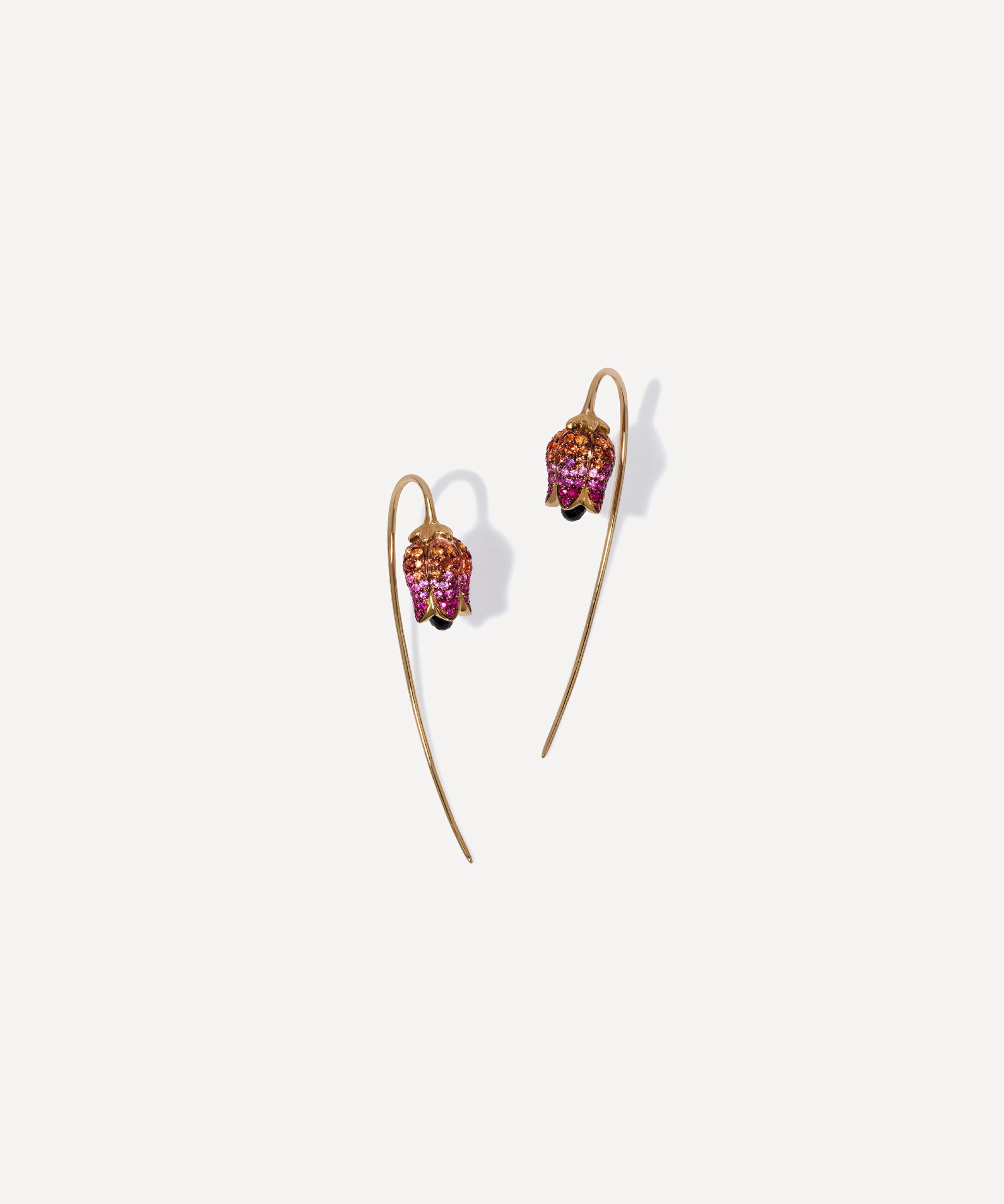 Inspired by the elegance of a blooming tulip, this intricately handcrafted pair feature sculptural petals in 18ct gold with pink and orange sapphires, beautifully enhanced by a tiny briolette spinel emerging from the downward bloom for a subtly swaying shimmer. Complete with sleek French hooks, they can be styled solo or paired with a selection of hoops and studs.