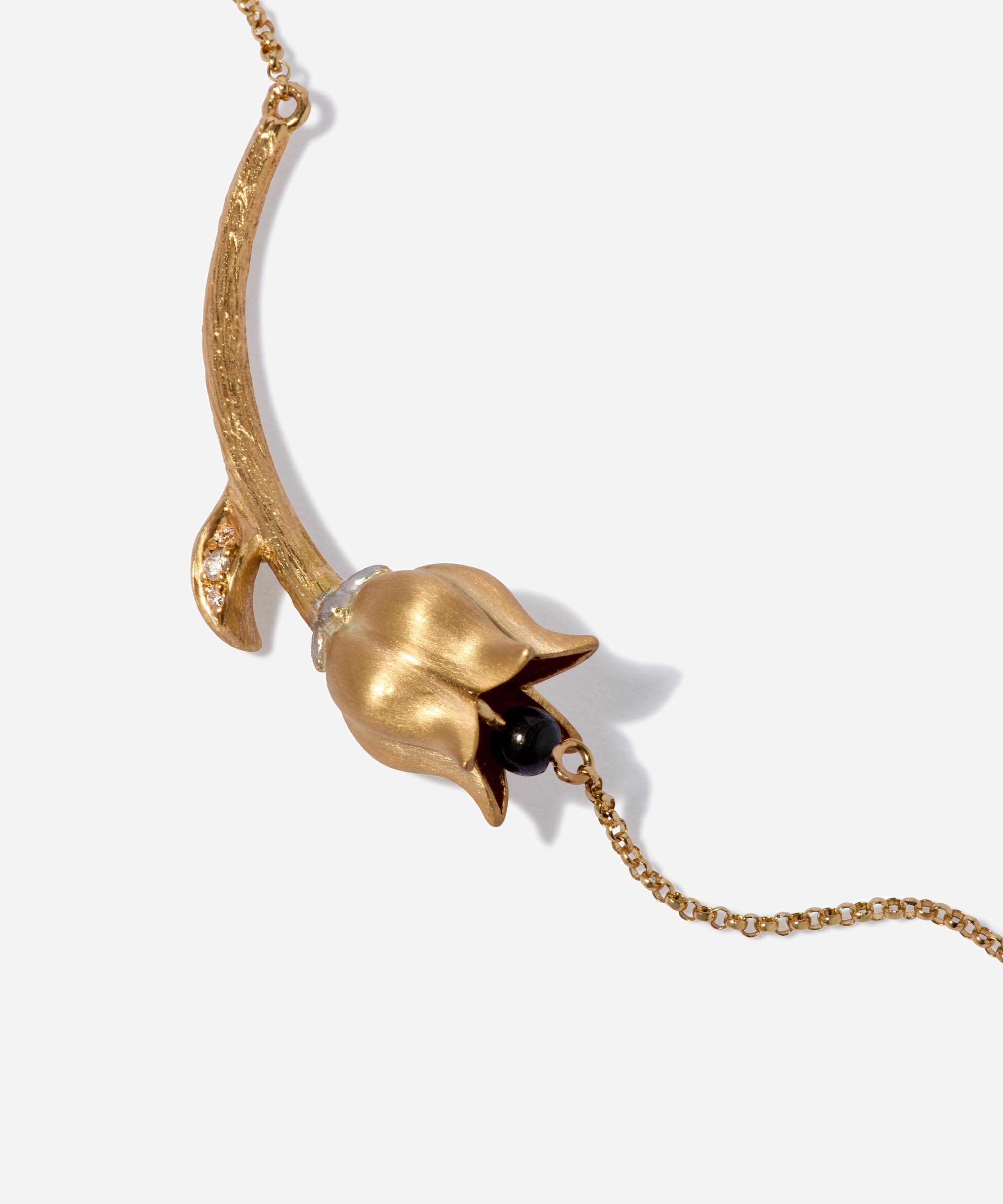 Inspired by the elegance of a blooming tulip, this intricately handcrafted piece features sculptural petals in 18ct gold and a briolette spinel, beautifully enhanced by a textured leaf set with a trio of diamonds and a curved stem. Capturing the essence of spring, it makes for a special edition to your jewellery collection, perfect for both occasion wear and everyday looks.