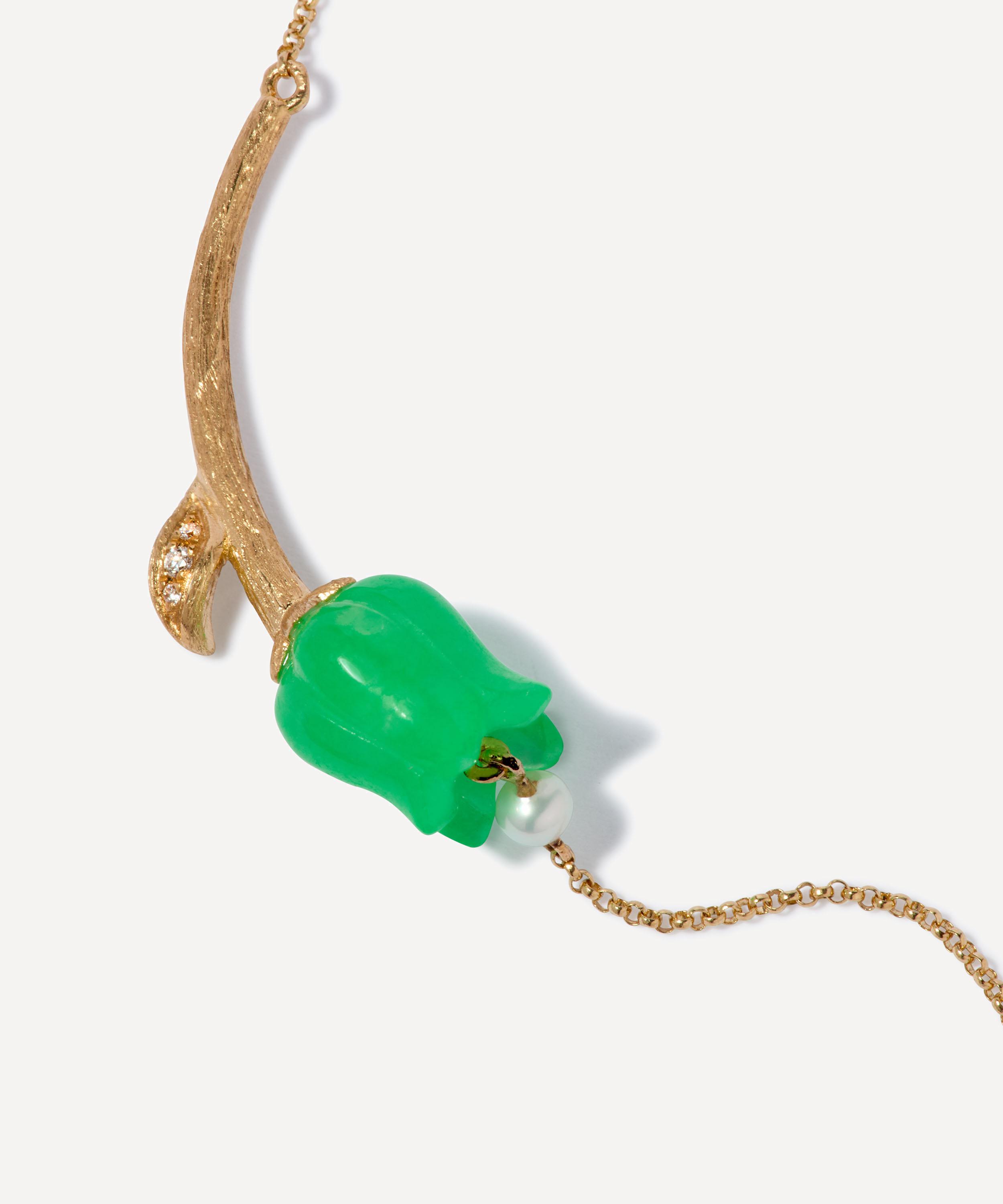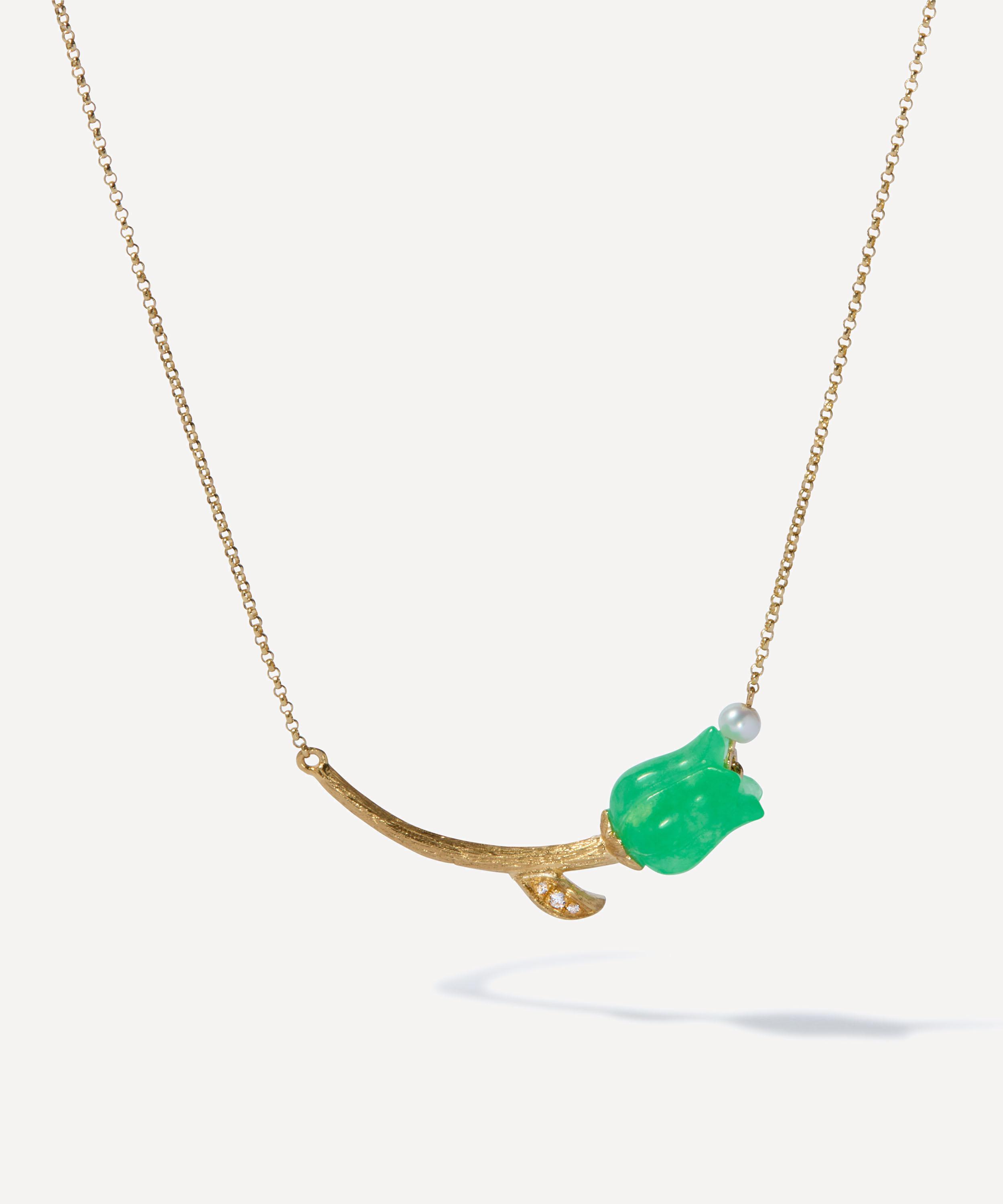 Inspired by the elegance of a blooming tulip, this intricately handcrafted piece features sculptural green jade petals and a freshwater pearl, beautifully enhanced by a textured leaf set with a trio of diamonds and a curved stem in 18ct gold. Capturing the essence of spring, it makes for a special edition to your jewellery collection, perfect for both occasion wear and everyday looks.