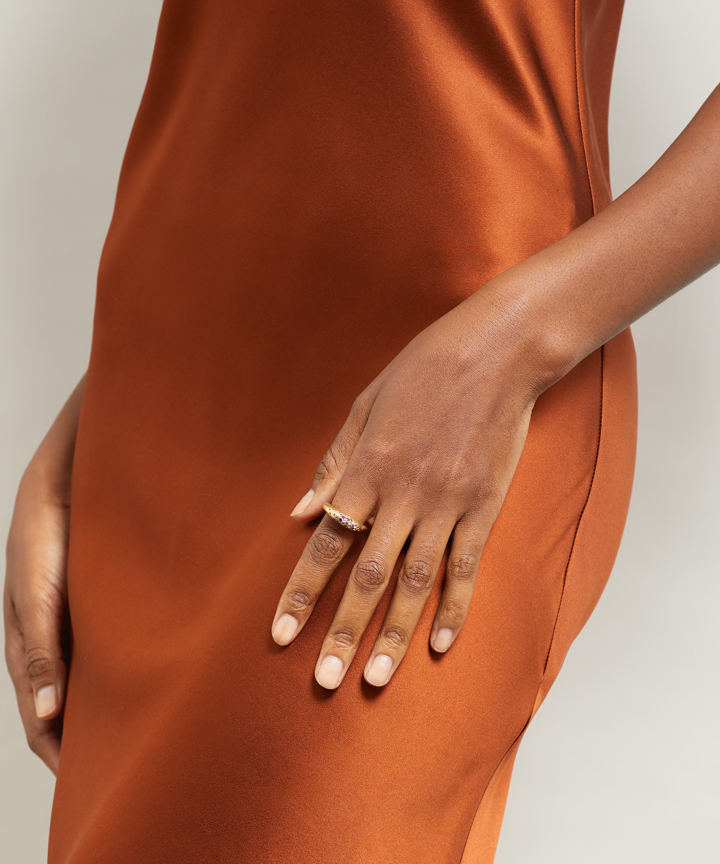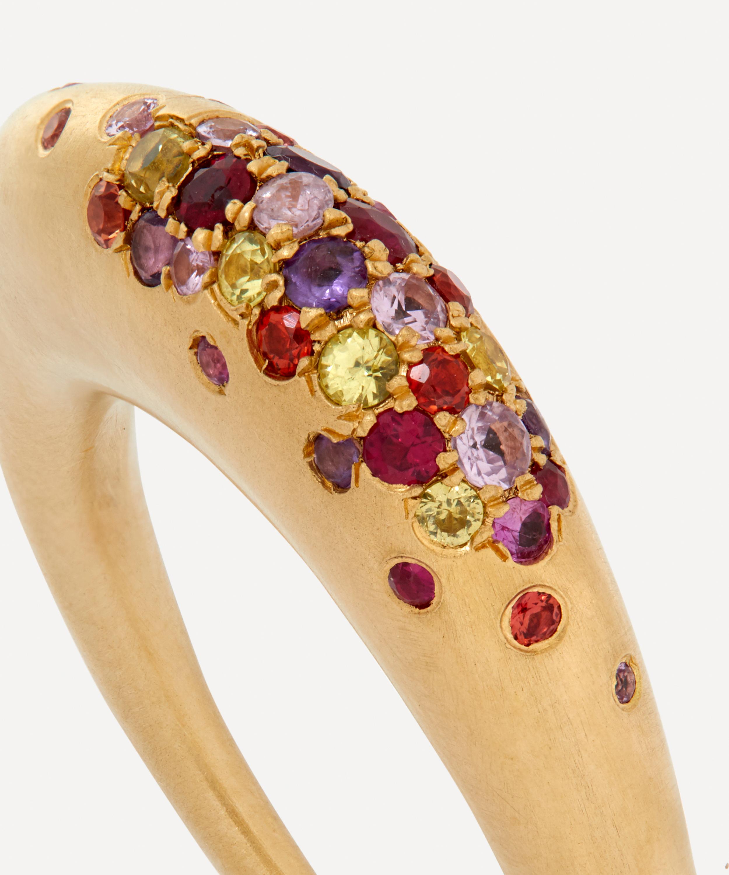 Intricately handcrafted from solid 18 carat gold in the brand’s Beirut-based Atelier, this ring is shaped to a curvaceous, dome silhouette and adorned with a scattering of multicoloured sapphires. Imbued with feelings, memories and experiences, each one of Nada Ghazal’s award-winning designs tells a universal story. Layer the designer’s bold feminine pieces together to build on your own powerful narrative.