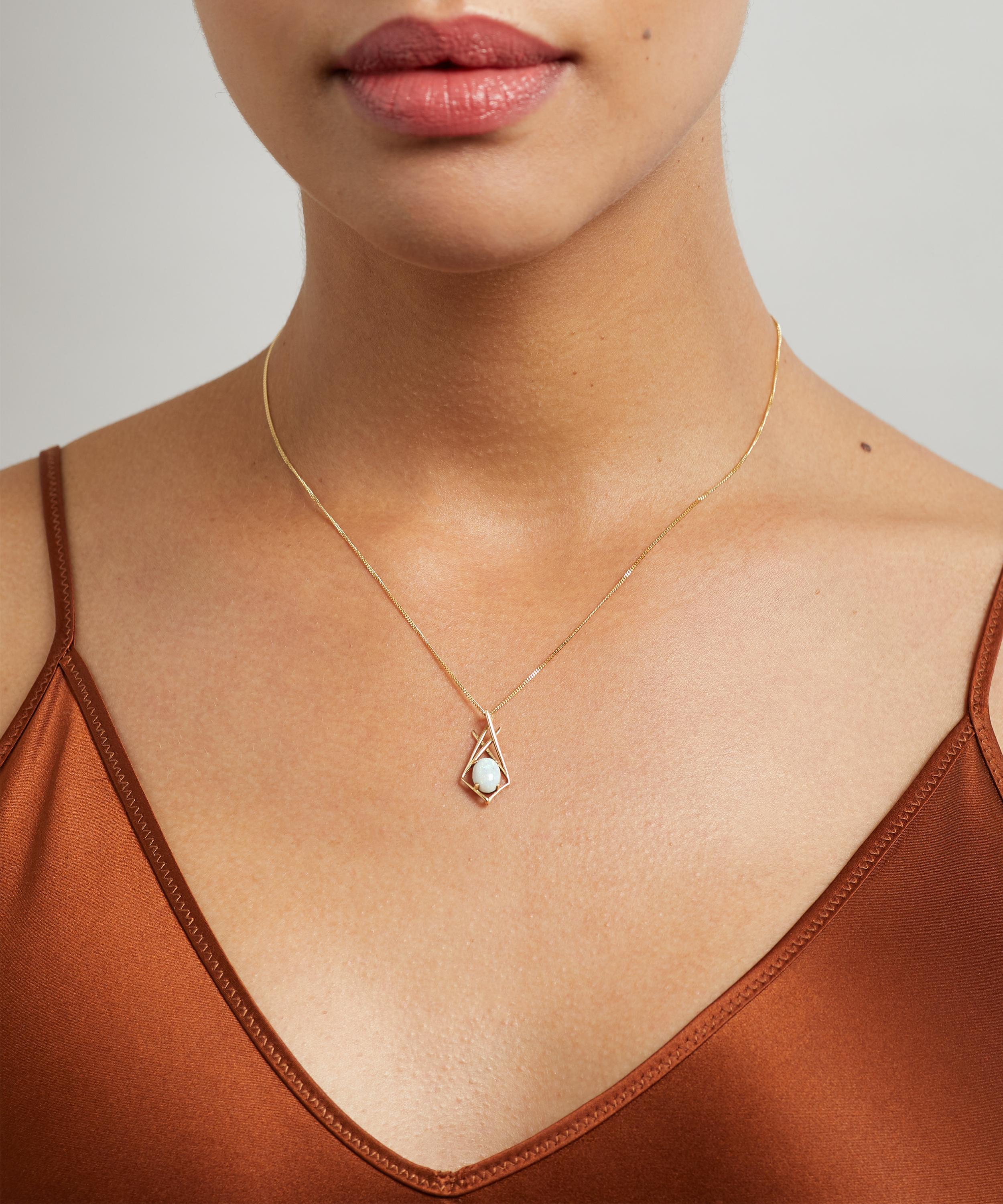 Crafted from 14 carat gold, this necklace features a lavish oval-cabochon cut opal set in a brutalist kite-shaped pendant. A beautifully contrasted design where the sharp lines of the pendant collide with the curved opal – offering an abstract and lively curation. This one-of-a-kind piece is complete with a fine chain, making it the perfect everyday accessory to elevate your daily attire.