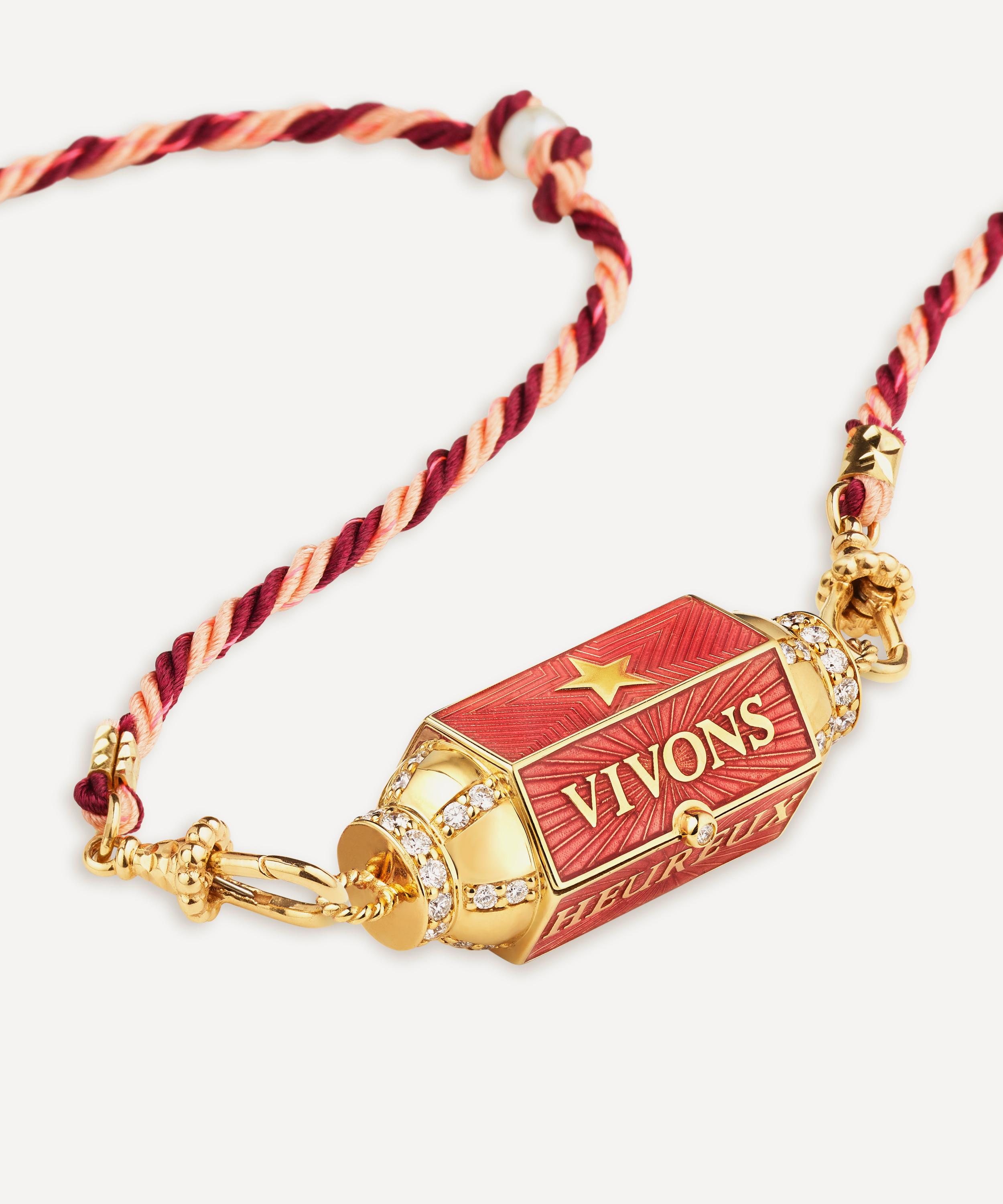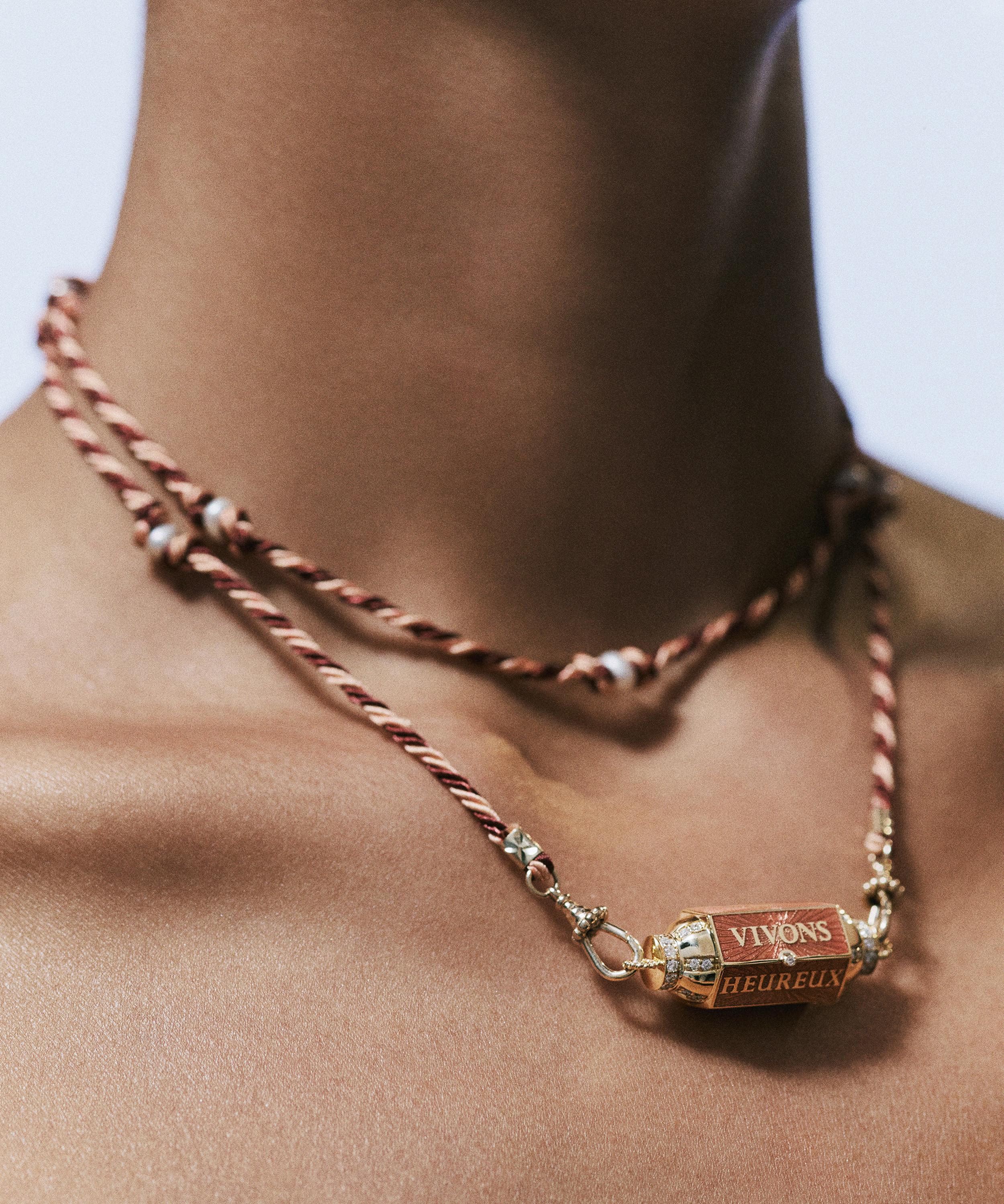 Expertly crafted from 18ct gold, this necklace features a double-loop Mauli link with freshwater pearls and a handcuff finish at each end. At the centre hangs a large barrel pendant in a sparkling gold finish featuring diamond set detailing and an enamel heart to the inside, accompanied by the inscription ‘Vivons heureux, vivons caches.