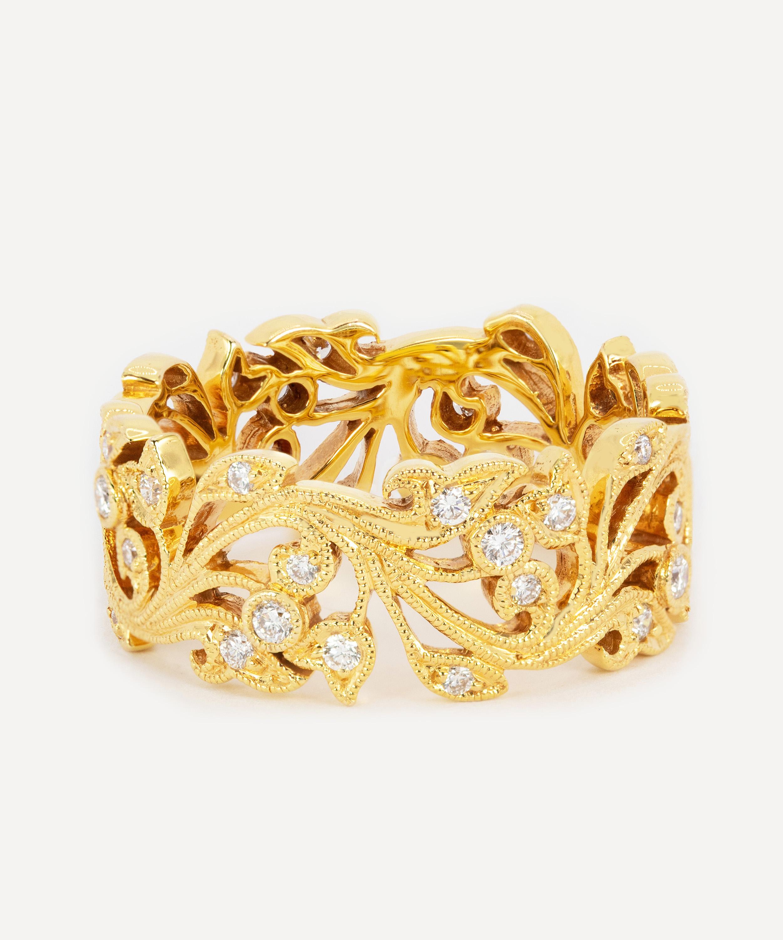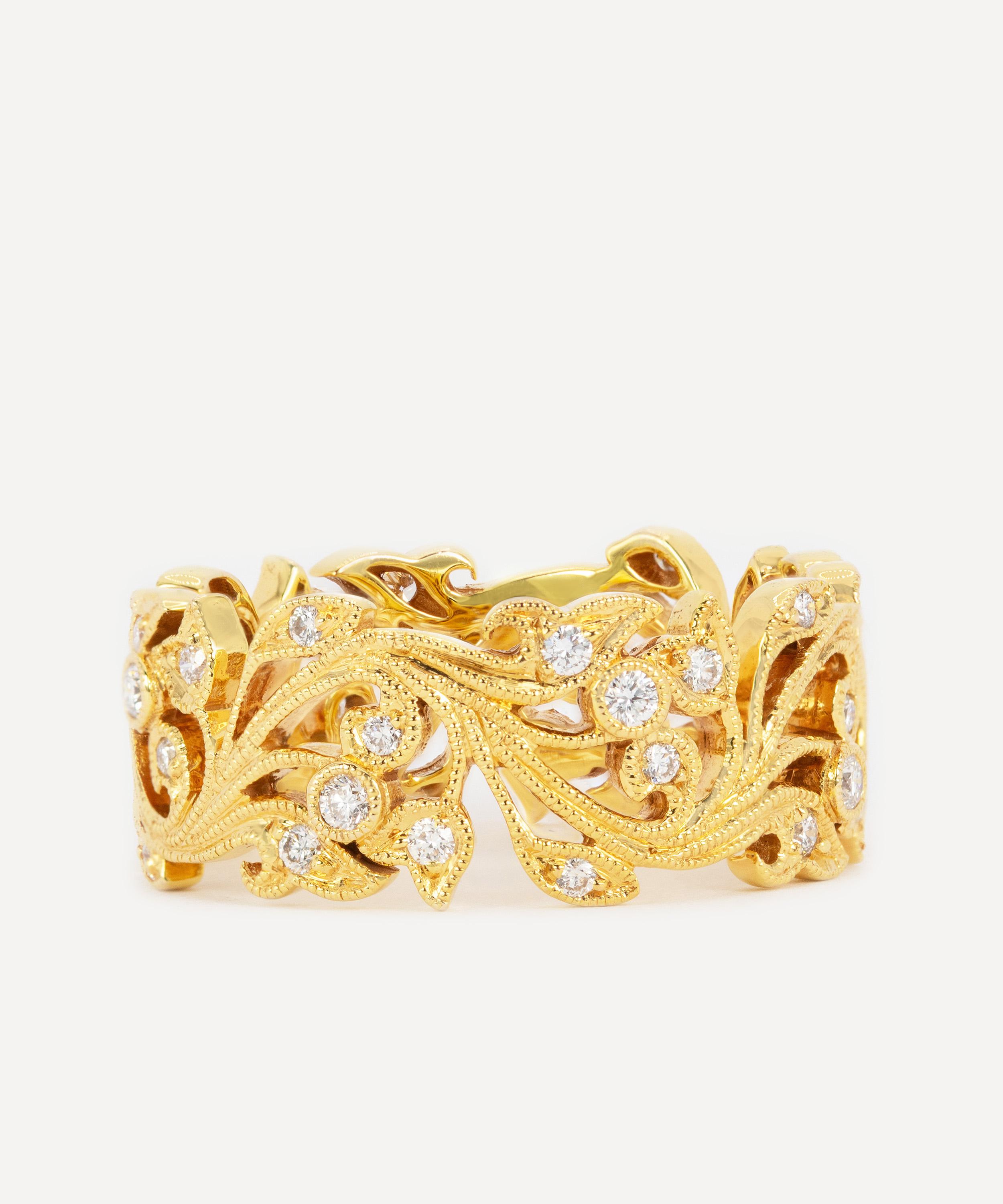 This beautiful ring is another one-of-a-kind ring from antique purveyor Kojis. Crafted from 18ct gold, it’s characterised by a wide silhouette with an intricate floral pattern, adorned with multiple round brilliant cut diamonds with a milgraine finish.