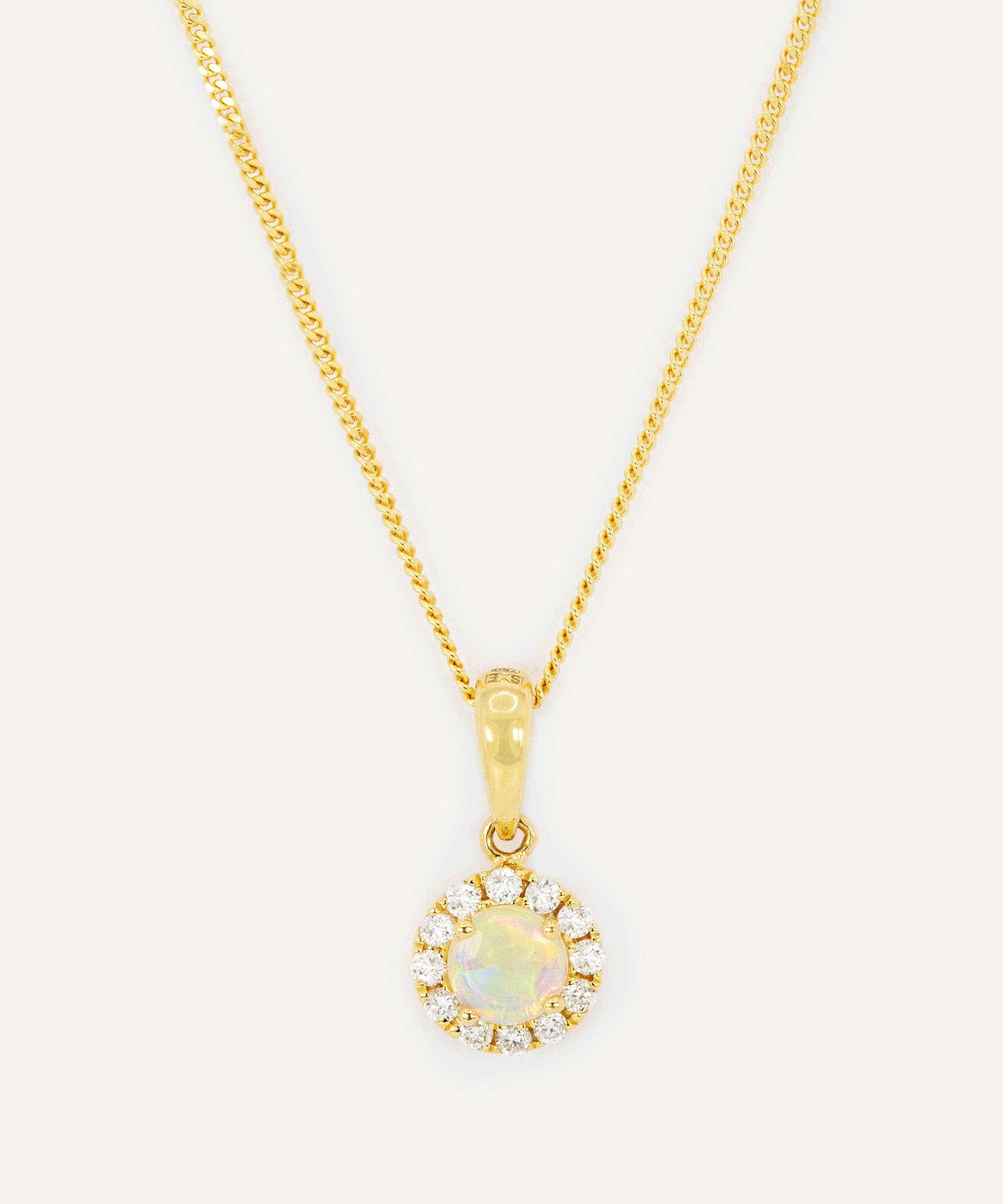Add a touch of sparkle to your edit with this pendant necklace from antique purveyor Kojis. Crafted from 18ct gold, it features a cabochon opal centre surrounded by a halo of pave-set melee diamonds.
