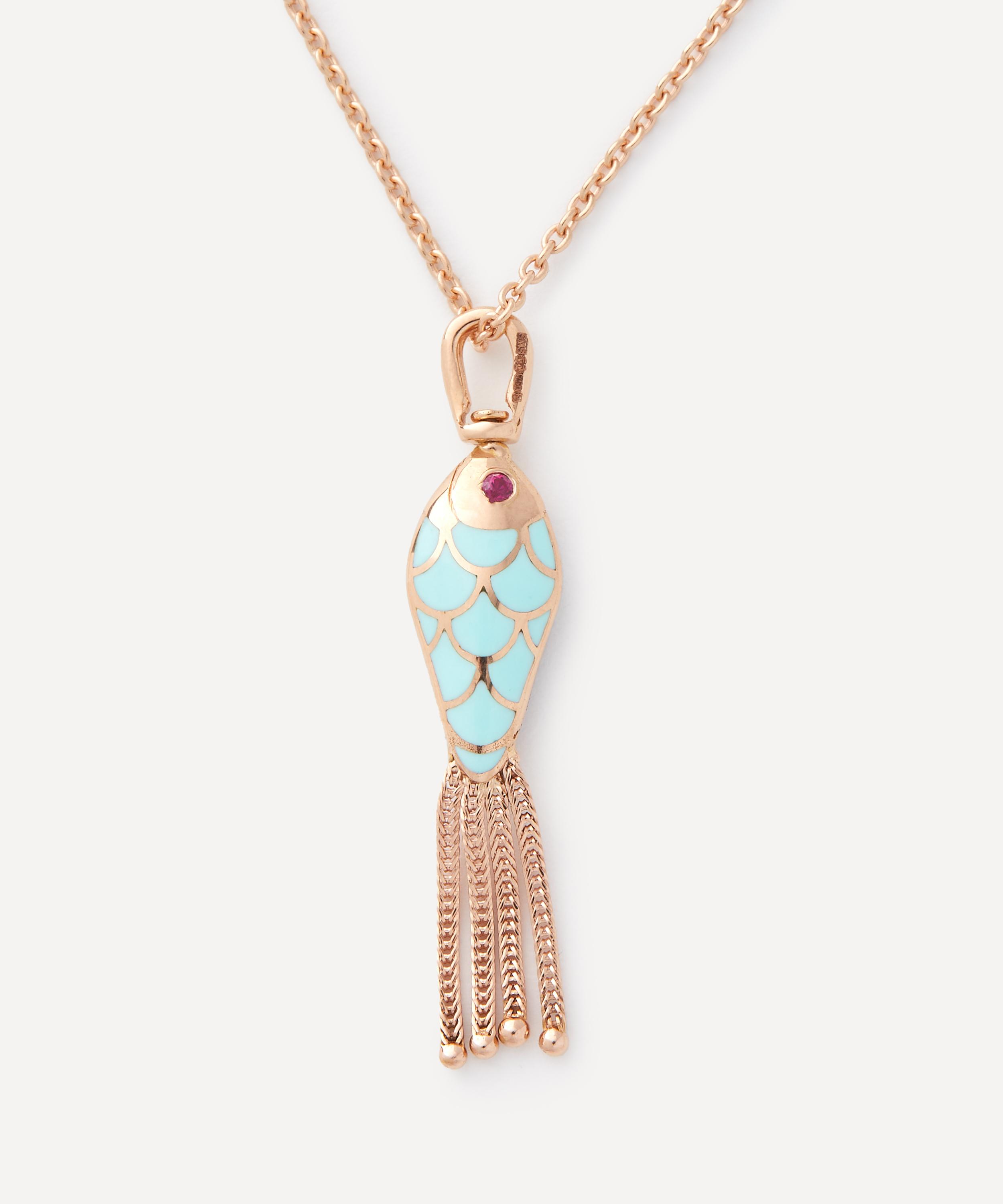 Spring for Selim Mouzannar’s Fish For Love pendant necklace to add a playfully elevating accent to everyday looks or occasion wear. Crafted from 18ct rose gold, it features a fine cable chain and charming fish pendant adorned with chain fringes and a reversible design of diamonds and mint-green enamel scales. Complete with two ruby set eyes, it can be worn solo or layered to create an eye-catching curation of jewels.