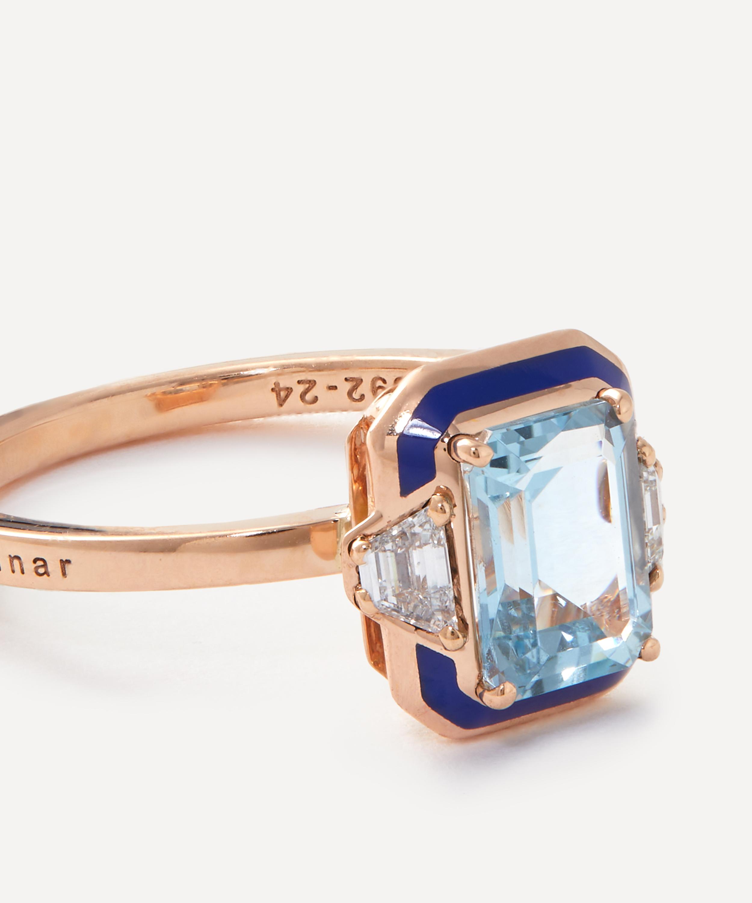 Make your outfit sparkle with spectacular opulence by wearing this aquamarine ring from Selim Mouzannar’s Gemma collection – inspired by the vibrant flora that grows on the walls of houses in Achrafieh, Beirut. Crafted from 18ct rose gold, it features a slim band and an emerald cut aquamarine flanked by two diamonds and surrounded by navy-blue enamel.