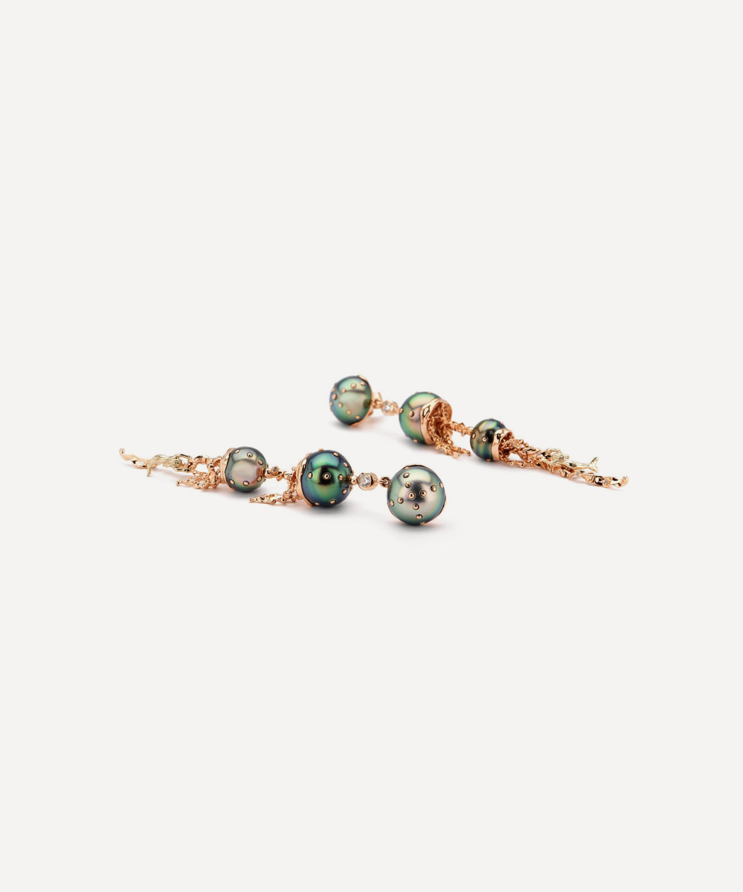 Inspired by the mysteries of the ocean and its secrets hidden beneath the waves, this piece captures the fluid grace of jellyfish drifting through the deep. Featuring an otherworldly dance of movement and mystery, its sculptural silhouette is composed of dark, iridescent Tahitian pearls suspended from a glittering diamond and 18ct rose gold tentacles, reminiscent of the jellyfish’s delicate tendrils. Whether styled in a curated stack, or as a matching pair, wear it as a symbol of your own evolution – untamed, unapologetic, and entirely unique.