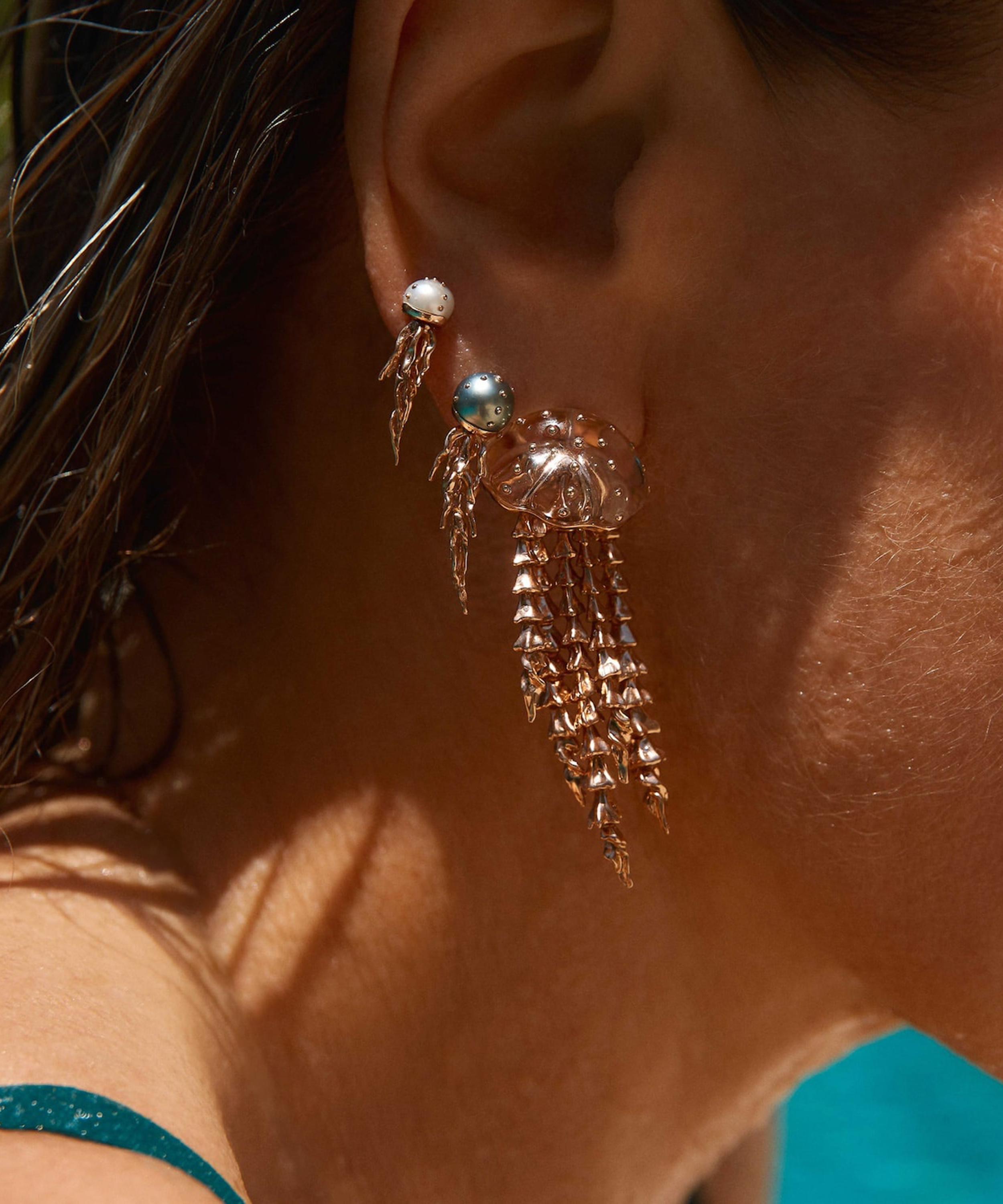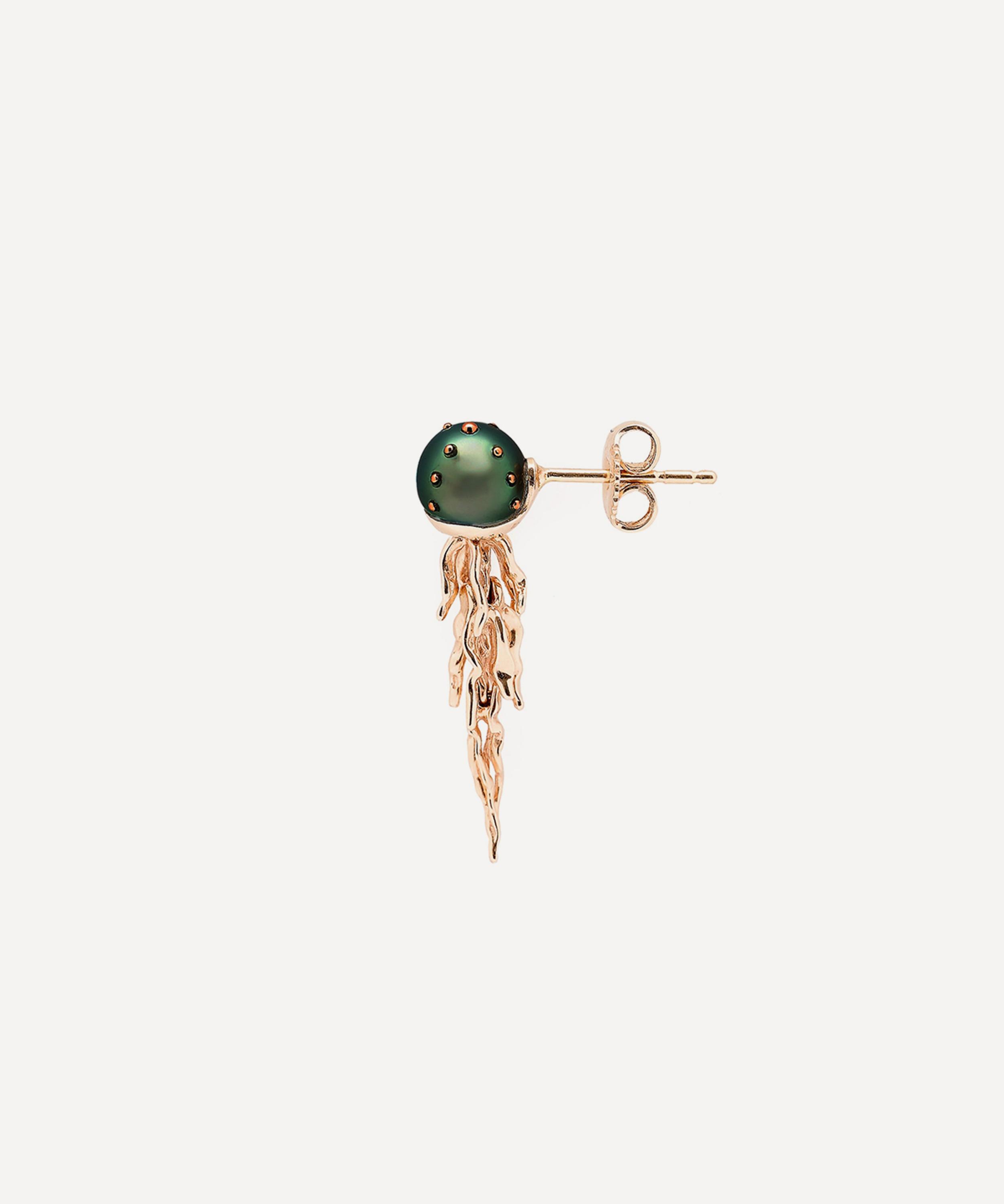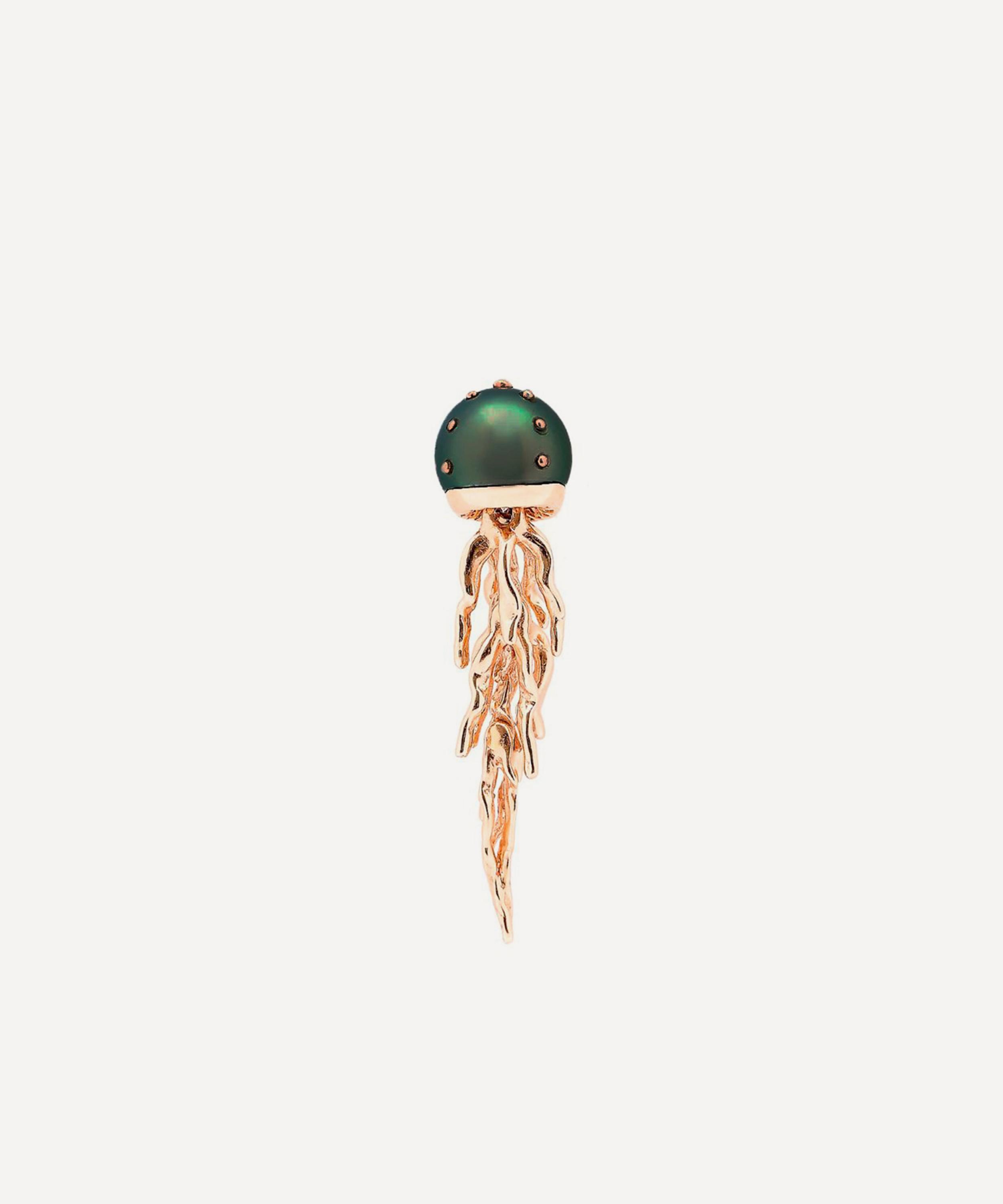 Inspired by the mysteries of the ocean and its secrets hidden beneath the waves, this piece captures the fluid grace of a jellyfish drifting through the deep. Featuring an otherworldly dance of movement and mystery, its sculptural silhouette is composed of a dark, iridescent Tahitian pearl as the jellyfish’s bell, set in 18ct rose gold. Whether styled in a curated stack, or as a matching pair, wear it as a symbol of your own evolution – untamed, unapologetic, and entirely unique.