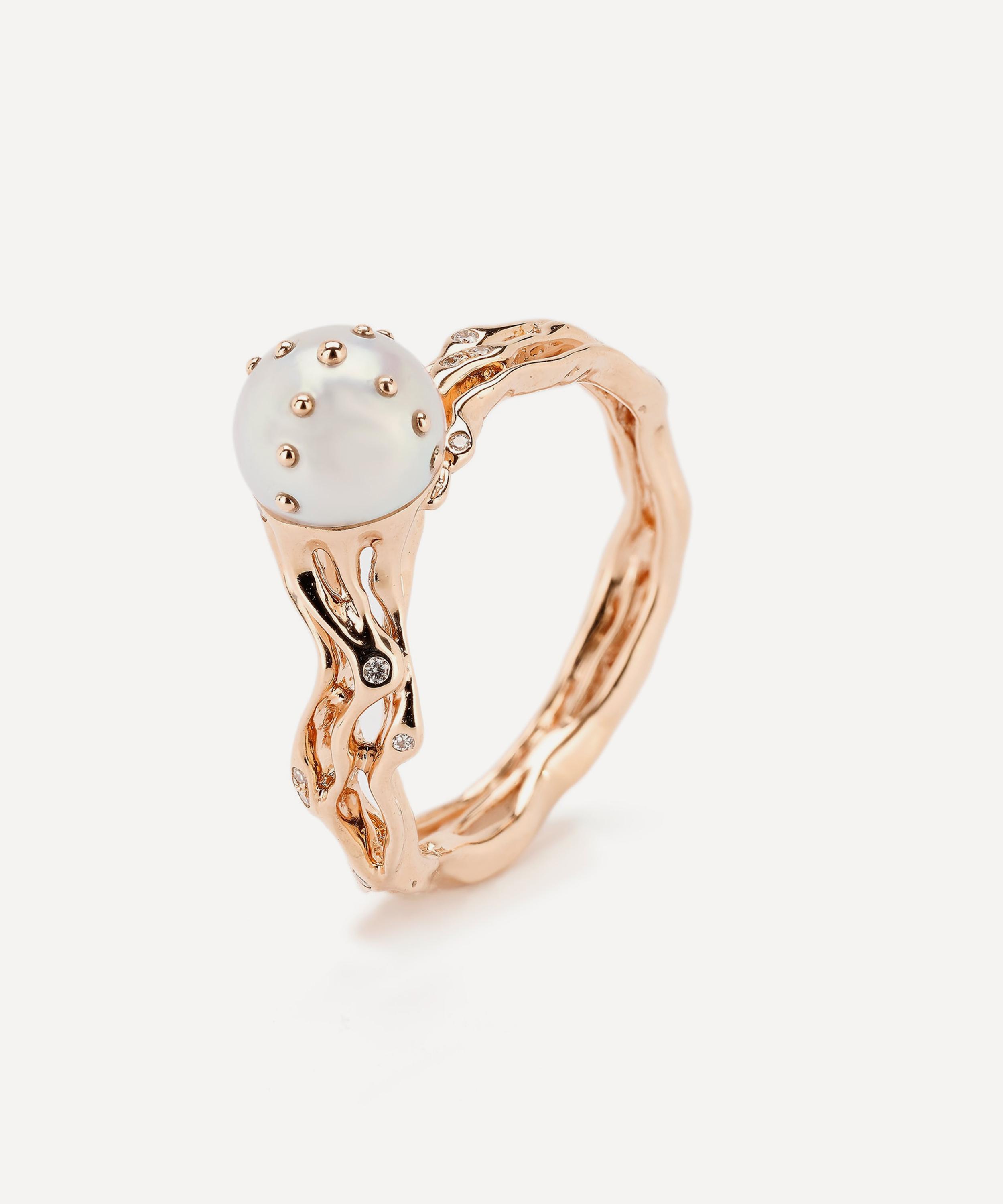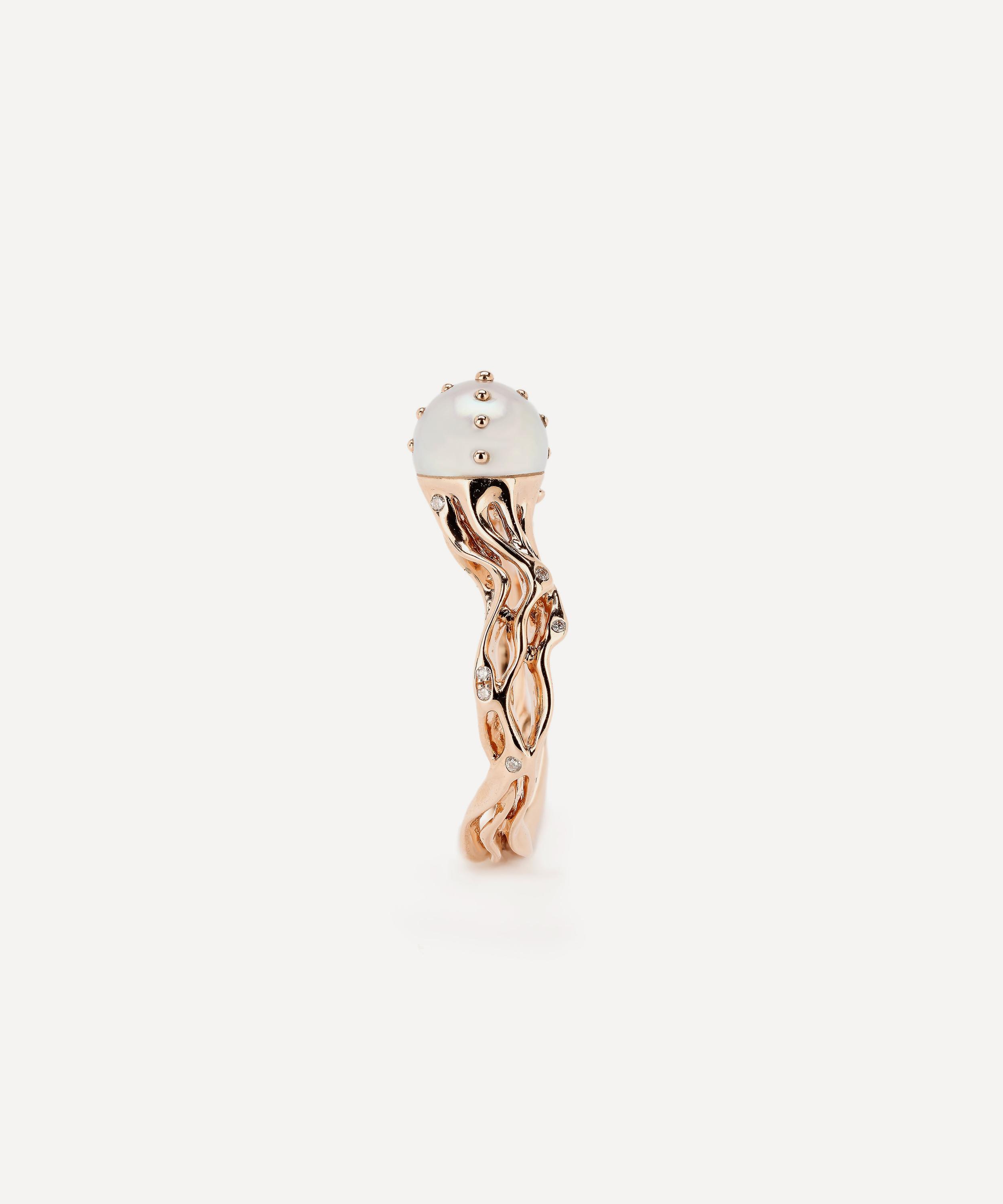 Inspired by the mysteries of the ocean and its secrets hidden beneath the waves, this piece captures the fluid grace of a jellyfish’s tentacles encased in 18ct rose gold. Featuring an otherworldly dance of movement and mystery, its organic silhouette is set with a luminous white pearl and glittering diamonds embedded in the band, reminiscent of the sun’s shimmering rays dancing upon the water’s surface. Whether styled in a curated ring stack, or as a statement piece, wear it as a symbol of your own evolution – untamed, unapologetic, and entirely unique.