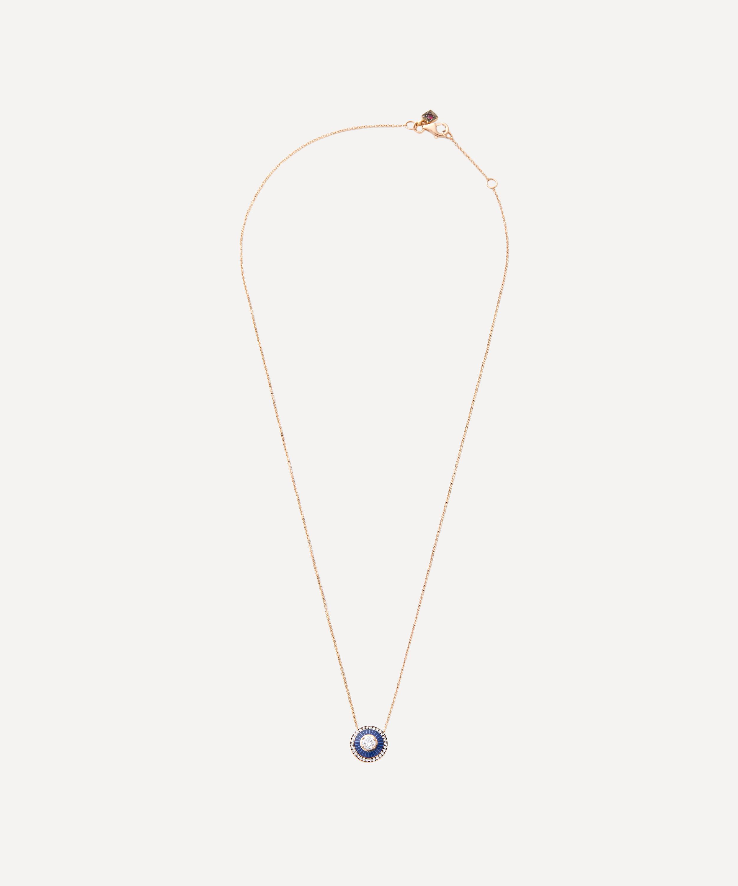 Make your outfit sparkle with spectacular opulence by wearing this pendant necklace from Selim Mouzannar’s Mina collection – an assortment of jewels which celebrates the ancient technique of enamel. Boasting a cable chain in 18ct rose gold, this round-shaped pendant exemplifies the collections playful use of colour by pairing a round, brilliant cut centre diamond with a blue enamel border, and an additional row of diamonds in a pavé setting.