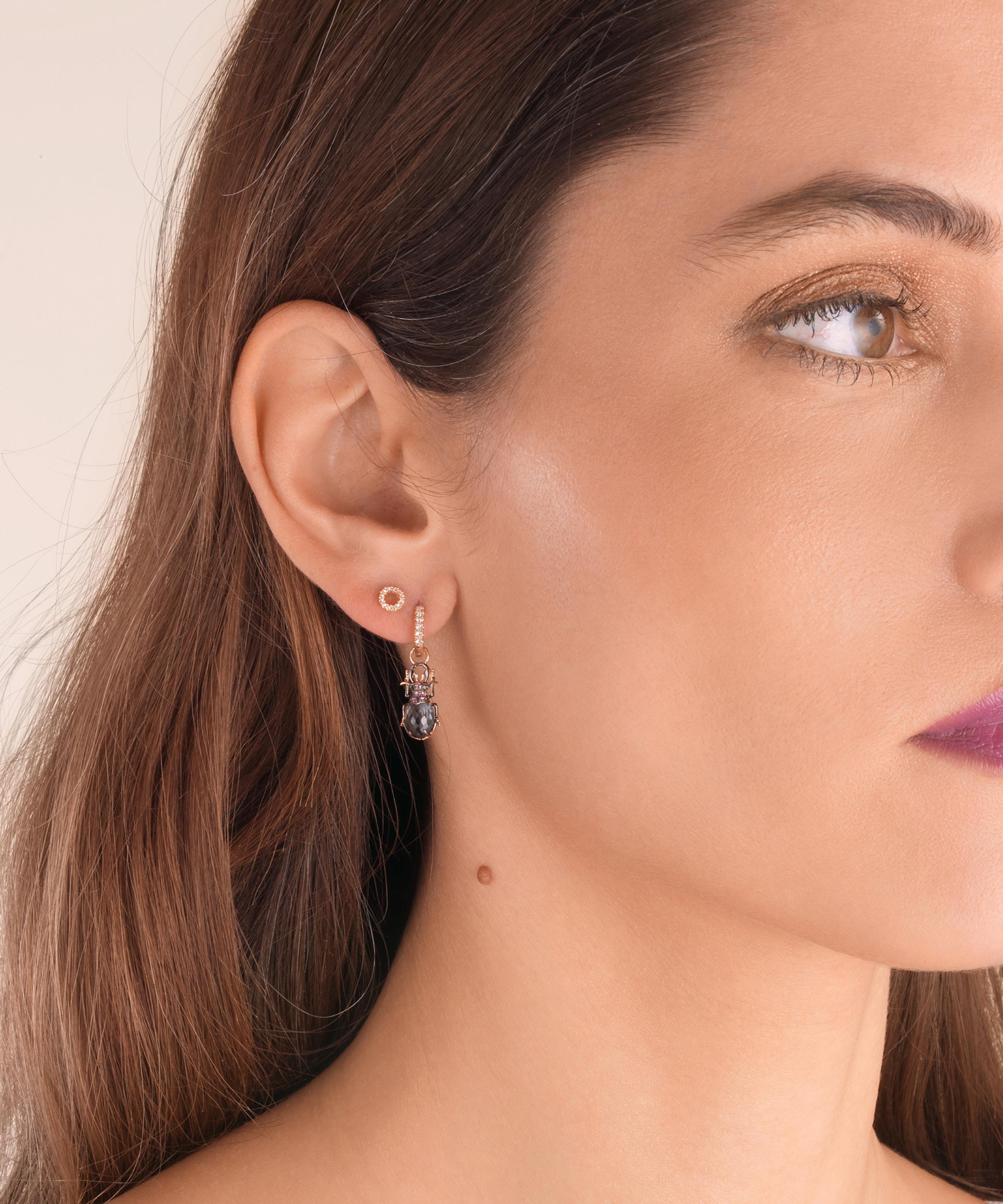 Crafted from high-polished 18 carat rose gold, this single earring drop features a tiny, intricately detailed gemstone beetle. A vibrant faceted blue topaz forms the body, while sparkling amethyst stones and black diamond eyes adorn the creature's head. Finished with touches of black rhodium to bring the design to life, mix and match it with other naturally-inspired drops from the collection for an artful update on classic hoops.