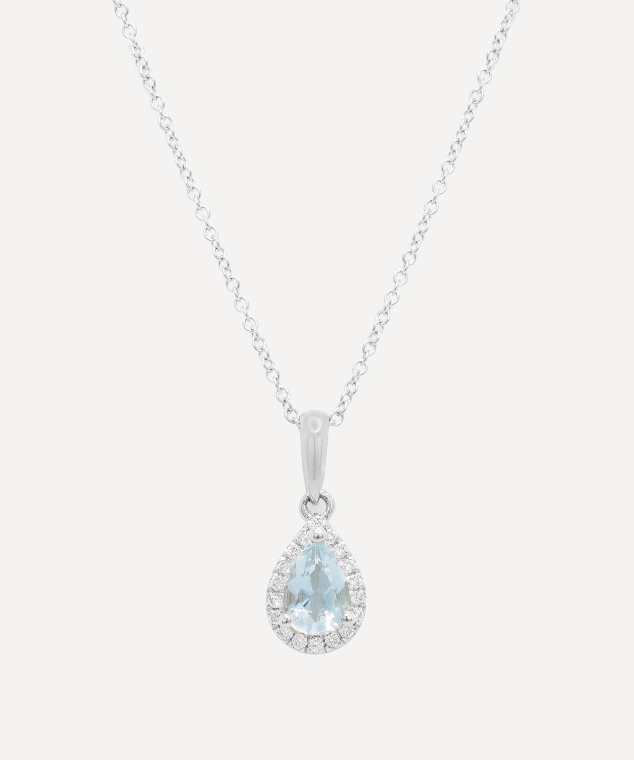 Add a touch of refined luxury and sophistication to any outfit with this show-stopping pendant necklace from antique purveyor Kojis. Crafted from 18ct white gold, it features a pear cut aquamarine embraced by a halo of round brilliant cut diamonds. Suspended from an articulated bail and delicate trace chain, this captivating piece can be styled alone or layered with other chains to create a stack.