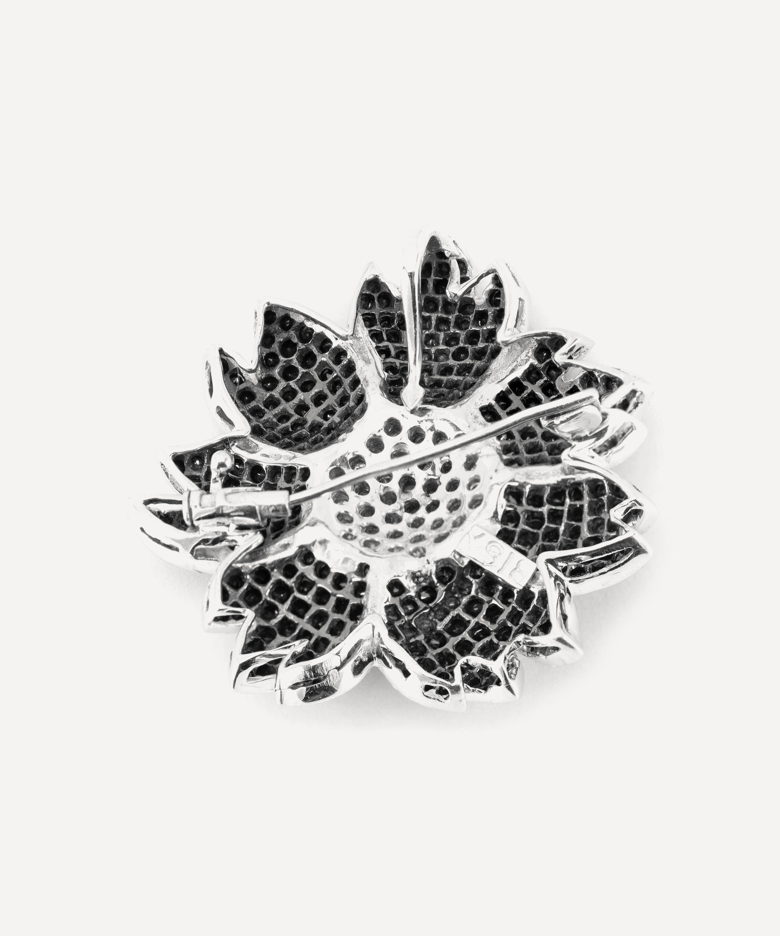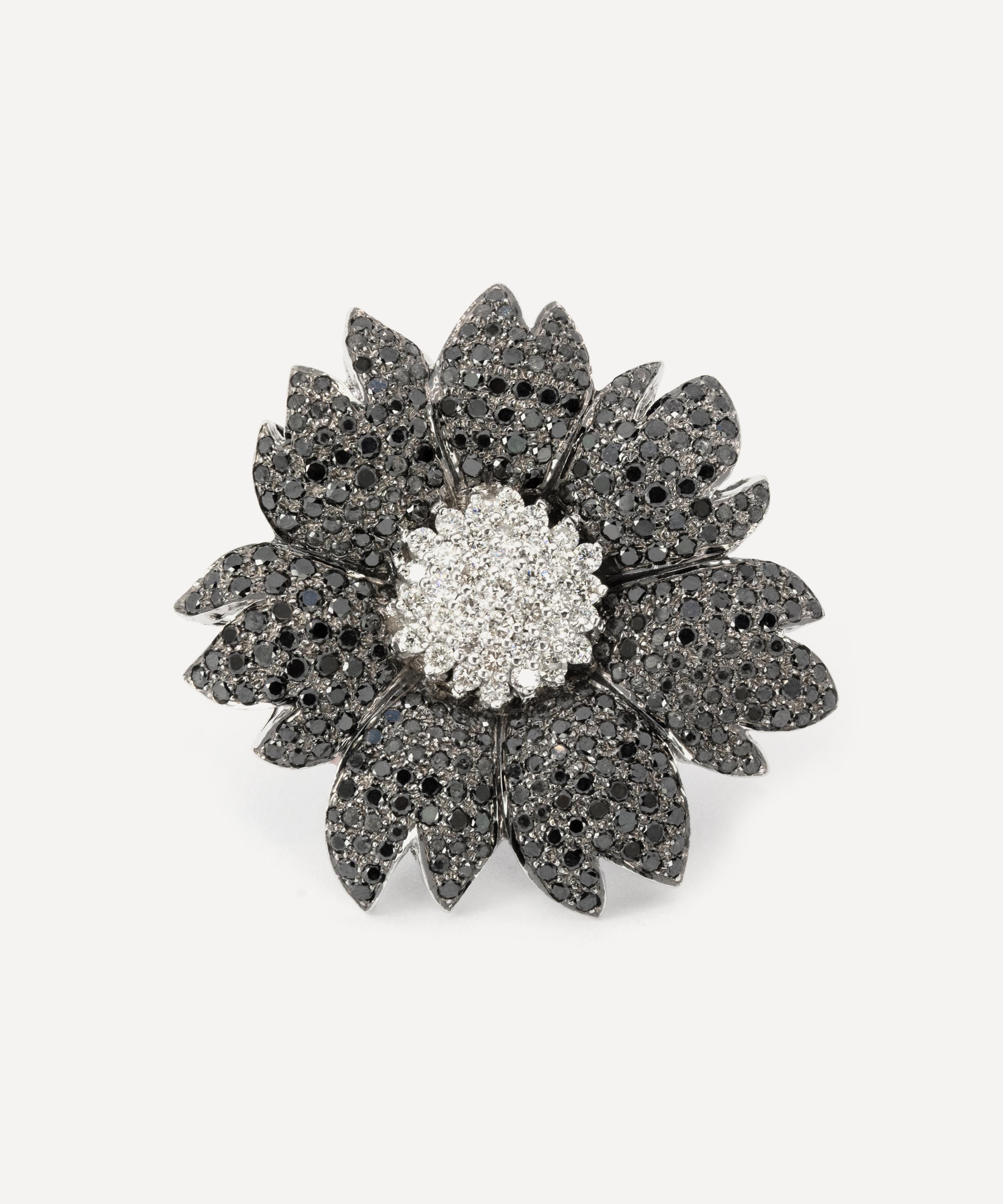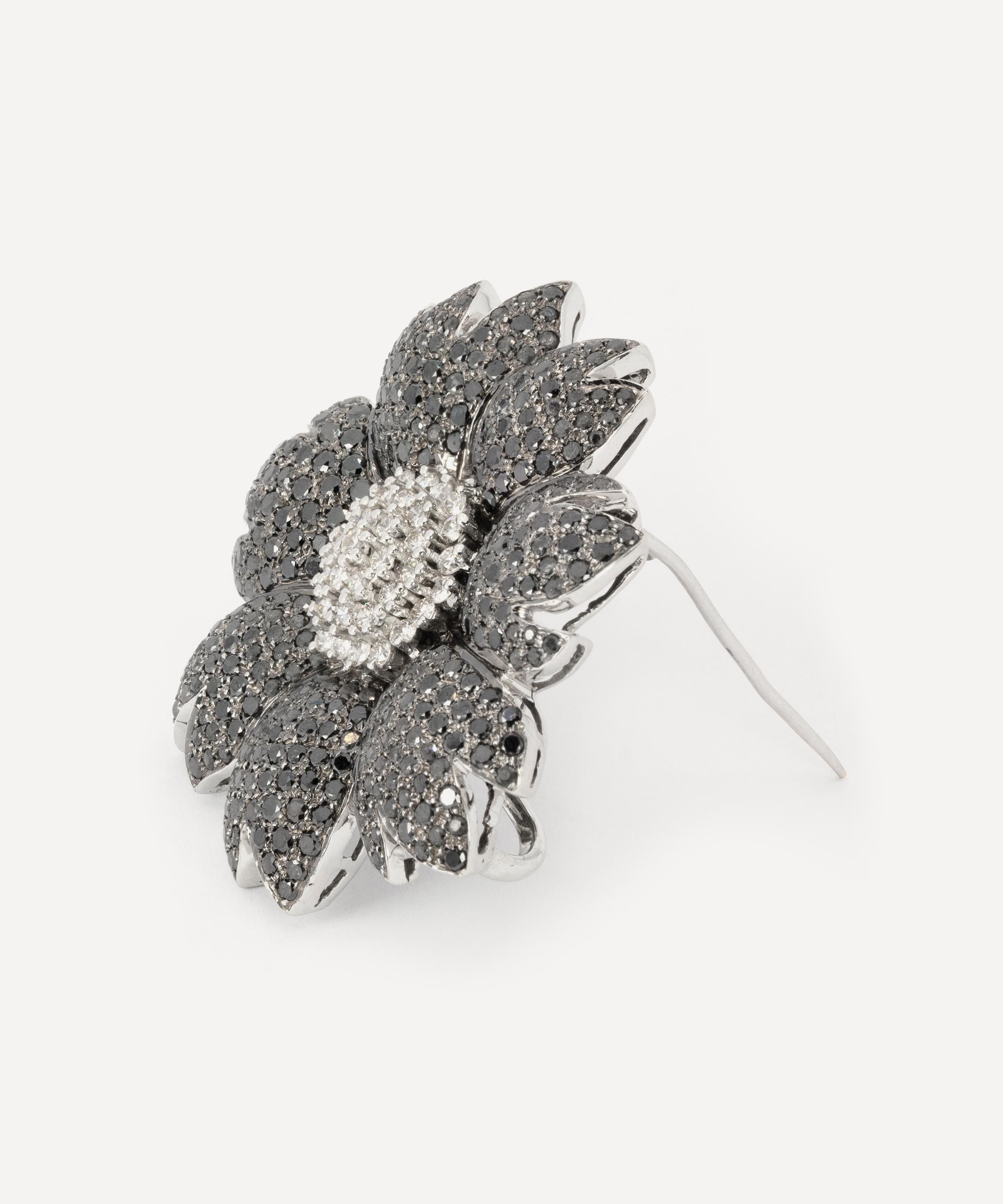 Crafted from solid 18 carat white gold, this brooch features multiple round, brilliant cut black and white diamonds, arranged in a playful flower formation. An elegant example of timeless jewellery, wear it alone to showcase its delightfully novel appeal, or team it with several other playfully designed brooches and pins for a light-hearted take on traditional formalwear.