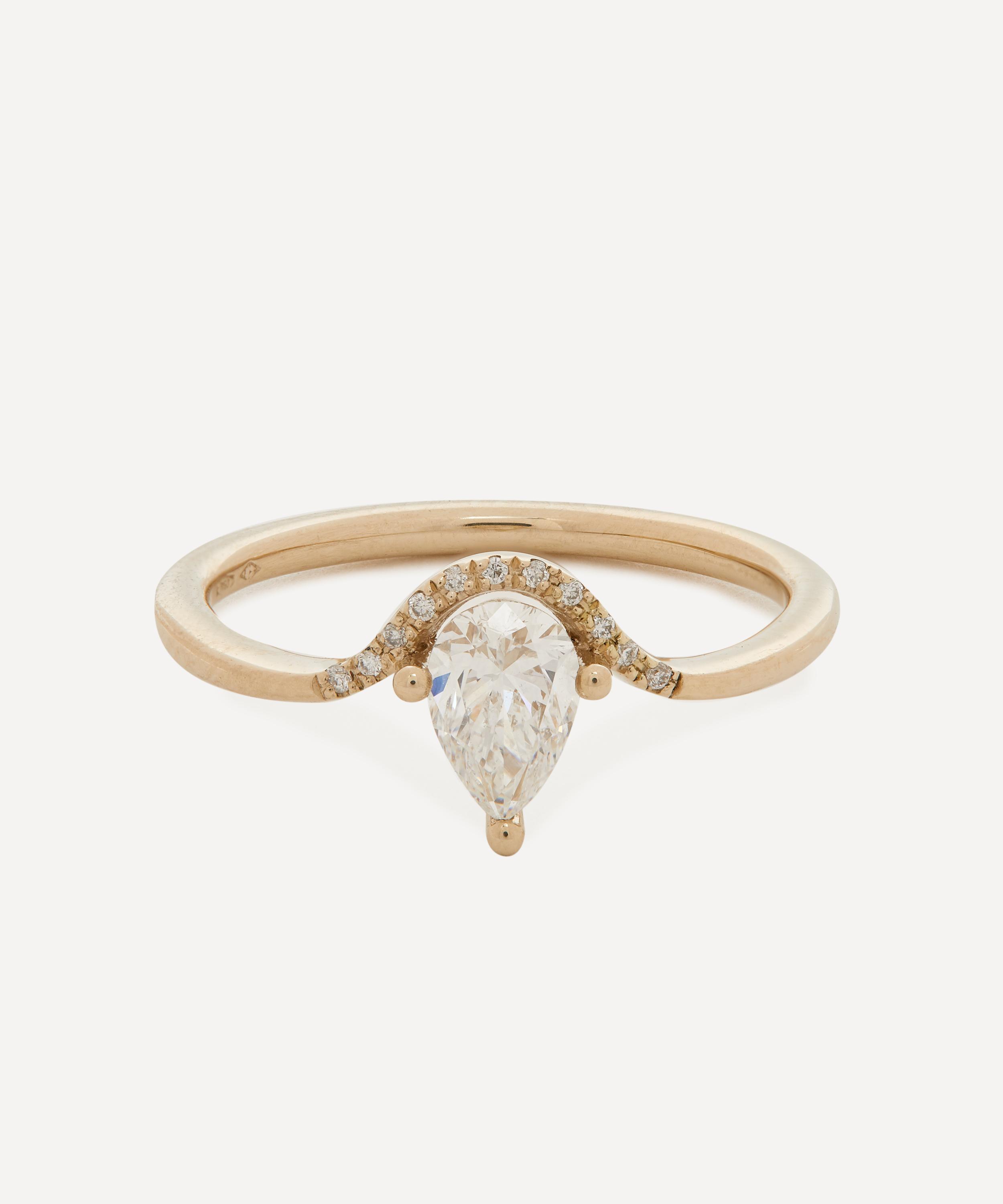 The Floating Pear Cut engagement ring from fine jewellery brand Artemer is crafted from solid 18ct white gold, featuring a pear-cut diamond centre stone, inlaid with a diamond pave of brilliant-cut diamonds curved under its base. Style it solo, stack it with a wedding band or team it with other gem encrusted rings for a glittering curation that’s out of this world.